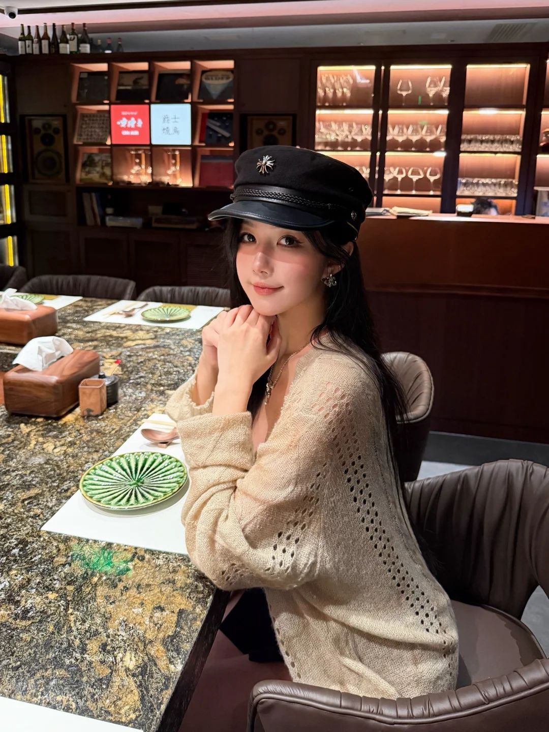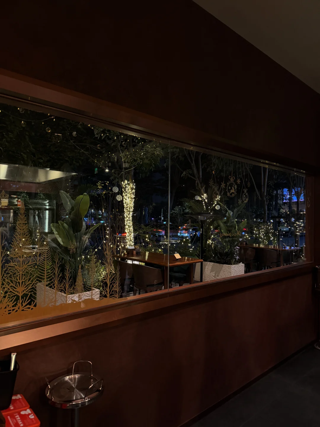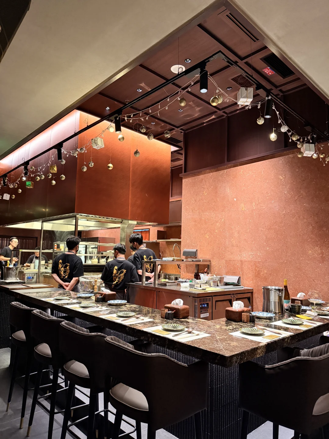 暗调的灯光、原木吧台、开放式厨房