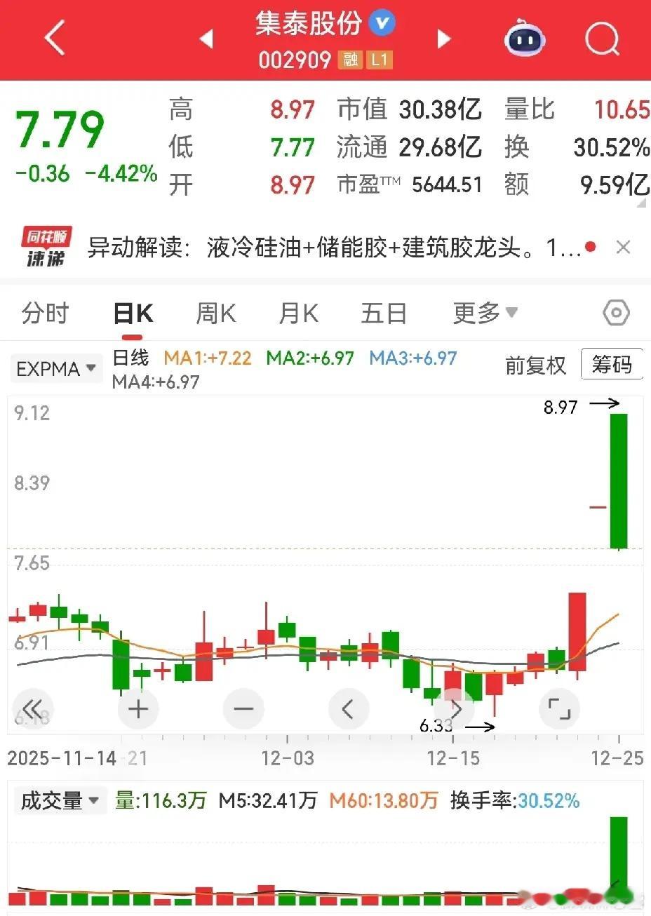 炸板坑人!持股避雷要盯紧这个信号手里的票最怕遇上集泰股份这种走势!上午封板稳稳当当,午后开盘直接跳水,放量砸出大阴棒,30%的换手率看着都揪心,短期想修复估计难了。这种炸板形态近期还挺常见,防不胜防。其实想避雷也有小技巧:没有充分换手的一字板一定要多留个心眼,只有筹码充分交换,该走的走、该留的留,后续走势才能更稳。不然,很容易就上演高台跳水的戏码!