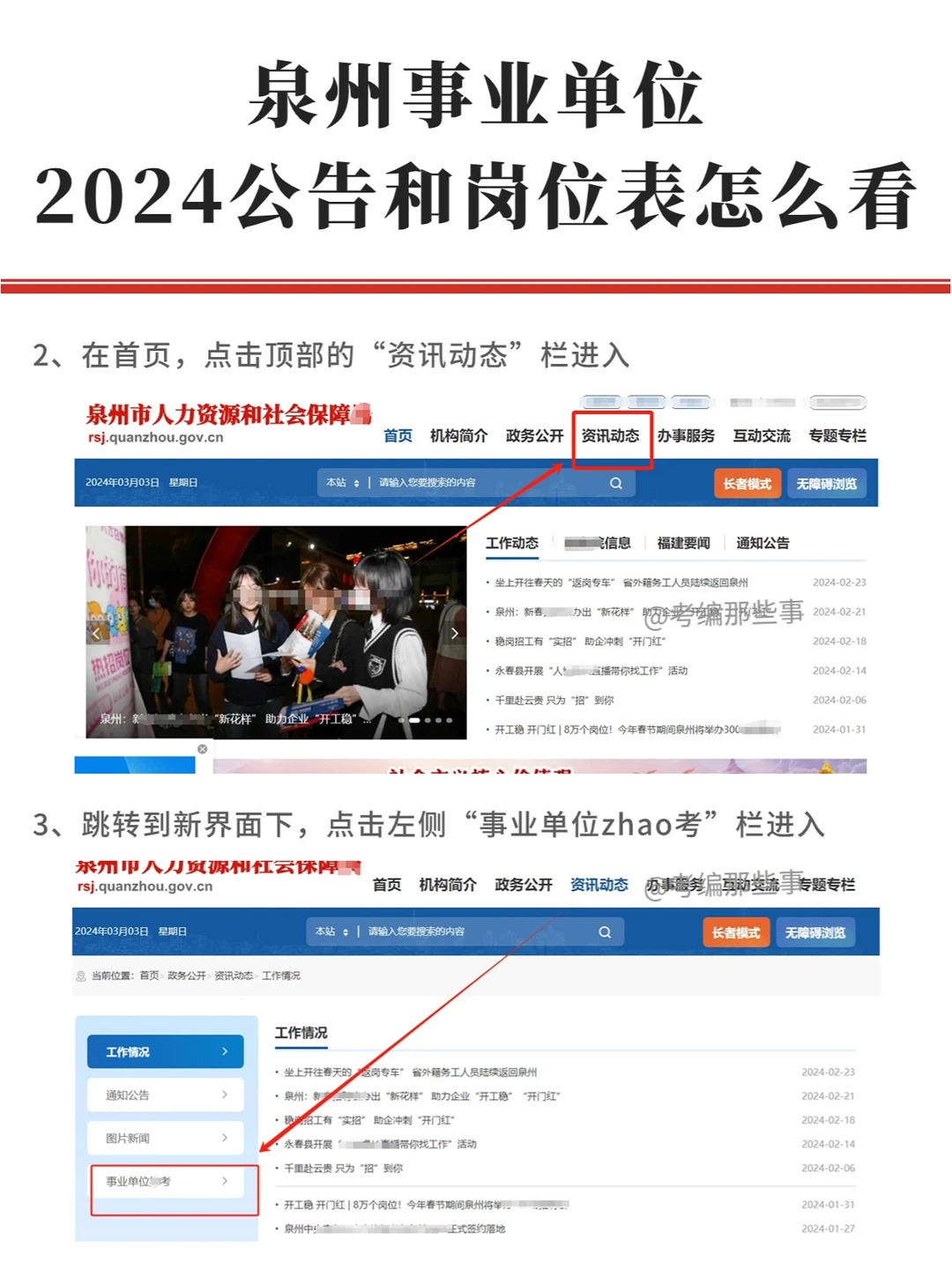 泉州事业单位消息说3月份抱名。4月份考试,往年公告和岗位表都是先在人社发布。当然,官网也会有,只是更新的比较慢 - [哇R]2024泉州事业单位公告和岗位怎么看? 公告发布:泉州人社 抱 名网站:福建省事业单位公开Z P服务平台 1、浏览器搜索“泉州人社”,先找到网站,如图 2、进入网站,点击顶部的“资讯动态”栏进入 3、跳转到新界面下,点击左侧“事业单位zhao考”栏进入 4、泉州事业单位公告一般在这个栏目下面发布 5、岗位表的话,在泉州事业单位公告底部,点击就能下载