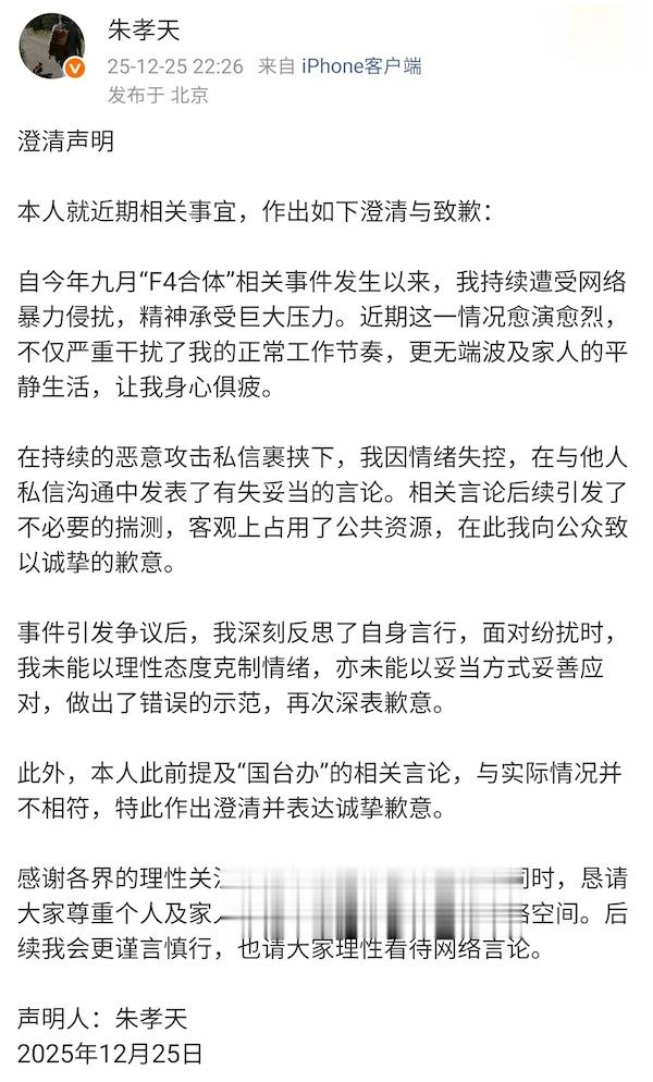 自今年九月“F4合体”相关事件发生以来,我持续遭受网络暴力侵扰,精神承受巨大压力。近期这一情况愈演愈烈,不仅严重干扰了我的正常工作节奏,更无端波及家人的平静生活,让我身心俱疲。