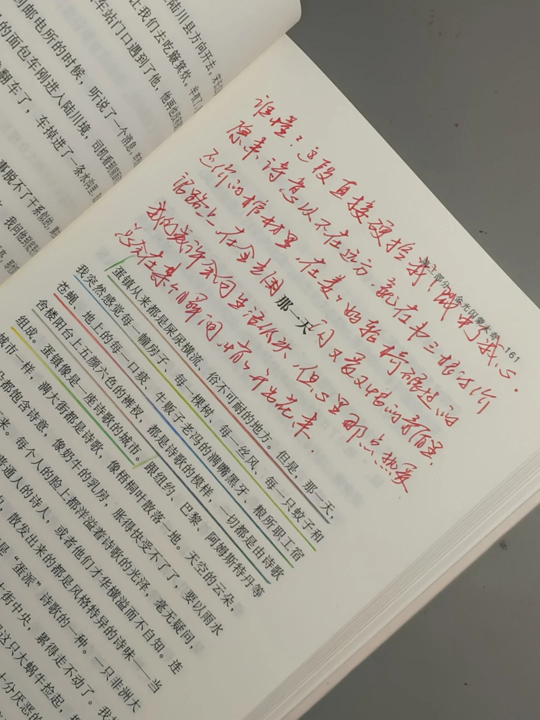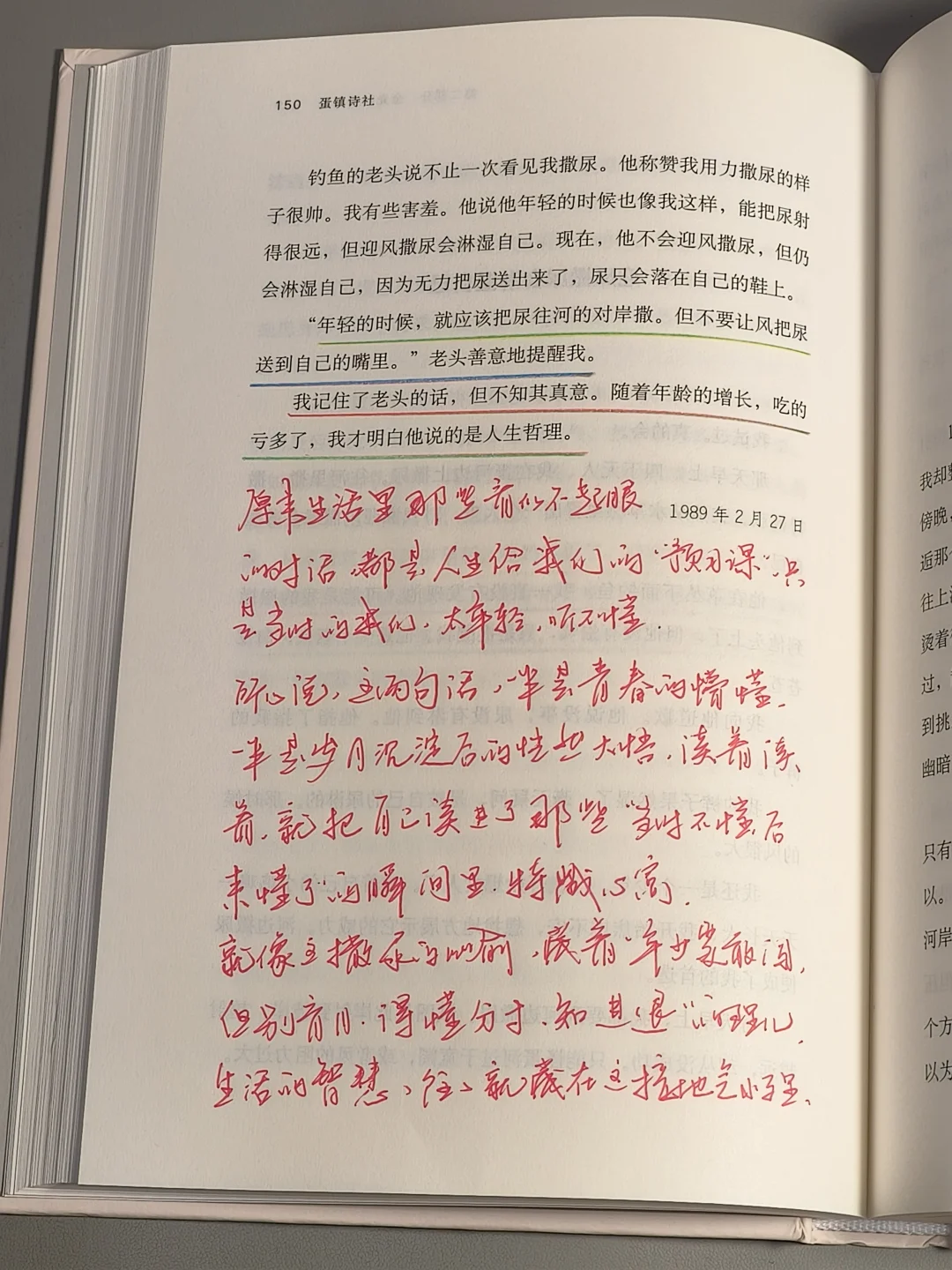 “蛋镇从来都是屎尿横流、俗不可耐的地方。但是,那一天,我突然感觉每一幢房子、每一棵树、每一丝风、每一只蚊子和苍蝇、地上的每一口痰、牛贩子老冯的满嘴黑牙、粮所职工宿舍楼阳台上五颜六色的裤衩,都是诗歌的模样。”