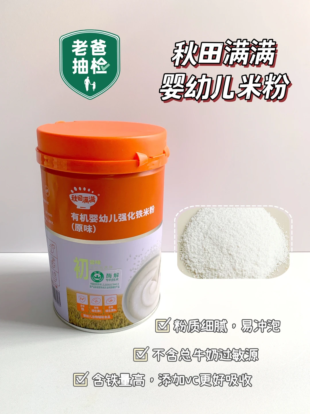 ✔️我用的是秋田满满初阶有机婴幼儿强化铁米粉,铁含量高,满足宝宝日常铁的含量需求,合适做为宝宝第一口米粉,而且通过老爸抽检,配料表干净,粉质细腻,容易冲泡,不起坨。