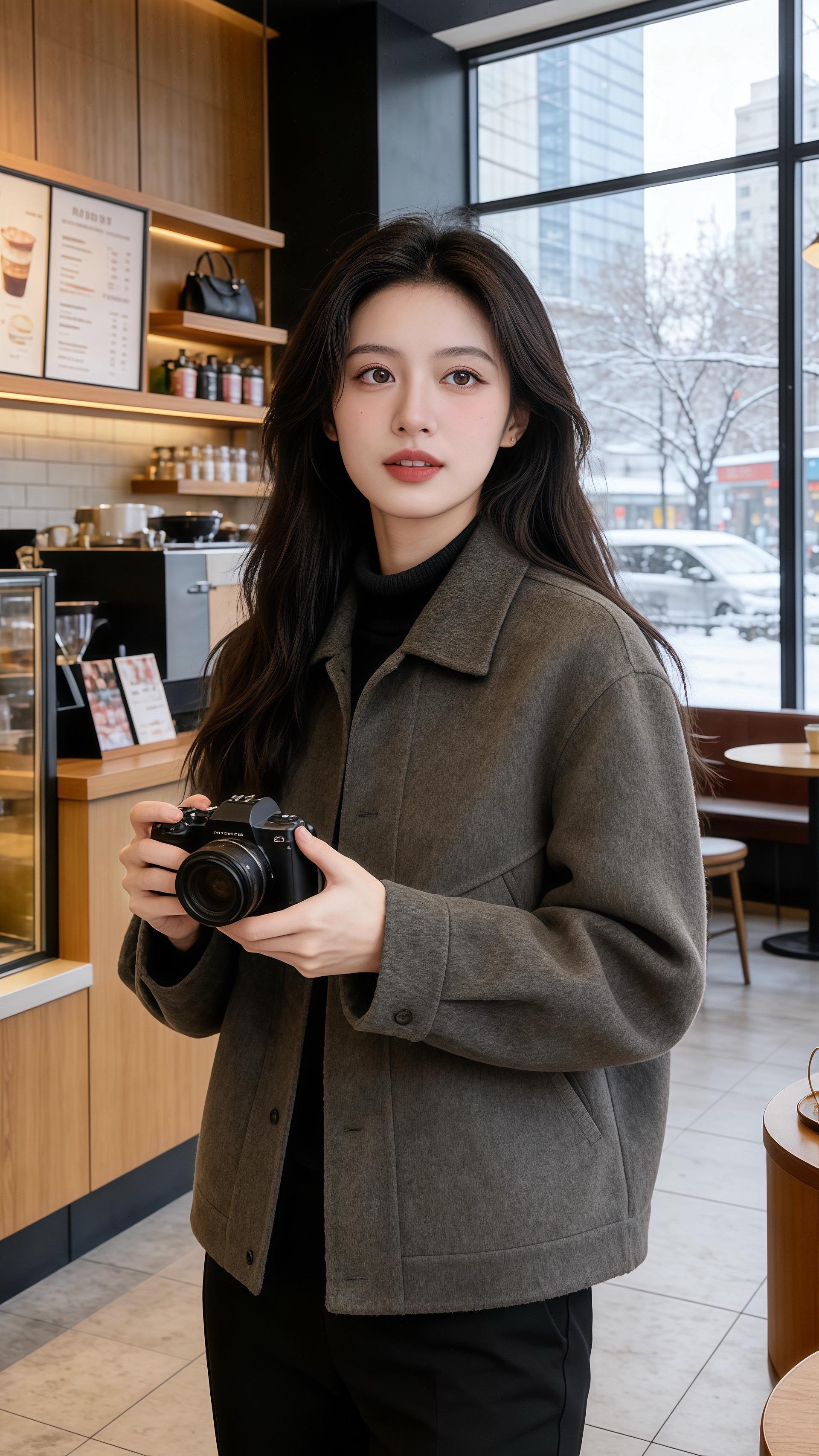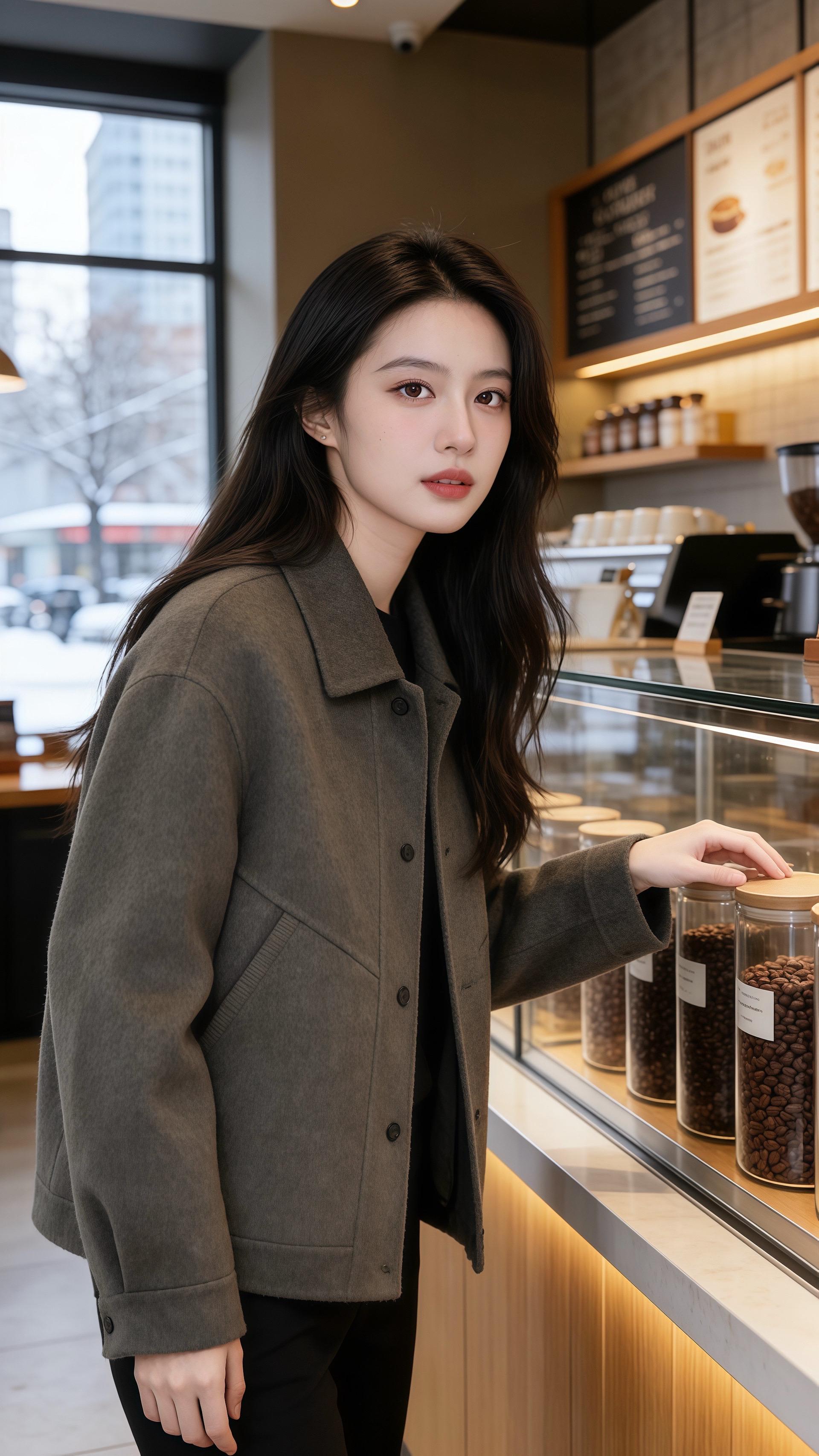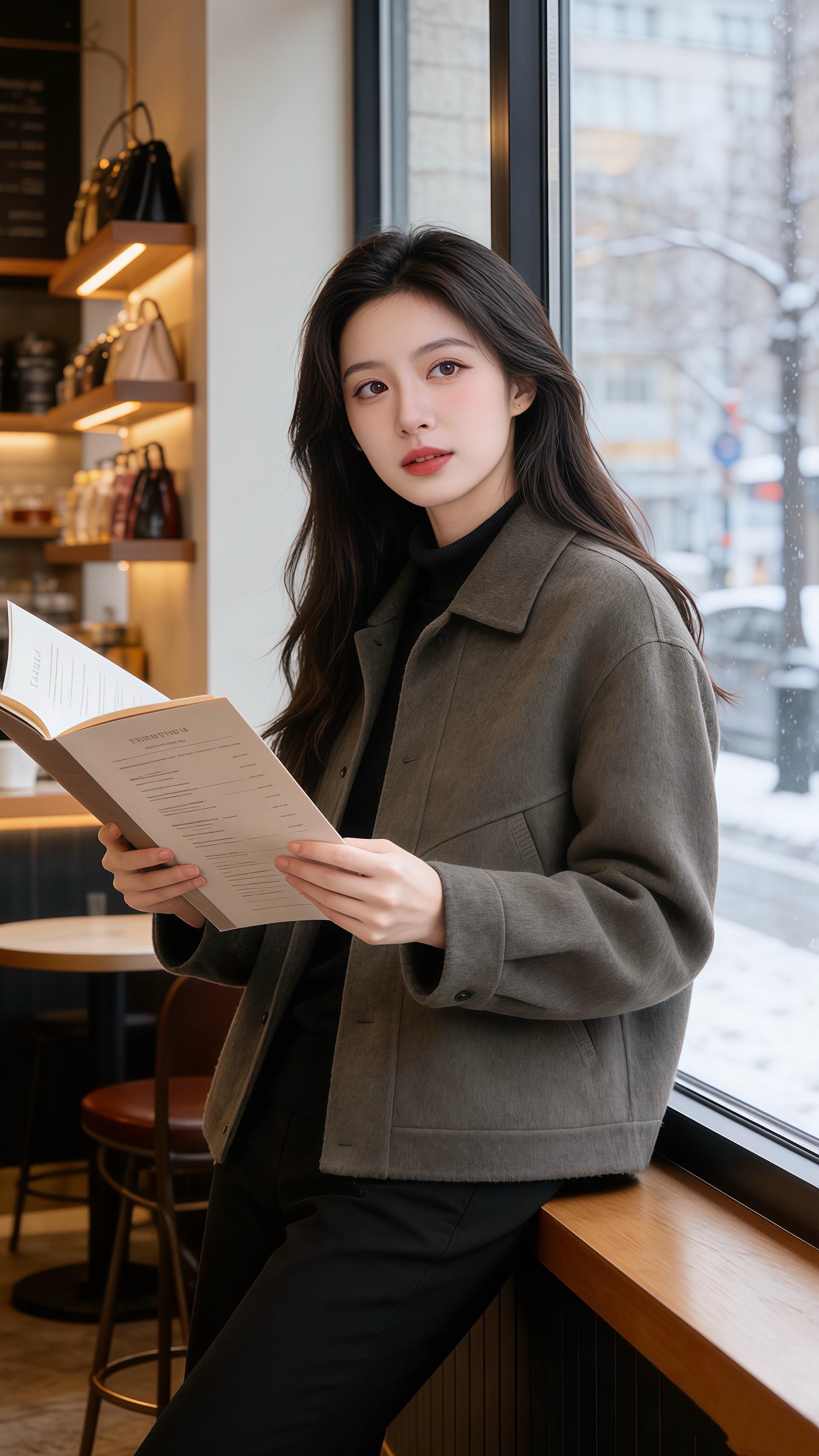 她指尖捏着菜单,另一只手轻碰咖啡豆罐时,外套袖口的弧度贴在腕骨,比橱窗里的成衣更显妥帖。后来他说,那天她举着相机对着窗外雪景对焦,毛呢面料蹭过发梢的样子,像把冬阳的暖都收进了衣摆——不是衣装多考究,是她把简约的灰黑配穿得松弛又有故事感。
