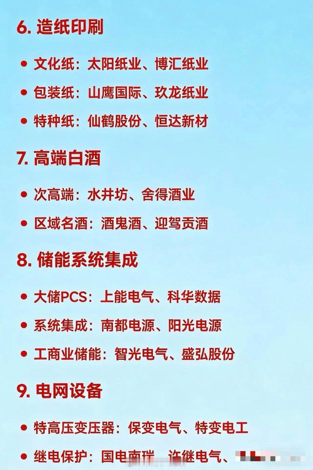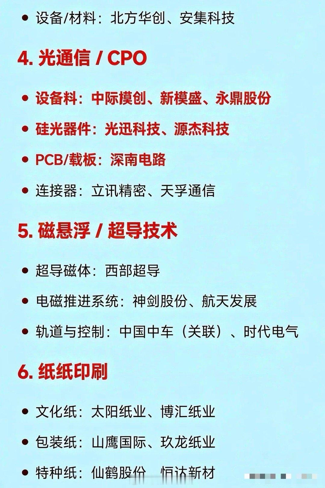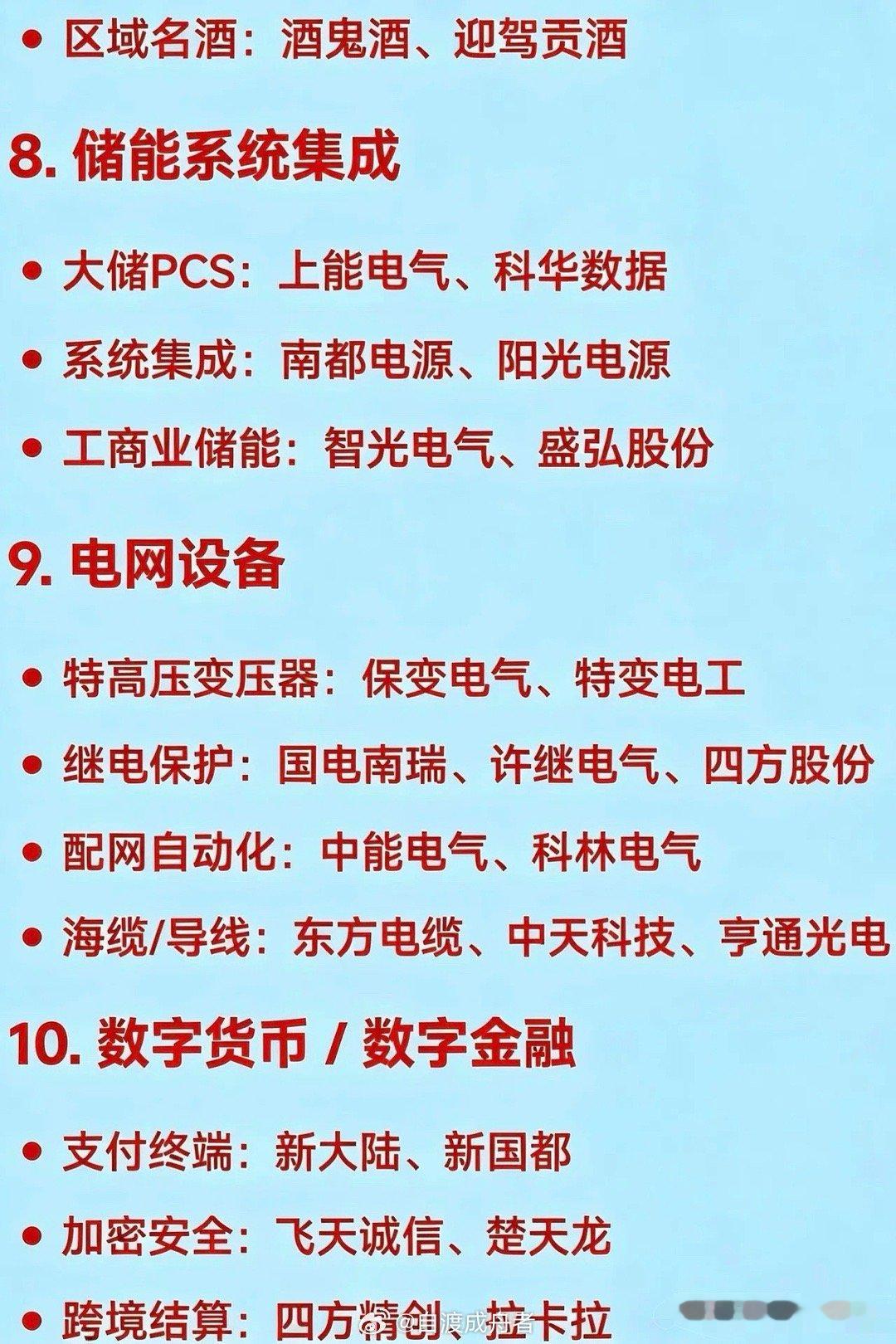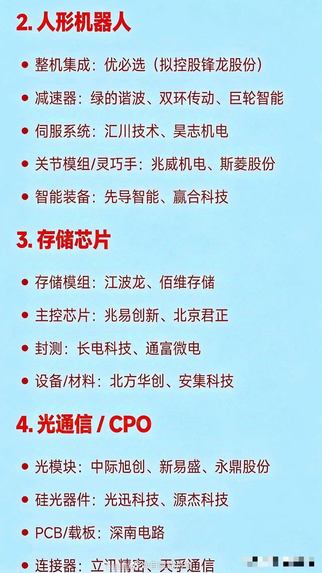 【12月25日十大热点概念及产业链龙头梳理】1. 商业航天卫星制造:中国卫星(核心龙头,覆盖卫星研发制造全链条)火箭总装:中天火箭(小型运载火箭主力)、航天电子(箭上设备核心供应商)结构件/材料:超捷股份(精密结构件)、广联航空(航空航天结构件)、博云新材(炭/炭复合材料)、派克新材(环形锻件)航天电子:天奥电子(时间频率系统)、华菱线缆(特种航天电缆)、龙溪股份(轴承关键部件)空间电源:上海港湾(特种工程配套,含航天基地建设)卫星通信载荷:通宇通讯(卫星通信天线核心标的)2. 人形机器人整机集成:优必选(拟控股锋龙股份,人形机器人整机研发领先)减速器:绿的谐波(谐波减速器龙头)、双环传动(RV减速器量产突破)、巨轮智能(减速器国产化先锋)伺服系统:汇川技术(工业伺服龙头,机器人领域快速渗透)、昊志机电(精密伺服部件)关节模组/灵巧手:兆威机电(微型传动模组)、斯菱股份(机器人关节轴承)智能装备:先导智能(机器人产线设备)、赢合科技(自动化集成)3. 存储芯片存储模组:江波龙(存储模组多元化布局)、佰维存储(消费级存储龙头)主控芯片:兆易创新(NOR Flash领军)、北京君正(存储控制芯片)封测:长电科技(全球封测前三)、通富微电(存储封测主力)设备/材料:北方华创(刻蚀/薄膜沉积设备)、安集科技(抛光液核心供应商)4. 光通信/CPO光模块:中际旭创(全球光模块龙头)、新易盛(高速光模块主力)、永鼎股份(光通信+海缆双轮驱动)硅光器件:光迅科技(硅光芯片领先)、源杰科技(激光芯片核心)PCB/载板:深南电路(高多层PCB龙头)连接器:立讯精密(高速连接器)、天孚通信(光无源器件)5. 磁悬浮/超导技术超导磁体:西部超导(超导材料核心)电磁推进系统:神剑股份(电磁弹射部件)、航天发展(电磁技术应用)轨道与控制:中国中车(磁悬浮列车整车)、时代电气(磁悬浮控制系统)6. 造纸印刷文化纸:太阳纸业(林浆纸一体化)、博汇纸业(文化纸龙头)包装纸:山鹰国际(包装纸+回收体系)、玖龙纸业(全球包装纸巨头)特种纸:仙鹤股份(特种纸全品类)、恒达新材(高端特种纸基材)7. 高端白酒次高端:水井坊(川酒次高端代表)、舍得酒业(老酒概念龙头)区域名酒:酒鬼酒(馥郁香型特色)、迎驾贡酒(江淮区域龙头)8. 储能系统集成大储PCS:上能电气(大功率储能变流器)、科华数据(光储充一体化)系统集成:南都电源(储能全产业链)、阳光电源(全球储能龙头)工商业储能:智光电气(工商业储能解决方案)、盛弘股份(储能变流器)9. 电网设备特高压变压器:保变电气(特高压变压器龙头)、特变电工(输变电全产业链)继电保护:国电南瑞(电网自动化领军)、许继电气(继电保护核心)、四方股份(智能电网主力)配网自动化:中能电气(配网设备)、科林电气(智能配网解决方案)海缆/导线:东方电缆(海底电缆龙头)、中天科技(海缆+光通信)、亨通光电(全球海缆主力)10. 数字货币/数字金融支付终端:新大陆(支付设备龙头)、新国都(金融终端解决方案)加密安全:飞天诚信(数字货币安全芯片)、楚天龙(智能卡+数字人民币)跨境结算:四方精创(区块链跨境支付)、拉卡拉(数字人民币受理终端)