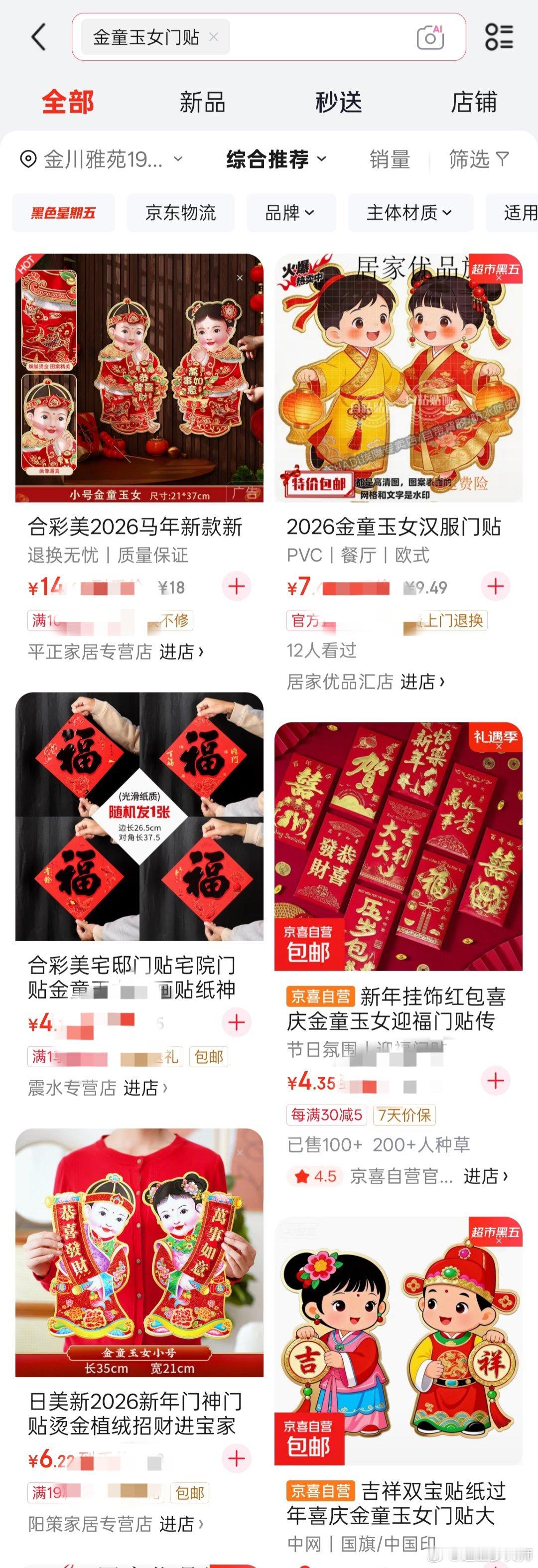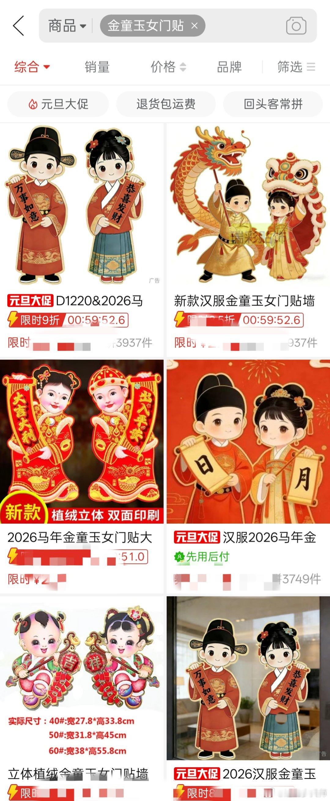 搜了下新年金童玉女门贴。结果见图1,图2,图3。为御三家的默认搜索结果,之前没有搜过。图2是最下沉的平台,首页除了一个之外,全是汉服的贴纸。大家觉得这意味着什么呢?或者大家也可以看看这个⬇️⬇️⬇️马年2026年新款窗花静电贴新春过年春节装饰用品橱窗玻璃新年门贴马年2026年新款窗花静电贴新春过年春节装饰用品橱窗玻璃新年门贴