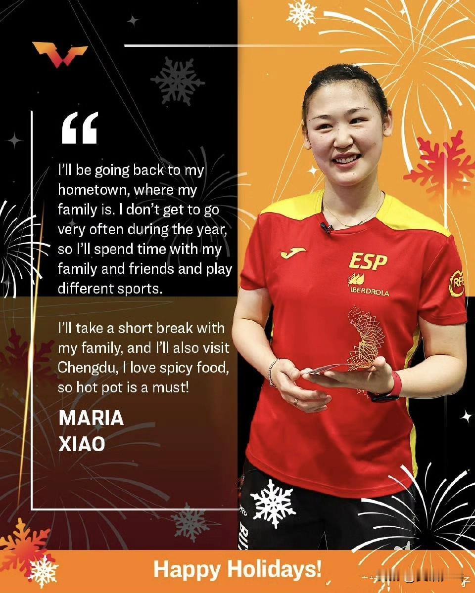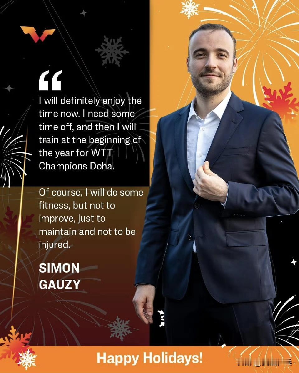 WTT:WTT全体成员祝大家节日快乐🌟🎄球星们又有哪些假期安排呢? 王艺迪:“这个月,我会继续训练,保持当前的竞技状态。不过,无论是身体上还是心理上,我们都需要做出一些调整。” 特鲁斯·莫雷加德:“我肯定会找些好法子,和朋友、家人还有女友一起好好庆祝节日。我已经有了几个计划,要是能一一实现,这个休赛期一定会特别棒。 西蒙·高茨:“我现在肯定要好好享受这段时光。我需要一些休息时间,然后在年初为多哈世界乒乓球职业大联盟冠军赛进行训练。当然,我会做一些体能训练,但不是为了提升水平,只是为了保持状态、避免受伤。” 奇塔莱:“一年里我们大部分时间都漂泊在外,所以能回家和家人共度时光会特别美好。身在异乡时,我们总会想念家乡菜,所以回去尝尝家常菜是我特别期待的事。” 肖瑶茜:“我会回到家乡和家人团聚。一年里我很少有机会回去,所以会好好陪陪家人朋友,还会尝试不同的运动。我会和家人短暂休整一下,也会去成都看看。我爱吃辣,火锅是必不可少的!” 罗布勒斯:“我们的假期会非常短暂,因为圣诞节一过,我们就要立刻奔赴卡塔尔参赛了。所以我们会试着稍作休息,然后马上重新投入备战。” 2025.12.25