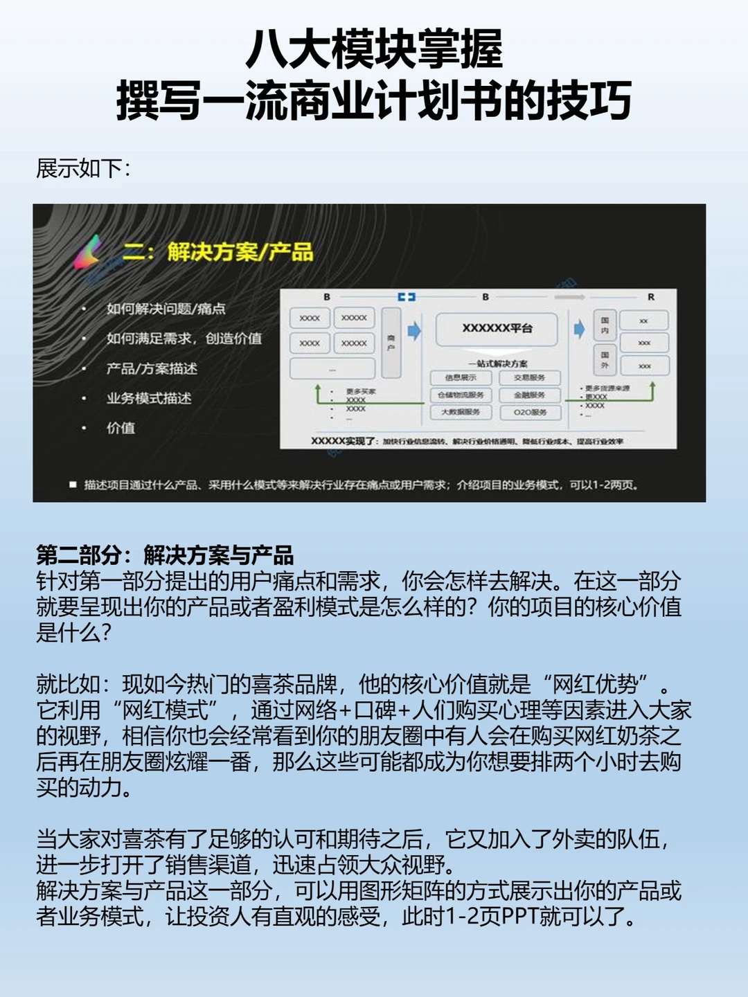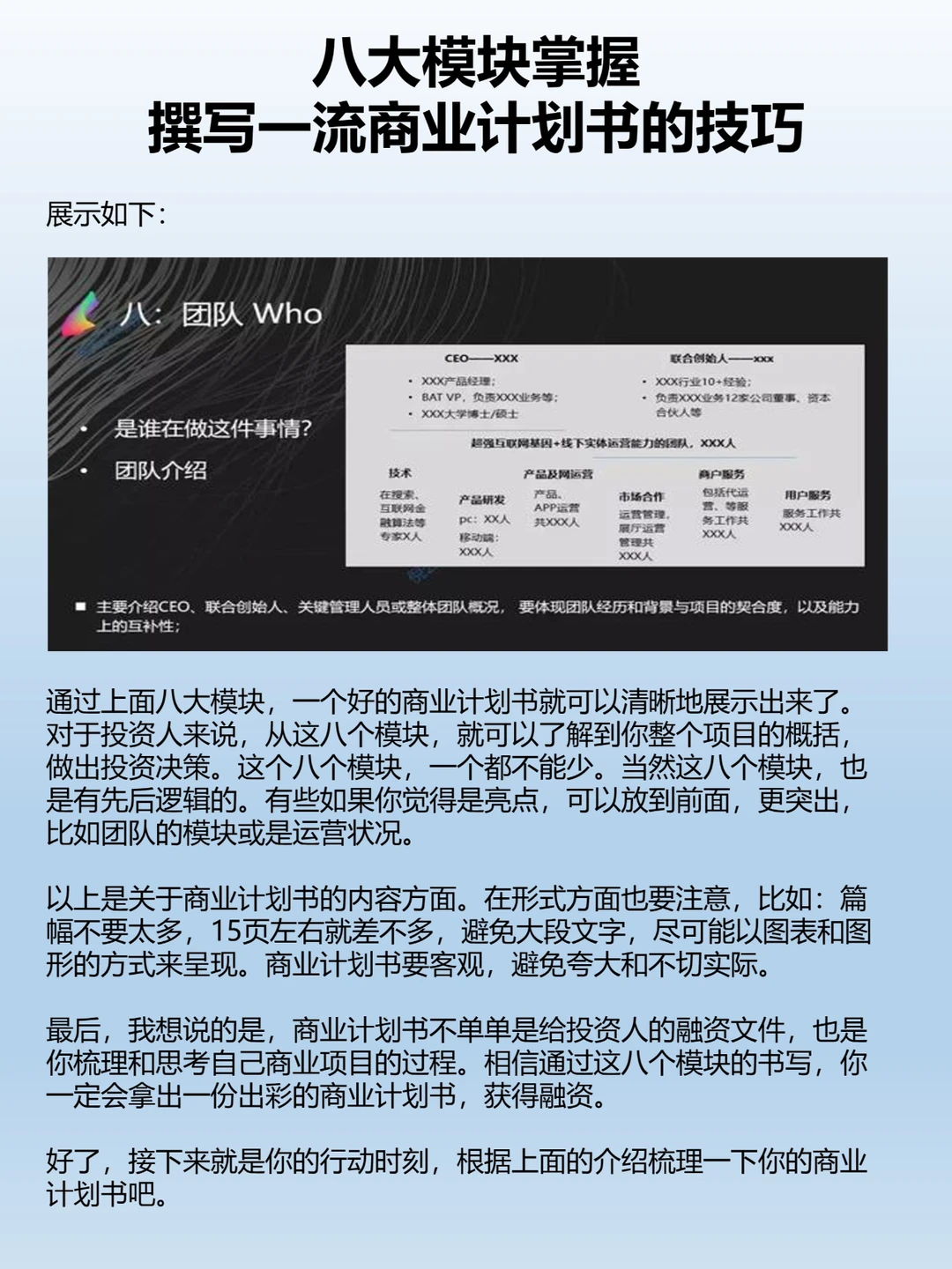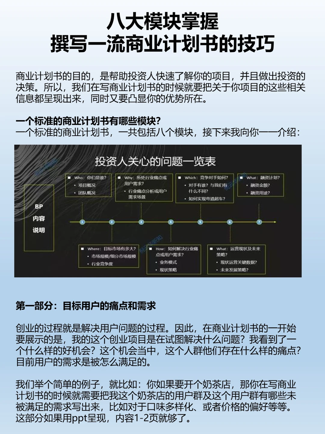一个标准的商业计划书,一共包括八个模块,接下来我向你一一介绍: