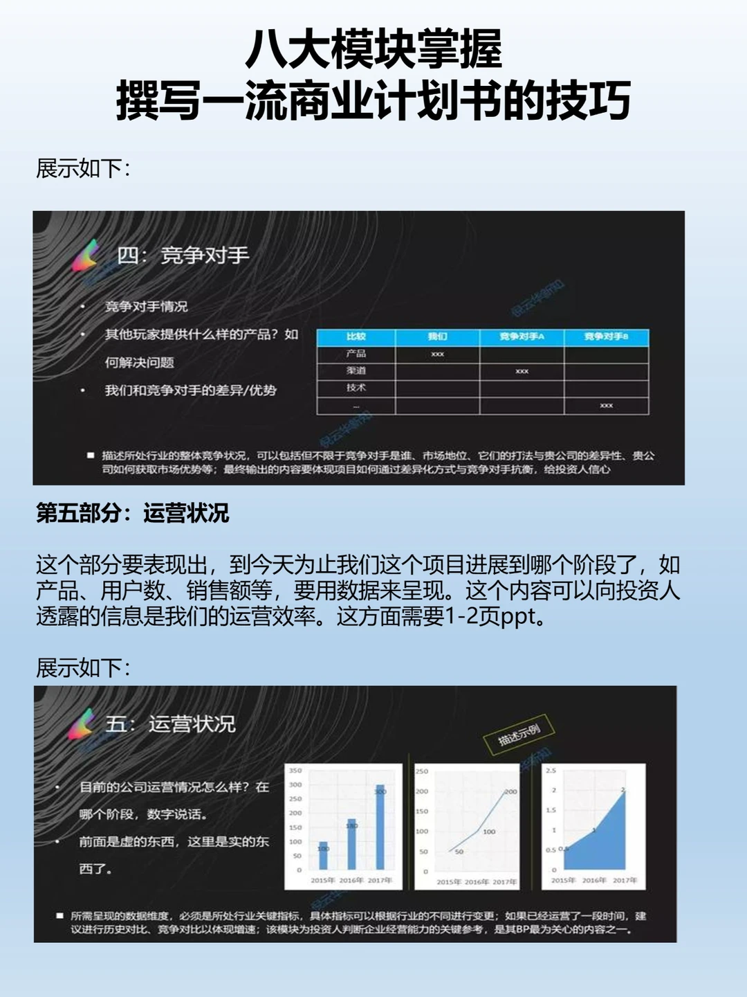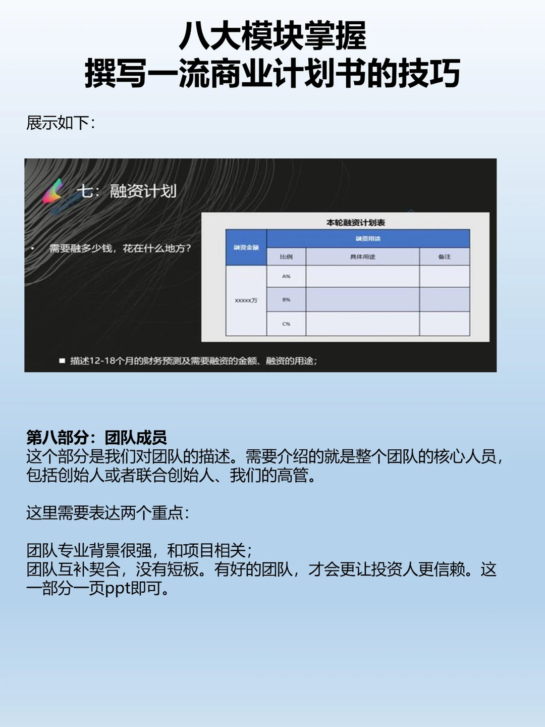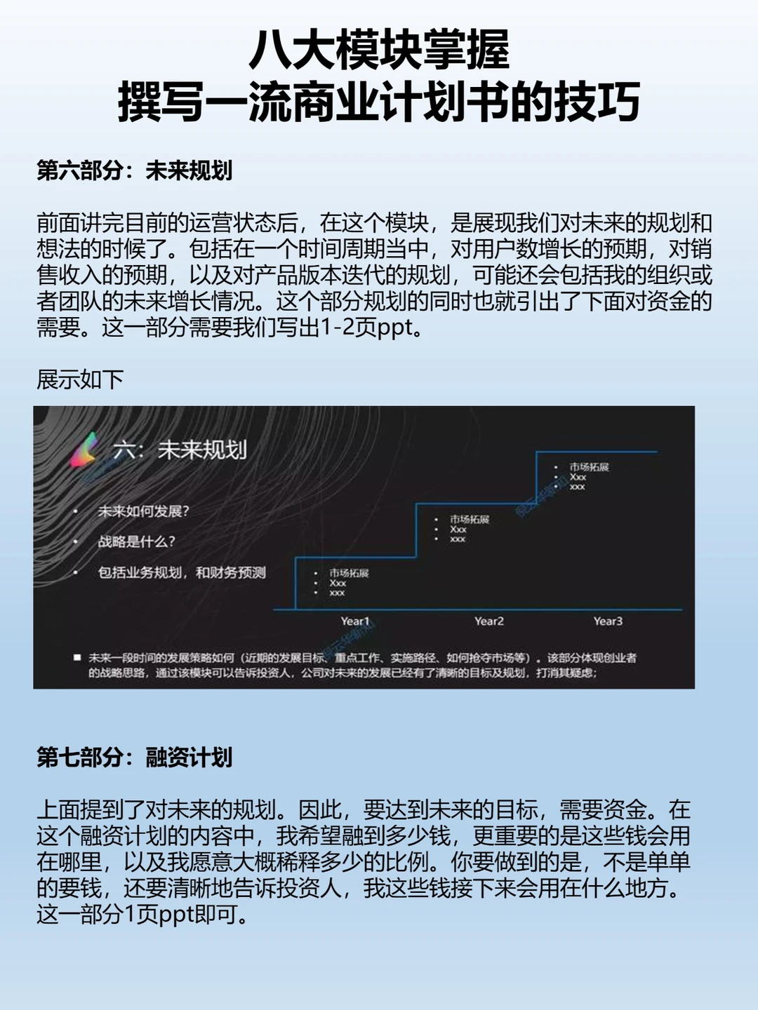 一个标准的商业计划书,一共包括八个模块,接下来我向你一一介绍:
