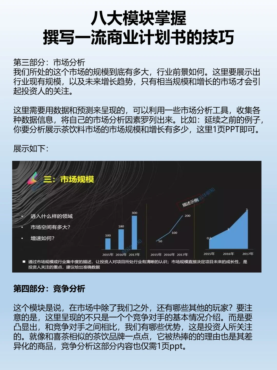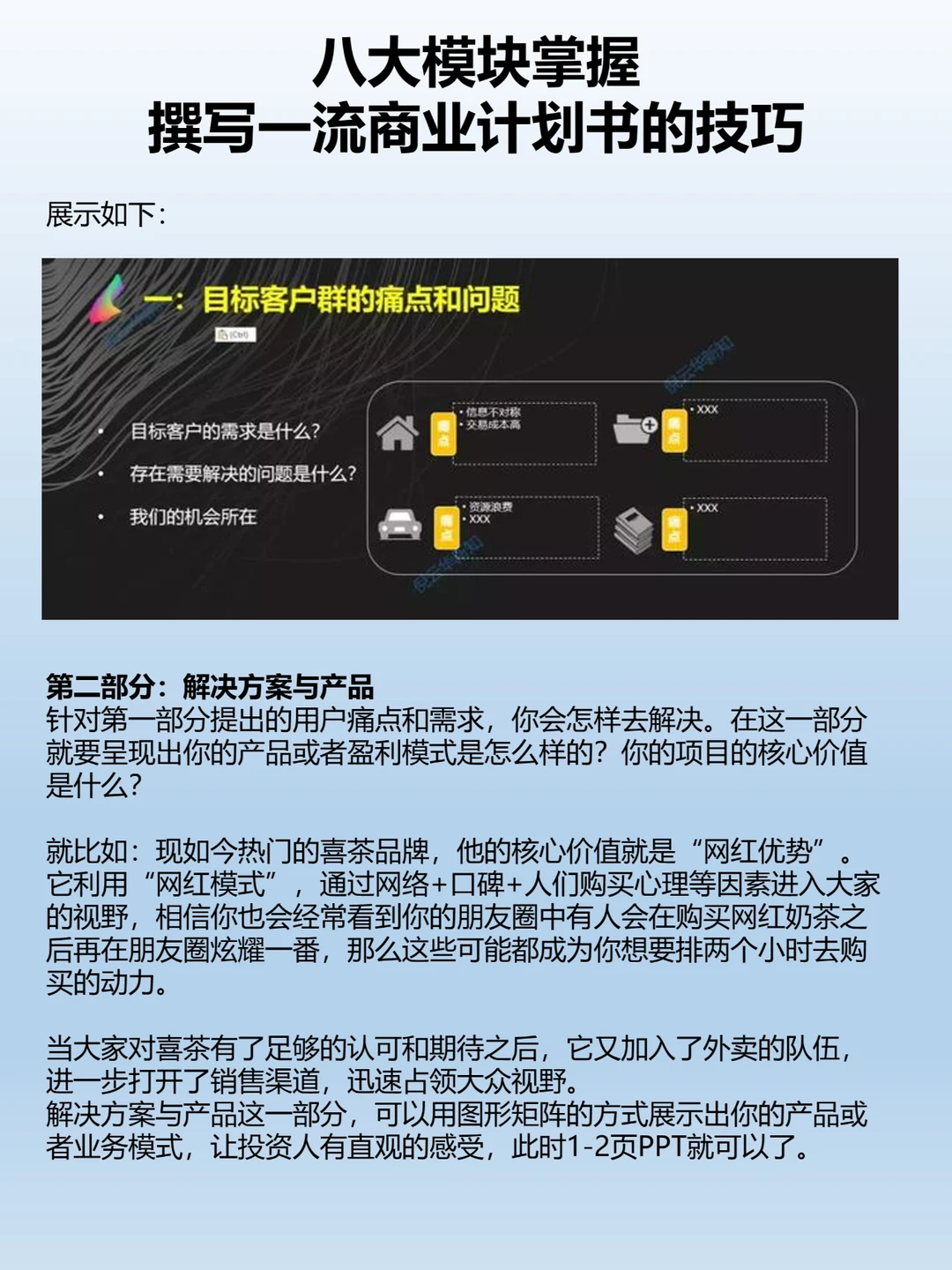 我们举个简单的例子,就比如:你如果要开个奶茶店,那你在写商业计划书的时候就需要把我这个奶茶店的用户群及这个用户群有哪些未被满足的需求写出来,比如对于口味多样化、或者价格的偏好等等。这部分如果用ppt呈现,内容1-2页就够了。