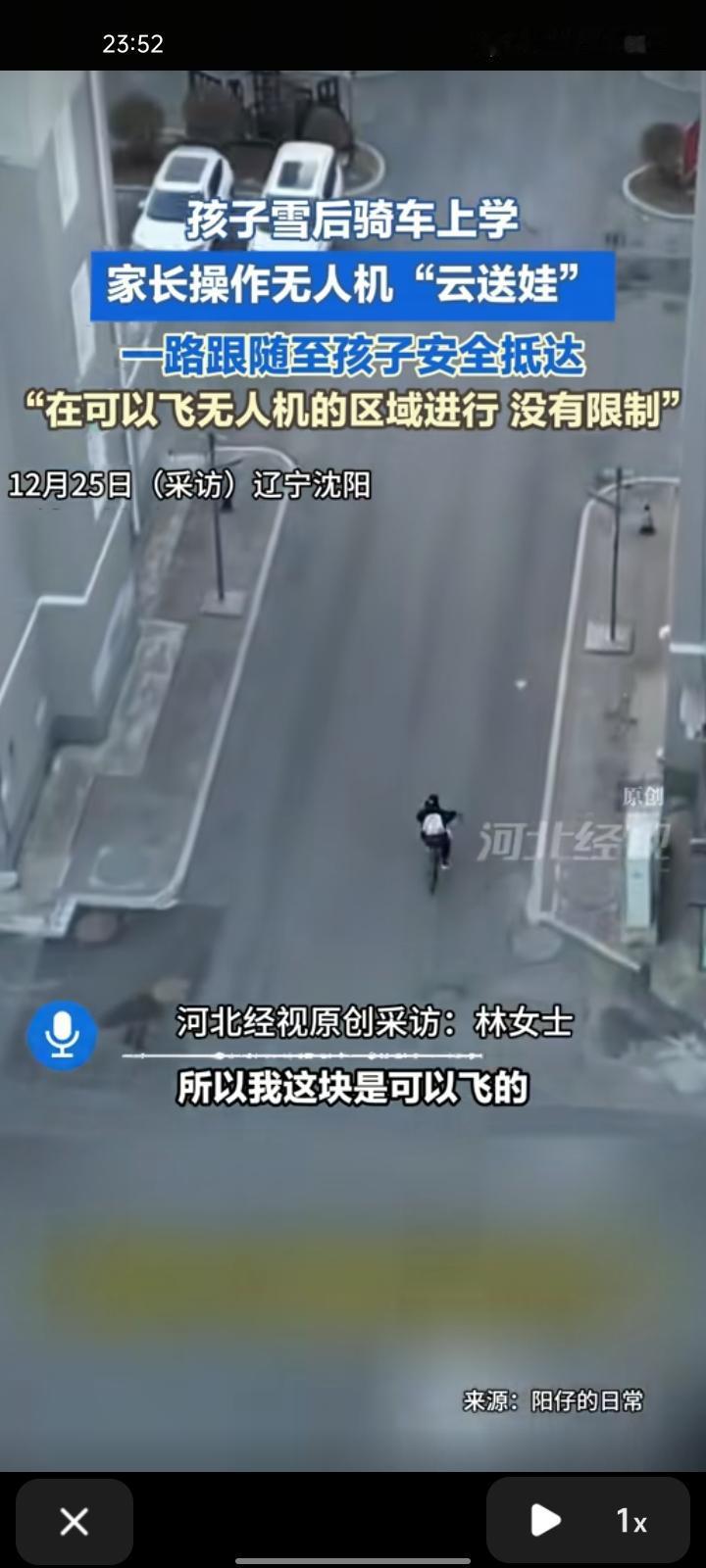 12月14日,辽宁沈阳。孩子雪后骑车上学,家长操作无人机“云送娃”,一路跟随到孩子安全抵达。 孩子妈妈林女士称,沈阳下了一场雪,道路比较滑,自己懒又不想下楼。他想骑车去上课,就说“那你就骑吧”。然后处于担心,合计着就飞个无人机看一下,在可以飞的无人机区域进行,没有限制。