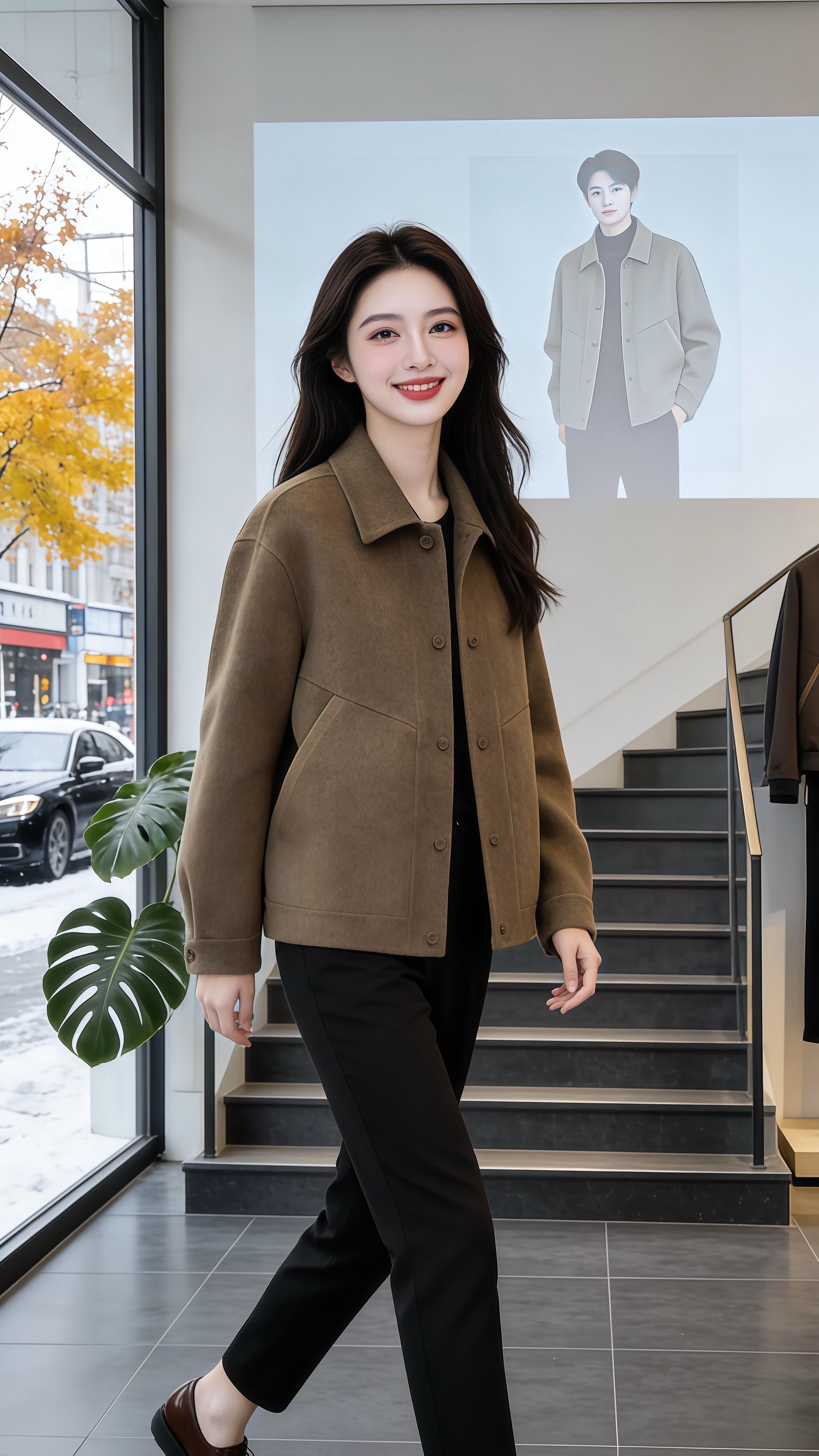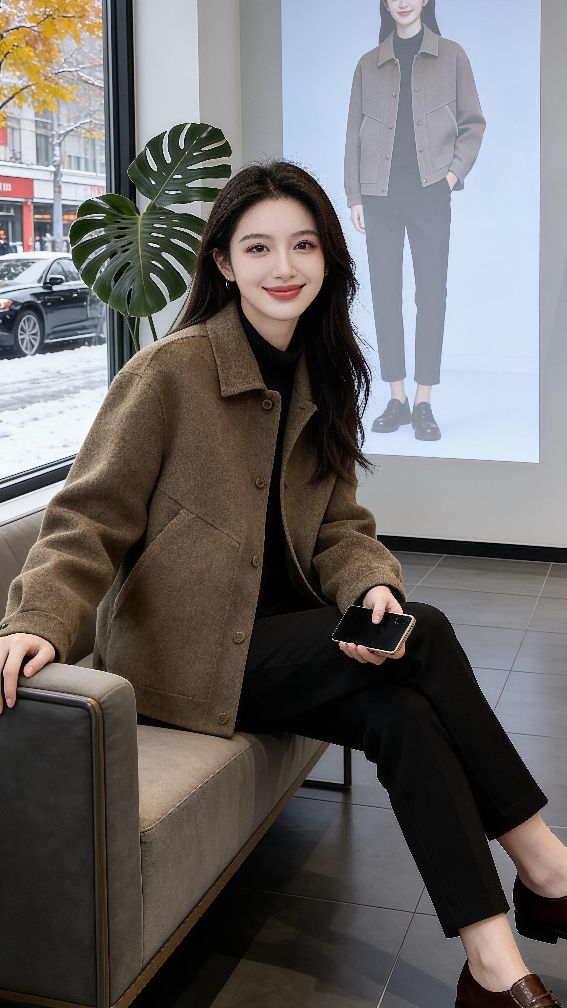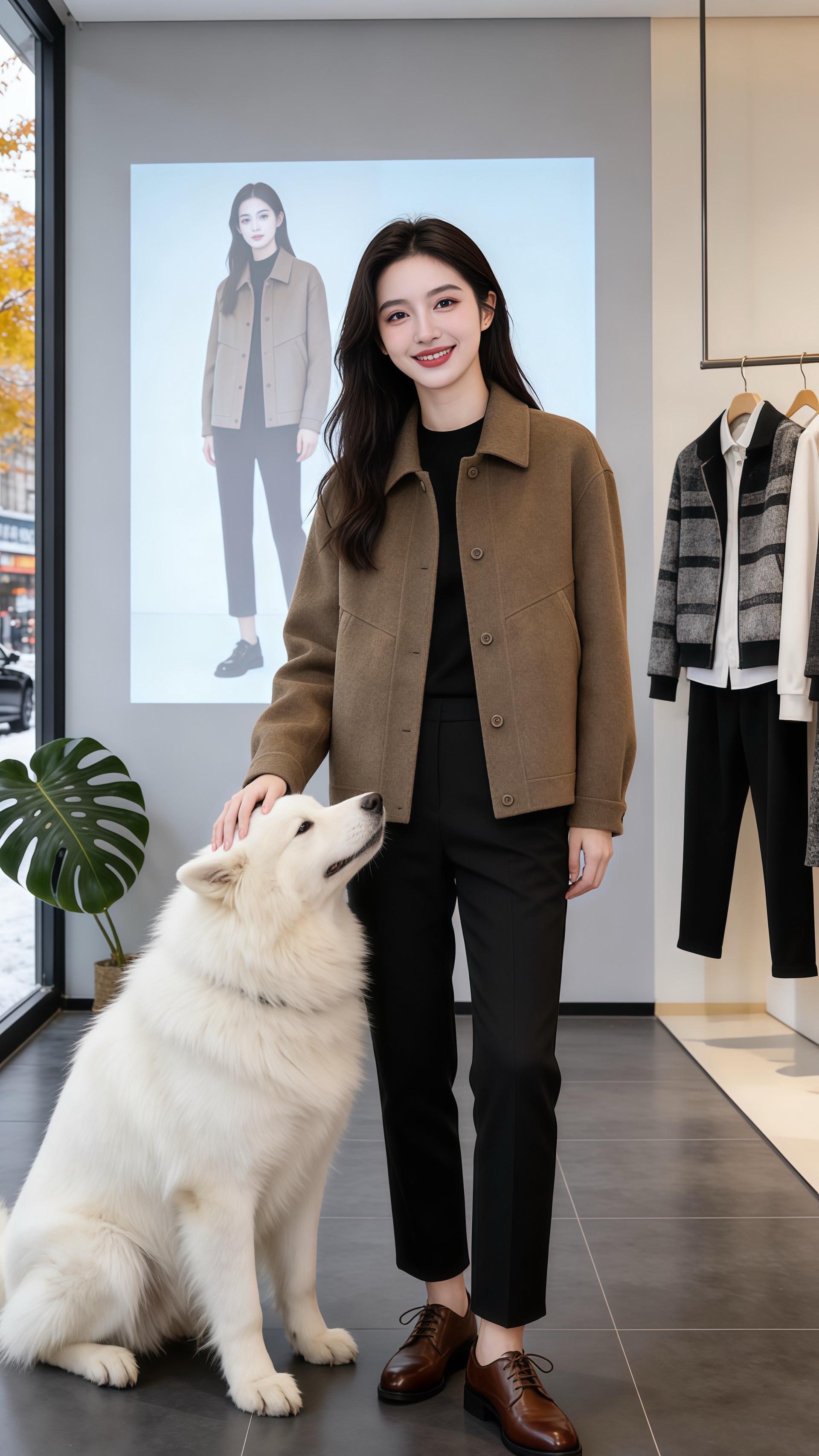 雪粒扑在服饰店的落地玻璃上时,皓明抬眼撞见许妍。她穿的咖色短外套绒面肌理衬得肩线软而挺括,黑高领内搭收住脖颈线条,和黑裤搭出一种冬日里的雅致,棕皮鞋的光泽落在裤脚,成了恰到好处的点缀,连店内的萨摩耶都凑过来蹭她的手。