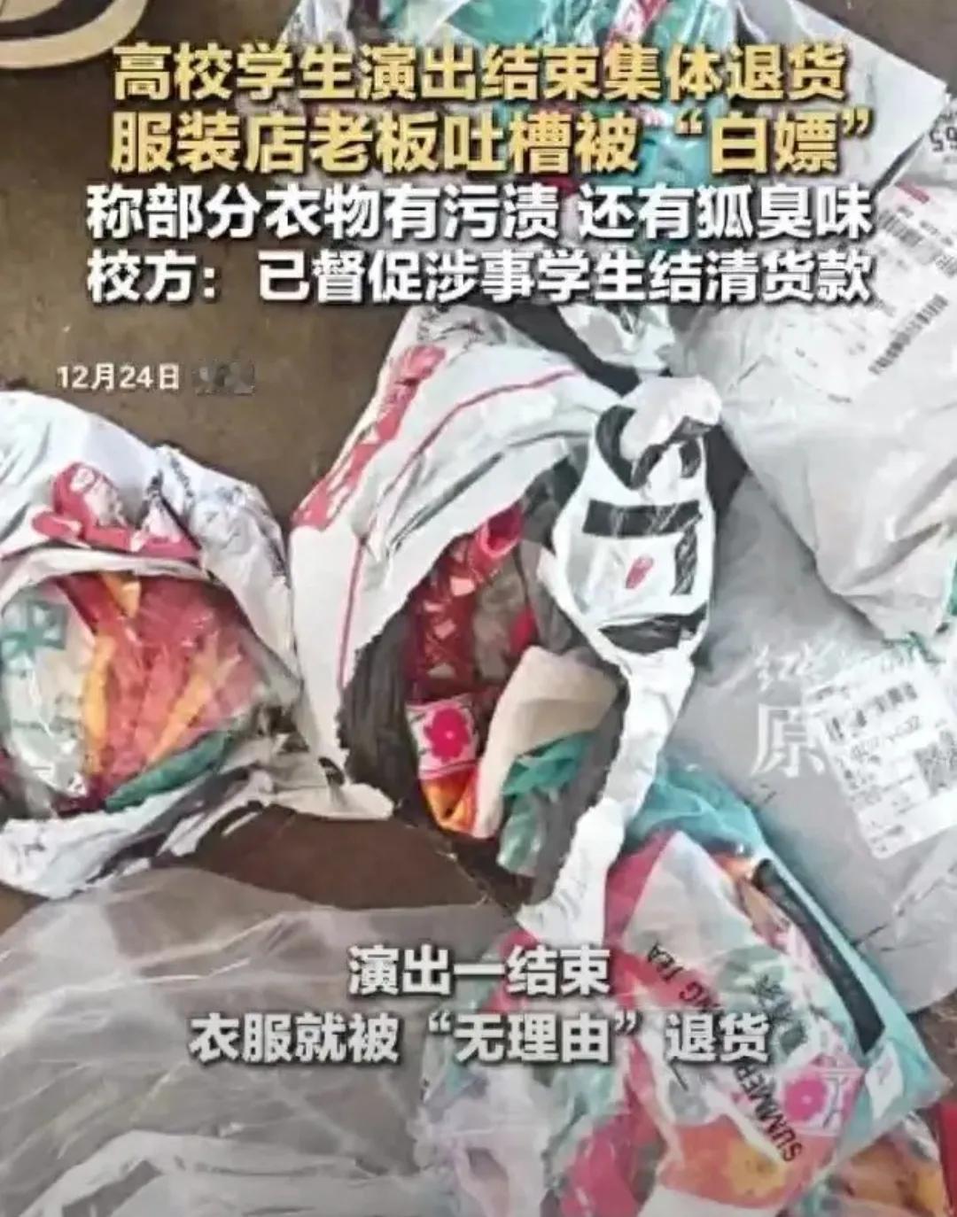 高校学生演出结束集体退货,校方:已督促涉事学生结清货款 此类事件并非个例,多地高校曾发生类似情况,商家单次损失常达数千元。退回衣物多有勾丝、异味等损坏,已不符合二次销售标准。 律师明确“七天无理由”≠“无条件”,商品需保持完好,穿后退货已违背法律精神。学生分散下单、用虚拟号码,实质是钻规则漏洞。 这暴露部分学生诚信缺失,高校德育需落地。数据显示,大学生征信认知碎片化,易因逐利忽视契约责任。 诚信是立人之本,大学生不应将规则当套利工具。校方督促付款是底线,更需强化日常诚信教育,让责任意识与权利意识同步成长。