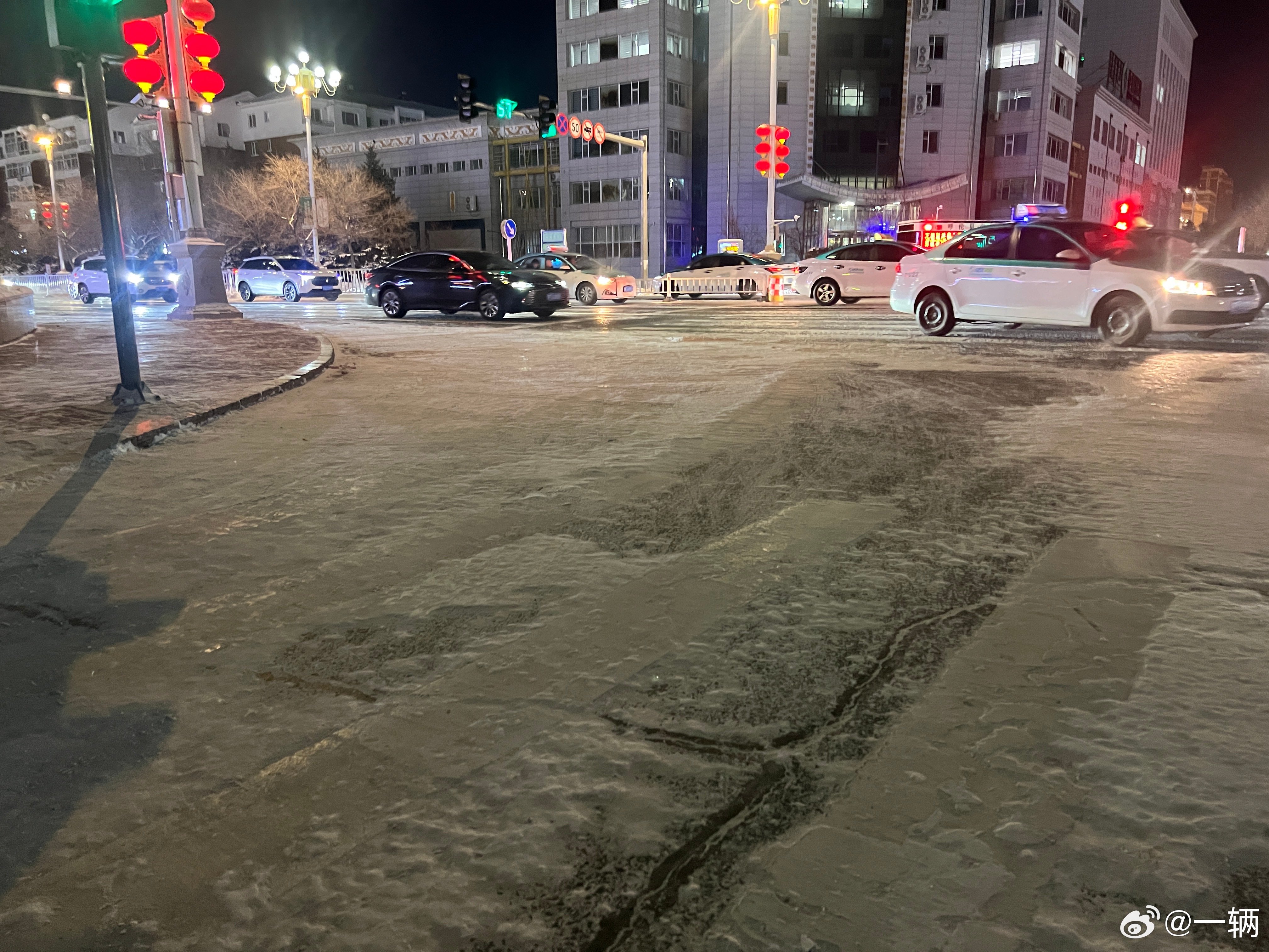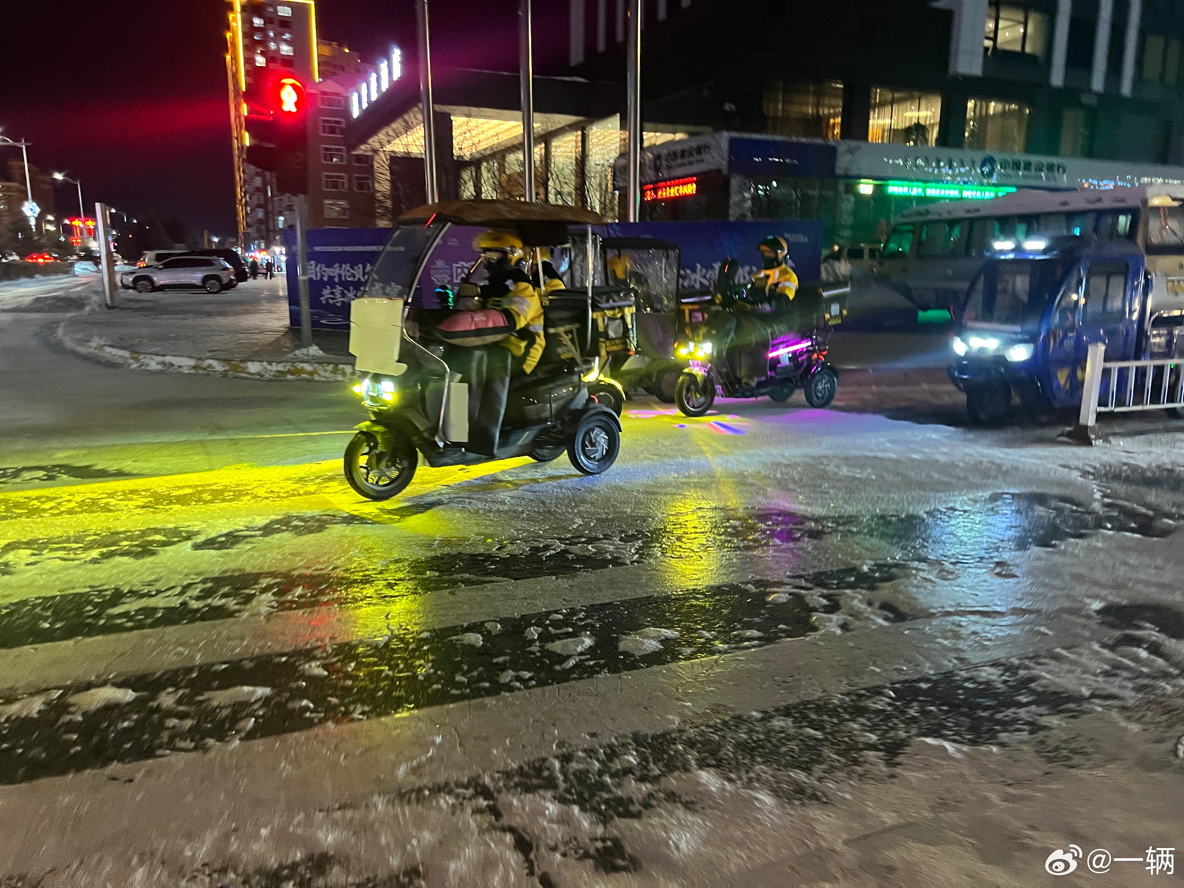 像在呼伦贝尔这种极寒环境结冰的路面上开车,大家都非常文明,不争不抢,因为大家都知道抢是没有好结果的也不会有电鸡之城那样的无法无天,并且用的都是三轮