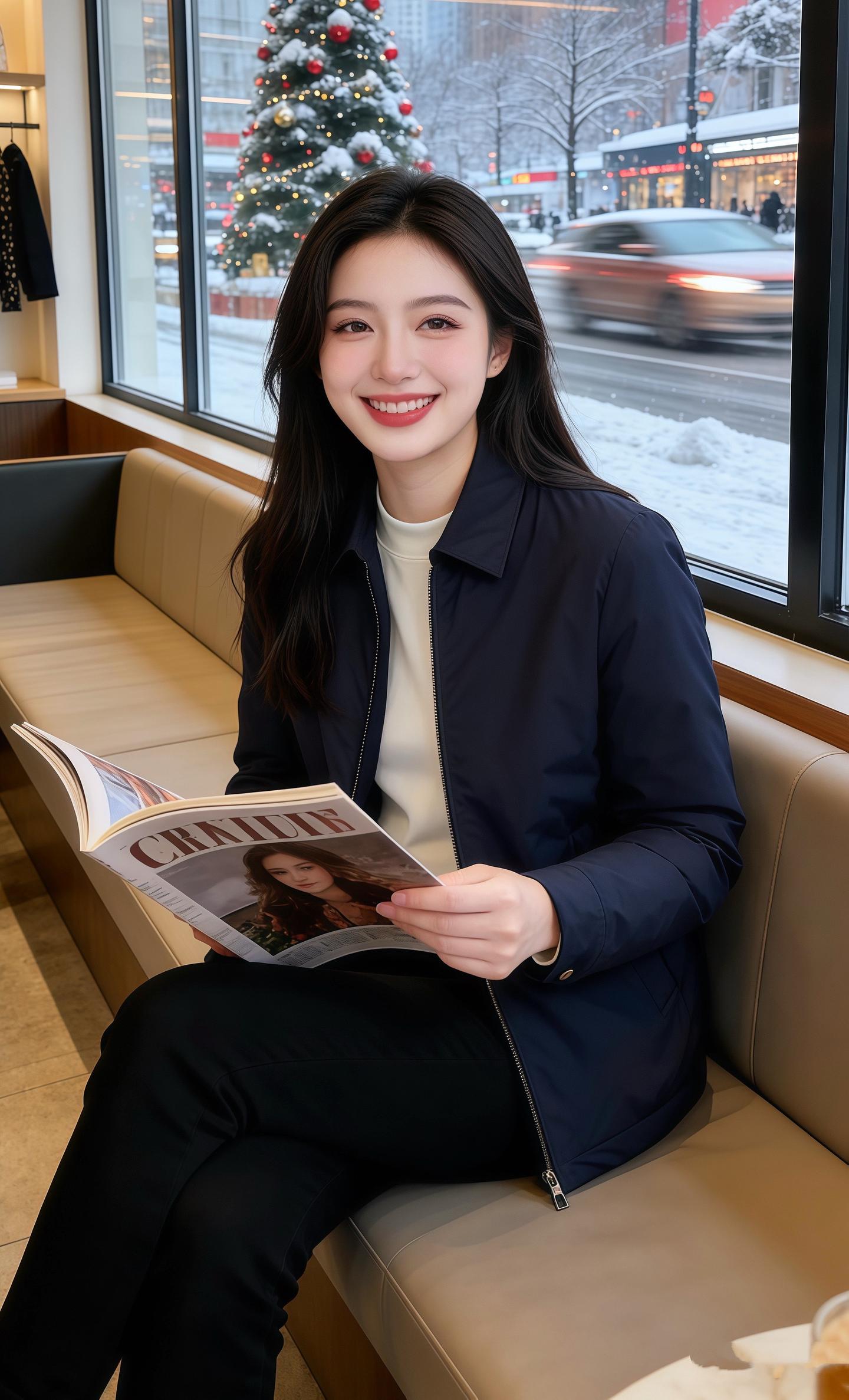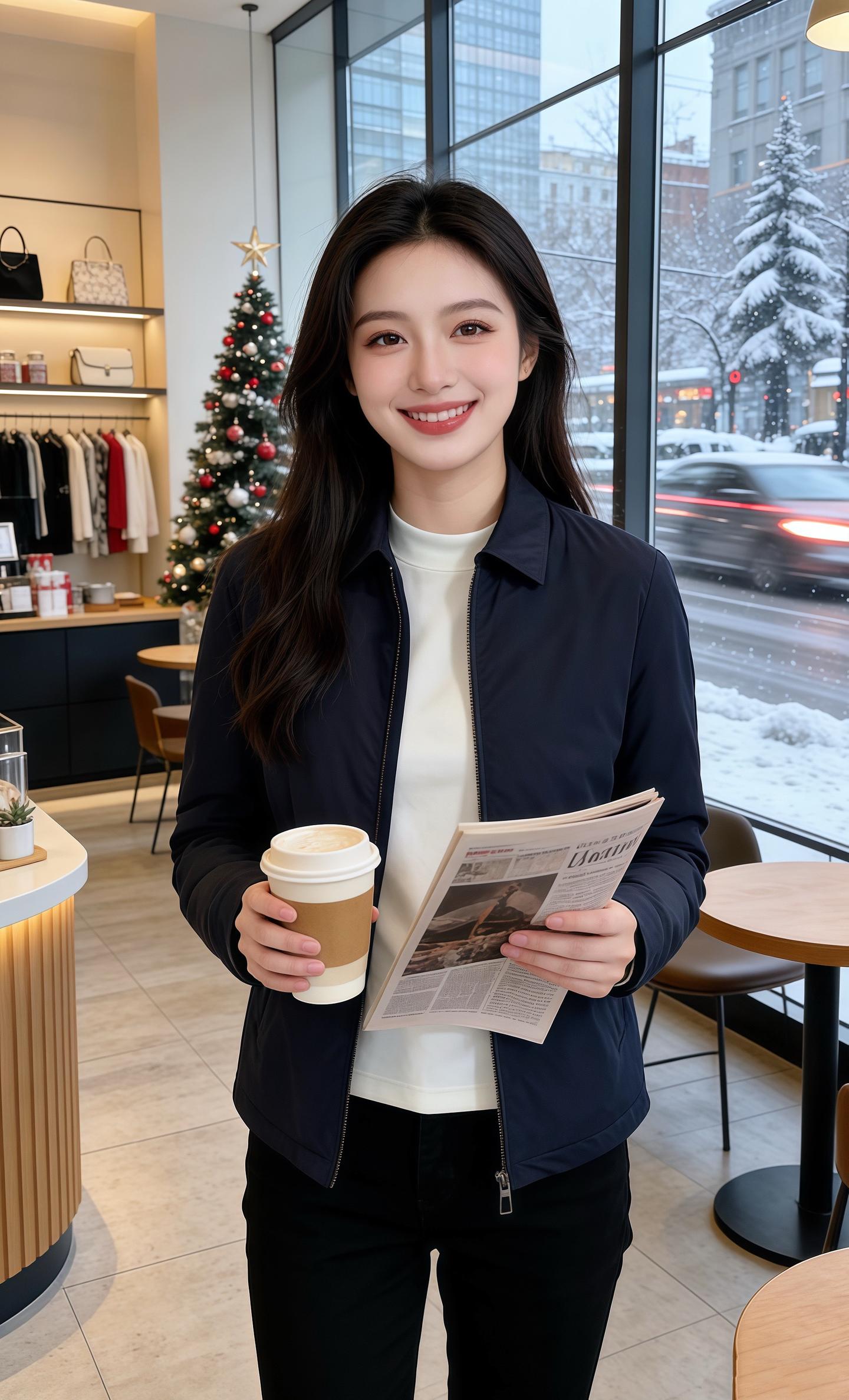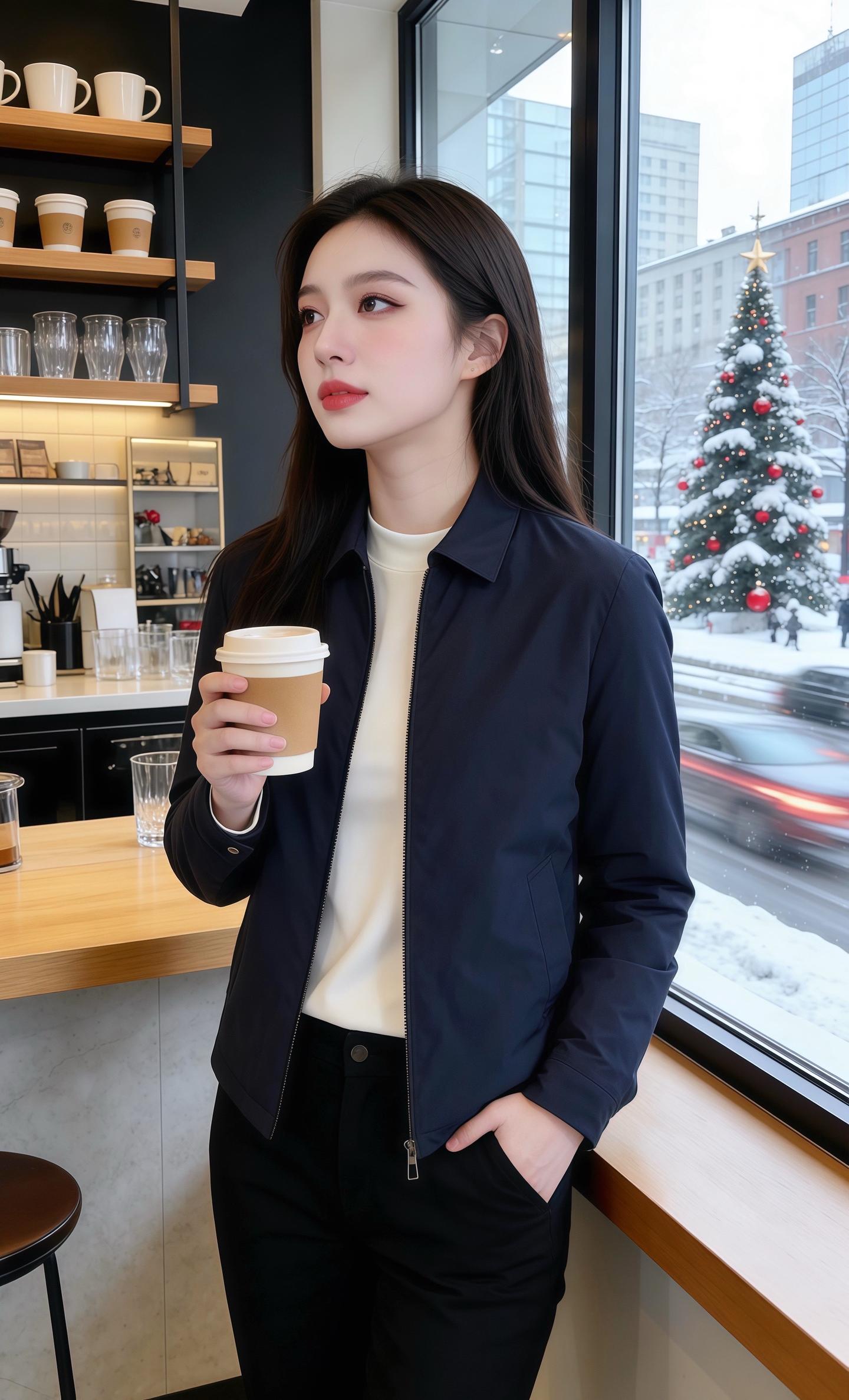 圣诞雪漫过街面的午后,他走进咖啡馆,一眼撞进她藏青外套的温柔里。外套面料带着哑光的软,翻领衬得内搭白T恤的领口干净,拉链半开的弧度顺着腰线轻落,配着垂顺的黑裤,把冬的冷冽都揉成了温润的暖。