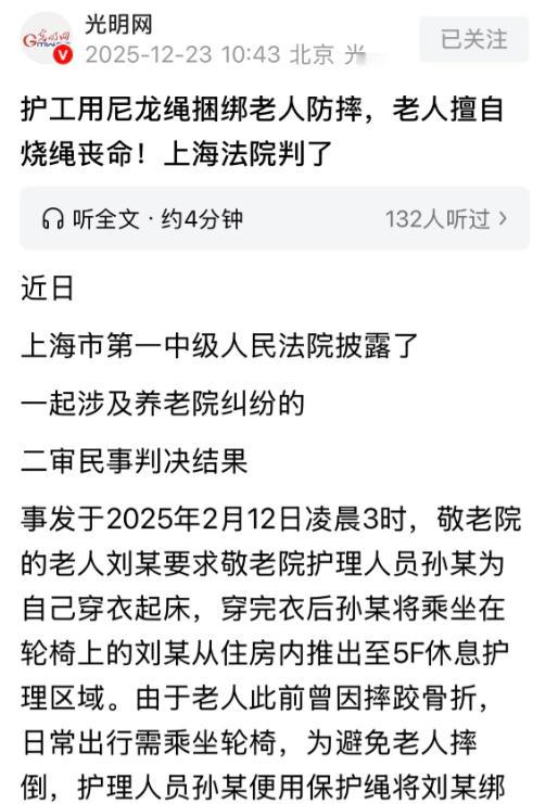 “讹天讹地讹空气!”上海,一老人凌晨3点在敬老院醒后,坐上轮椅被护工推到休息区,由于老人之前摔骨折过,护工怕他又摔倒,就用尼龙绳将他绑在轮椅上,随即离开忙别的事了,老人无聊,独自坐电梯来到一楼后,想解开绳子,几次解开未果后,老人掏出打火机想烧断绳子,谁料,绳子迅速燃烧,点燃轮椅,最终烧至全身,老人身亡。事后家属诉至法院,要求敬老院担全责,索赔死亡赔偿金及丧葬费193万。法院判决出乎意料! 2025年2月12日凌晨,在某敬老院的一楼大厅监控中,记录下了一段令人窒息的画面。这段影像不仅定格了一位老人的最后时刻,也撕开了“照护防线”背后粗糙的一面。 整整11分钟,一位轮椅上的老人从被火苗舔舐到全身被吞噬,周围除了冰冷的墙壁,竟无一人施救。直到凌晨3点47分巡逻人员的手电筒光束扫过,一切已无法挽回。 悲剧的源头,往往看似“为了你好”。死者刘大爷腿脚不便,既往有过骨折史,在这家敬老院里,他是重点关注对象。 对于坐不稳、怕摔倒的老人,院方有一套简单粗暴的“土办法”:绑。但这并非专业的医用束缚带,而是一根廉价、易燃且勒得生疼的尼龙绳。 事发前,刘大爷凌晨3点早醒,护理员孙某帮他穿衣起床后,推到了5楼休息区。为了防止老人滑落,孙某扯来一根尼龙绳,绕过老人的腰腹,结结实实地在轮椅上打了一个“死结”。 这个“死结”,成了后来绝望的导火索。孙某给老人倒了杯水,寒暄几句见老人并未反抗,便转身去忙碌其他事务,留刘大爷一人呆坐。 但他低估了老人的行动力与那份被束缚的焦躁。仅仅五六分钟后,刘大爷便自行操控轮椅滑进电梯,一路下到了空无一人的一楼大厅。 那是凌晨3点20分,监控镜头里,刘大爷显得极其烦躁。绳子或许绑得太紧,又或许是刚才调整坐姿时勒到了肉,他的双手不断在腰间摸索、抠弄。 然而尼龙绳的死结越扯越紧,那一圈圈绕在肚子上的绳索仿佛成了难以挣脱的枷锁。在几次徒手解绳失败后,老人做出了一个极端的决定——他把手伸进衣兜,掏出了随身携带的打火机。作为老烟枪,这本是他排解寂寞的物件,此刻却成了切割束缚的工具。 这正是整场事故中最荒谬也最致命的错位:一个被判定为“行动不便需强制束缚”的看护对象,口袋里却装着极其危险的火源,且处于完全的监控盲区。 3点25分,打火机那微弱的蓝色火焰刚一接触绳索,灾难瞬间爆发。化纤材质的尼龙绳如同导火索,根本不是被烧断,而是瞬间引燃。火舌顺着绳子迅速向两侧乱窜,紧接着舔上了轮椅右侧的橡胶轮胎,焦糊味在空旷的大厅里弥漫。 此时的刘大爷,意识依然清醒。监控显示,他拼命挥舞枯瘦的双臂试图扑打身上的火焰,但被死死绑在燃烧的轮椅上,身体动弹不得,喉咙里的呼救声被黑烟呛住。 如果此时有哪怕一名值班人员经过,这可能只是一起轻微的意外。然而,偌大的大厅如同真空地带,火焰肆虐了整整11分钟,直到那个试图烧断绳结的人化作一团不动的阴影。 事后家属的愤怒直指敬老院的管理漏洞,一纸诉状索赔193万余元。他们质问:为何要用易燃的尼龙绳而非正规安全带?为何护理员将老人绑好后就玩“失踪”?对此,敬老院却掏出了几份早已备好的“护身符”——《老人外出与自由活动约定》和《住养人员安全告知书》。 院方的逻辑很生硬:我们告知了风险,也采取了防摔措施(绑绳),且规章约定“老人违规外出后果自负”。在他们看来,是老人自己乱跑、自己点火,院方属于“防不胜防”。 这场关于生死的拉锯战,最终在法律的天平上得到了冷静的拆解。一审及二审法院并没有被敬老院的“免责条款”带偏。 根据《民法典》相关规定,经营场所未尽安全保障义务致人损害,必须担责。所谓的“后果自负”协议,并不能免除机构在安全管理、材质选择、以及夜间巡视上的法定责任。 那根不专业的尼龙绳、那个无人看守的空窗期,都是无可辩驳的过错,院方被判承担30%的赔偿责任,需赔付60万余元。 但判决同样也是残酷的。法院认定,主要的70%责任仍由刘大爷自己承担。理由很简单:虽然他身体残弱,需要轮椅代步,但他的精神和认知是正常的。 作为一个完全民事行为能力人,他应当预见到用明火烧化纤绳索、且紧贴身体操作的极高风险。点火的那一刻,虽然是出于解困的无奈,但这一行为本身具有高度危险性,是他自己按下了悲剧的启动键。 60万元的赔偿金与一条人命相比,显得冰冷而沉重。这个判决结果撕开了养老行业最隐秘的痛点:不仅是简单的防火防盗,而是如何界定“约束”与“看护”的边界。 那一根原本用来“救命防摔”的绳子,在错误的时间、错误的材质、错误的监管下,最终变成了夺命的凶器。 当护理员孙某在3点钟转身离去的那一刻,他以为只是短短的几分钟,却没想到在制度的疏忽下,这点时间足够把“安全措施”变成“死亡陷阱”。