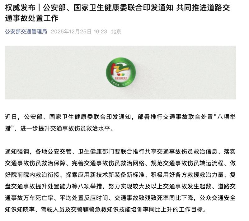 通知强调,各地公安交管、卫生健康部门要联合推行共享交通事故伤员救治信息、落实交通事故伤员救治保障、完善交通事故伤员救治网络、规范交通事故伤员转运流程、做好院前院内救治衔接、探索应用新技术新装备新标准、积极用好各方救援救治力量、复盘交通事故提升处置能力等八项举措,努力实现较大及以上交通事故发生起数、道路交通事故万车死亡率、平均处置反应时间、交通事故致残致死率同比下降,公众交通安全知识知晓率、驾驶人员及交警辅警急救知识技能培训率同比上升的工作目标。