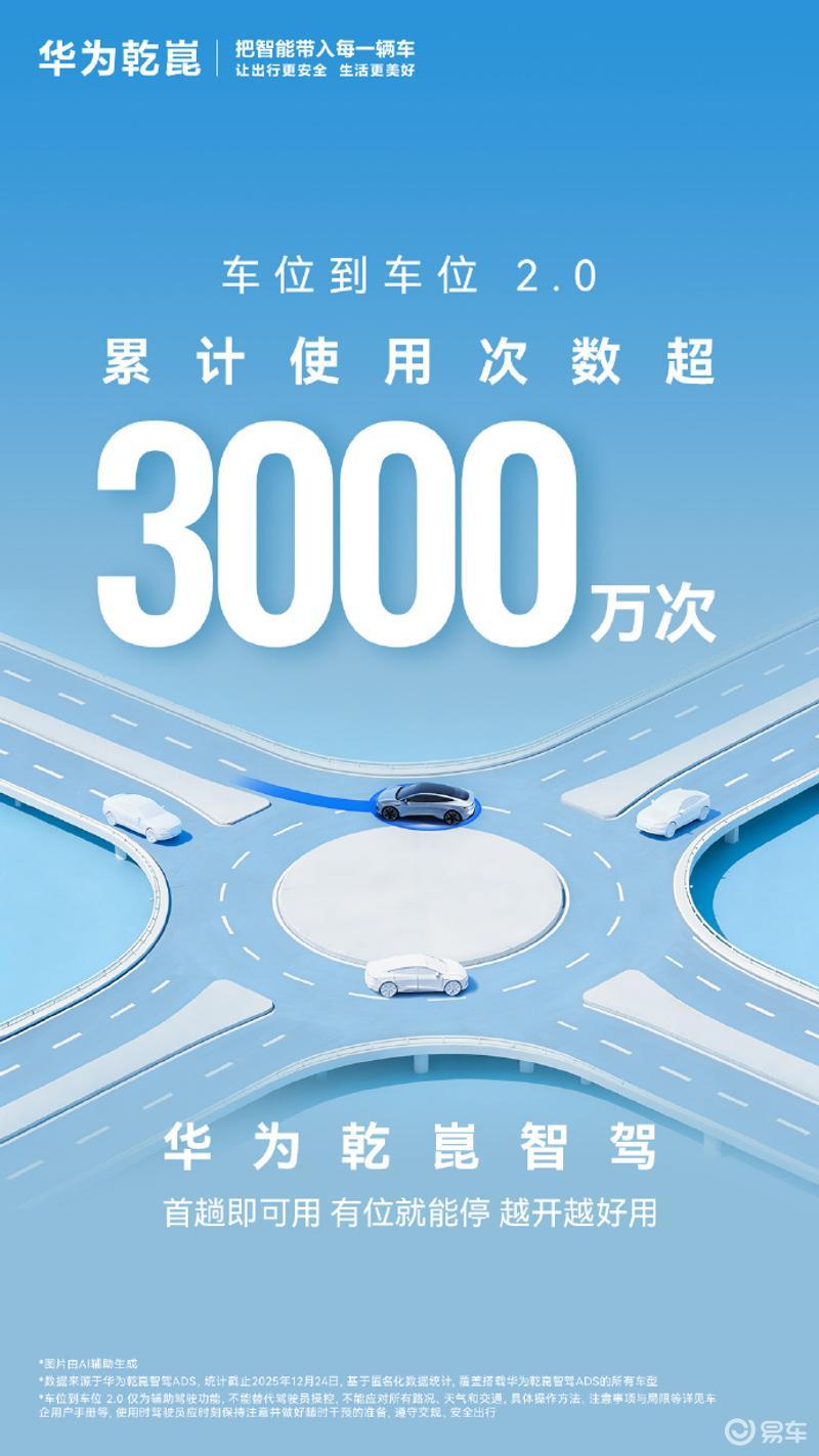 易车讯12月25日,华为乾崑智能汽车解决方案微博官方宣布,华为乾崑智驾「车位到车位2.0」迎来两大全新里程碑,全国支持停车场数量突破100万个,累计使用次数超3000万次。