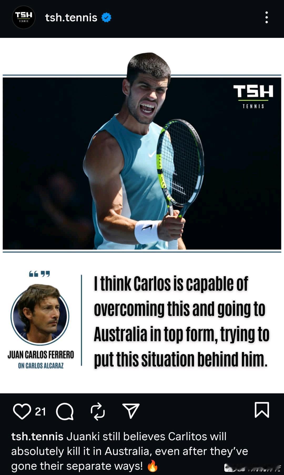 三个推送都是出自同一次采访: “我们双方都需要时间适应这一次分别。这并不容易。对我来说,它到现在还是很令我受伤。 我认为阿卡会迈过这个坎,将这件事置于脑后,以最佳状态迎接澳网。 我不会排除跟阿卡再次合作的可能性。考虑到我们曾经的关系,这么做对他或者对整个团队来说都是很不理智的。我希望和他们好聚好散。某些事情无法达成观点一致不代表我们无法继续当朋友或者维持良好关系。我祝阿卡一切安好,我相信他有能力成为历史最佳。”
