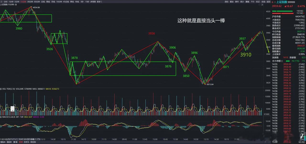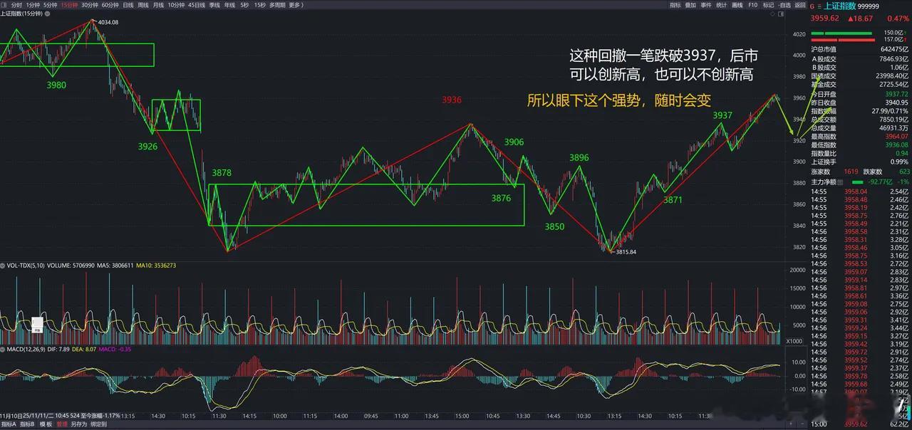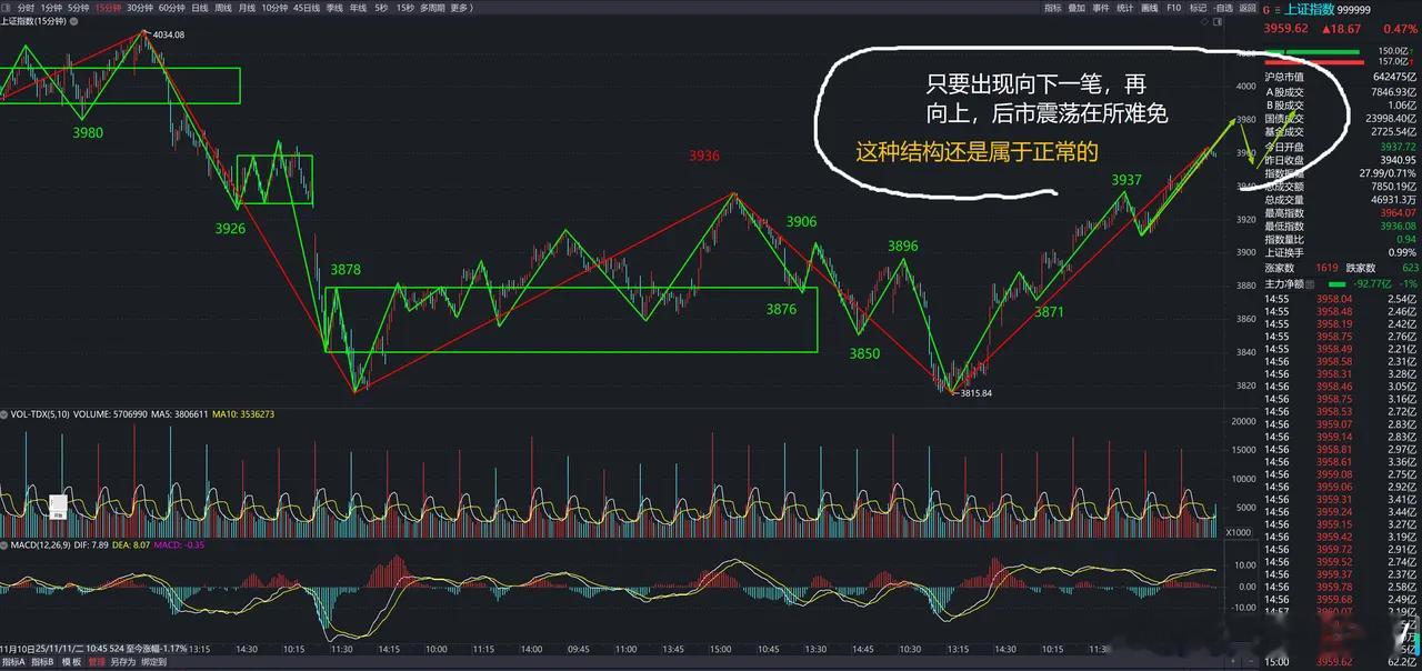当前指数上行处于3815点启动的日线红色线段内部的15分钟绿色笔结构,今日延续涨势后,该绿色笔上升过程中的背驰信号未完全消除,多头力量仍占据主导地位。对于今日上涨,昨日分析已有提示,需要强调的是:尽管当前结构偏强,但一旦出现15分钟级别向下回调笔,后续再创新高时,指数大概率将进入震荡周期。因此,现阶段不宜追高加仓,建议择机逐步收缩持仓。后续若出现15分钟级别的向下红色线段调整,将是二次进场的优质窗口,该入场策略的目标位直指4034点。市场存在直接突破4034点的理论可能性,但此为小概率事件,不建议博弈——究其核心,本轮上涨本质仅为日线级别一笔上行,尚不具备持续强攻的级别支撑。后市具体走势演化路径,可对照附图进行对应研判。
