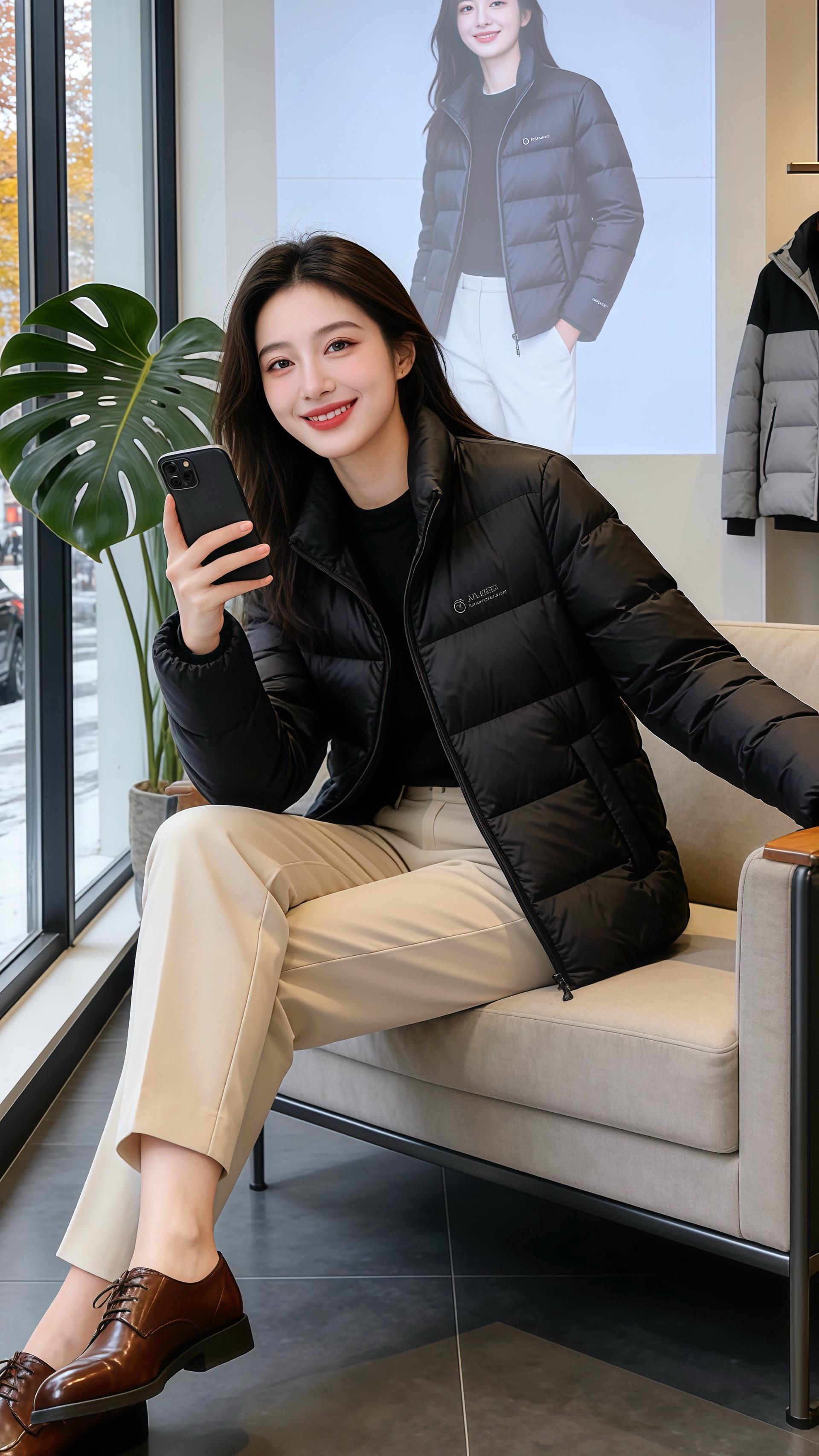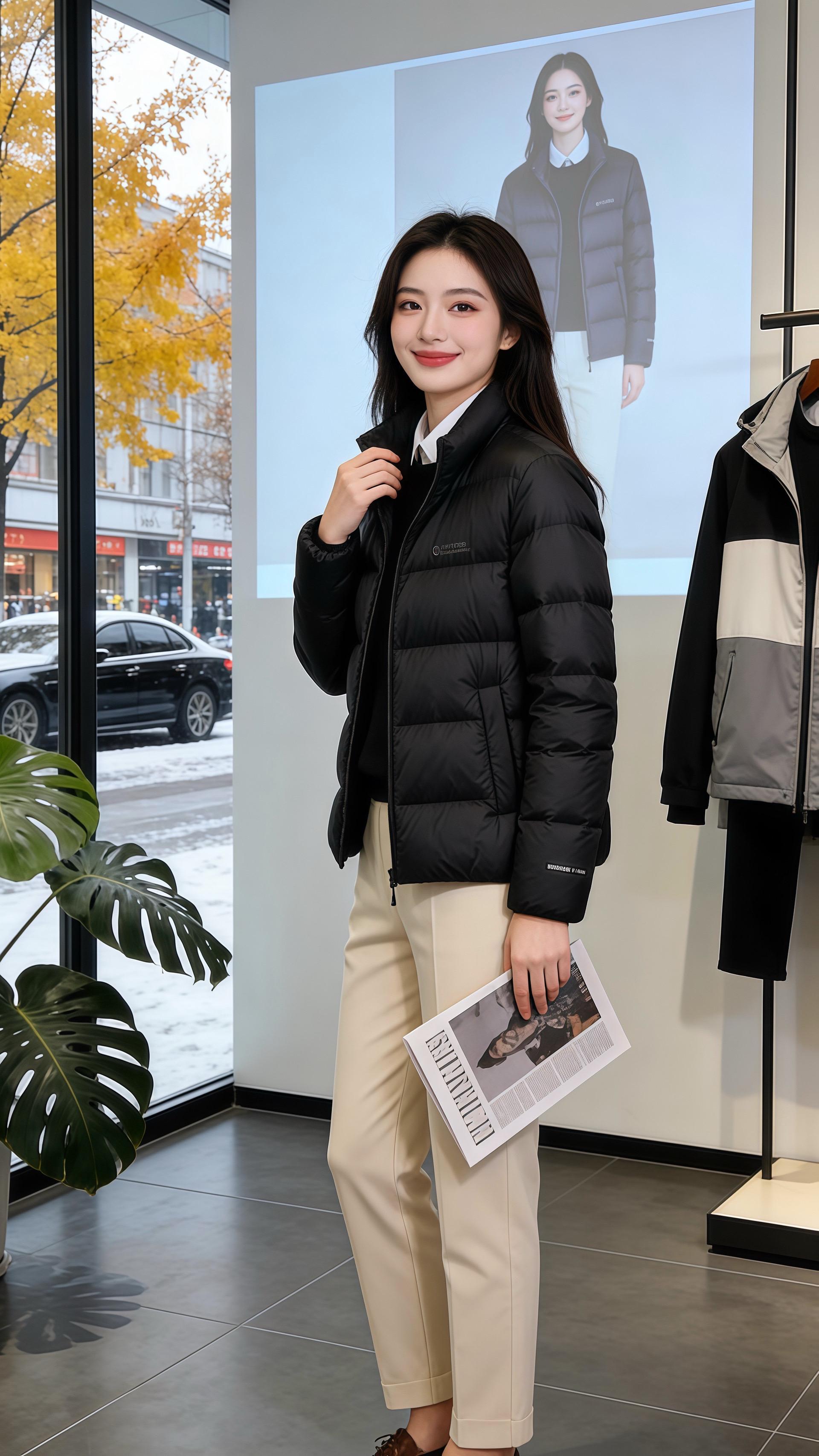 等她倚着柜台指向同款羽绒服时,衣料的光泽衬得身姿舒展,背景里的穿搭海报都成了模糊的陪衬。她转头望向皓明时,黑色羽绒服的褶皱顺着动作轻垂,竟比海报里的示范多了几分鲜活的温柔,连店内叠放的其他款式,都显得少了些灵动。