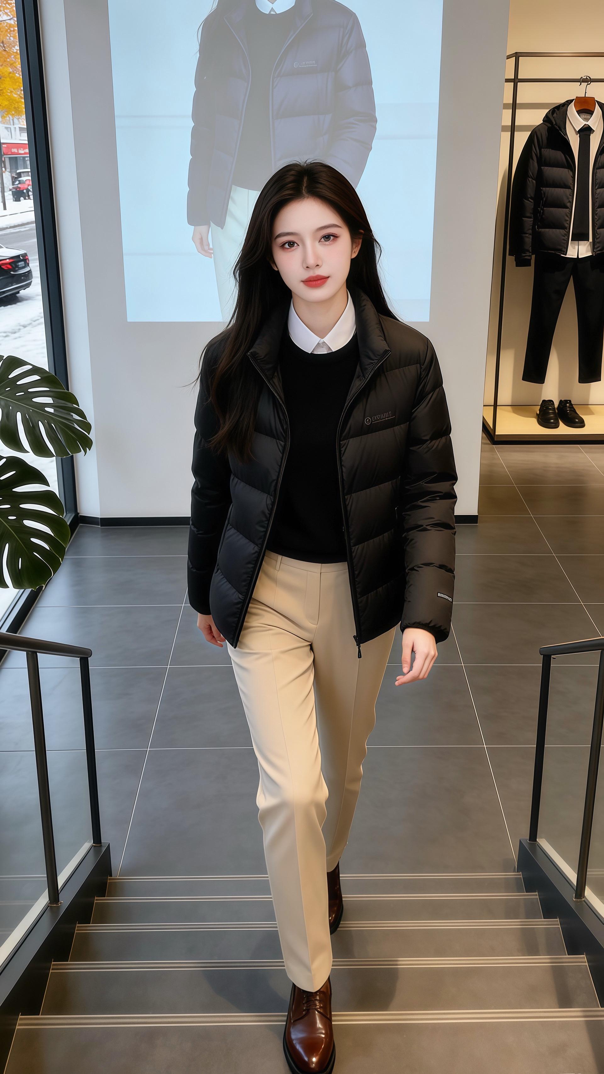雪粒扑在服饰店的落地玻璃上时,皓明抬眼撞见许妍。她穿的黑色羽绒服立领衬得肩线软而利落,绗缝纹理让版型松而不塌,白衬衫边漏出的细边像融雪后的碎光,和米白长裤搭出一种冬日里的雅致,棕皮鞋的光泽落在裤脚,成了恰到好处的点缀。