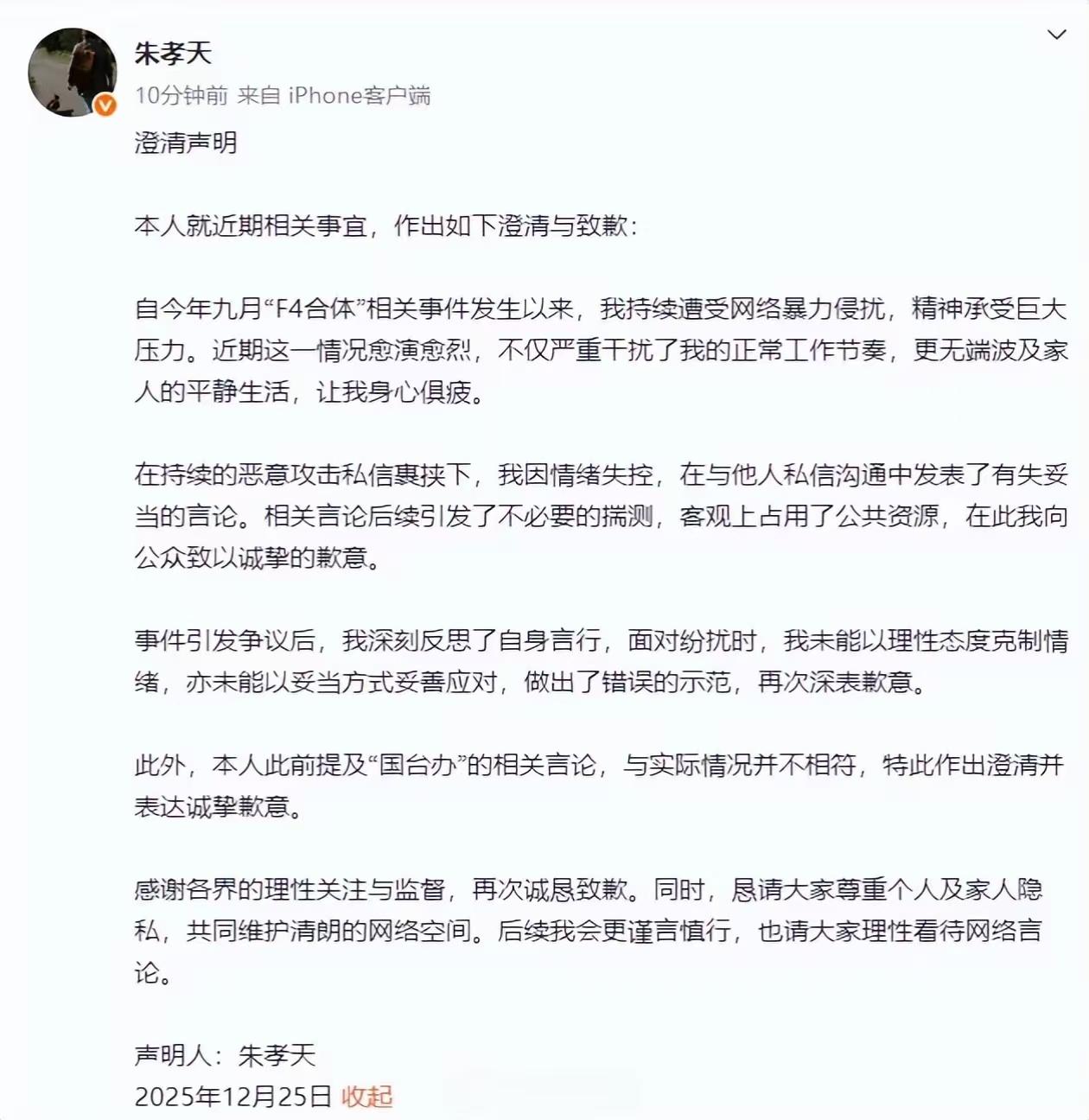 朱孝天你是真的不适合娱乐圈! 前两天才还举报阿信经纪公司勾结黄牛, 还说五月天演唱会假唱, 没多又出来道歉说自己情绪失控说错话, 粉丝到底该信你哪句话呢? 做人留一线,日后好相见, 朱孝天现在是把很多人都给得罪了, 估计以后F4也没办法合体了, 可能还会遭到娱乐圈的封杀。 不过,还好朱孝天现在的发展方向放在了直播和短视频,就算以后真的被娱乐圈封杀,他靠直播带货和探店也应该会过得很好。 只是,粉丝可能要失望了,恐怕再也没办法看到完整体的F4了。