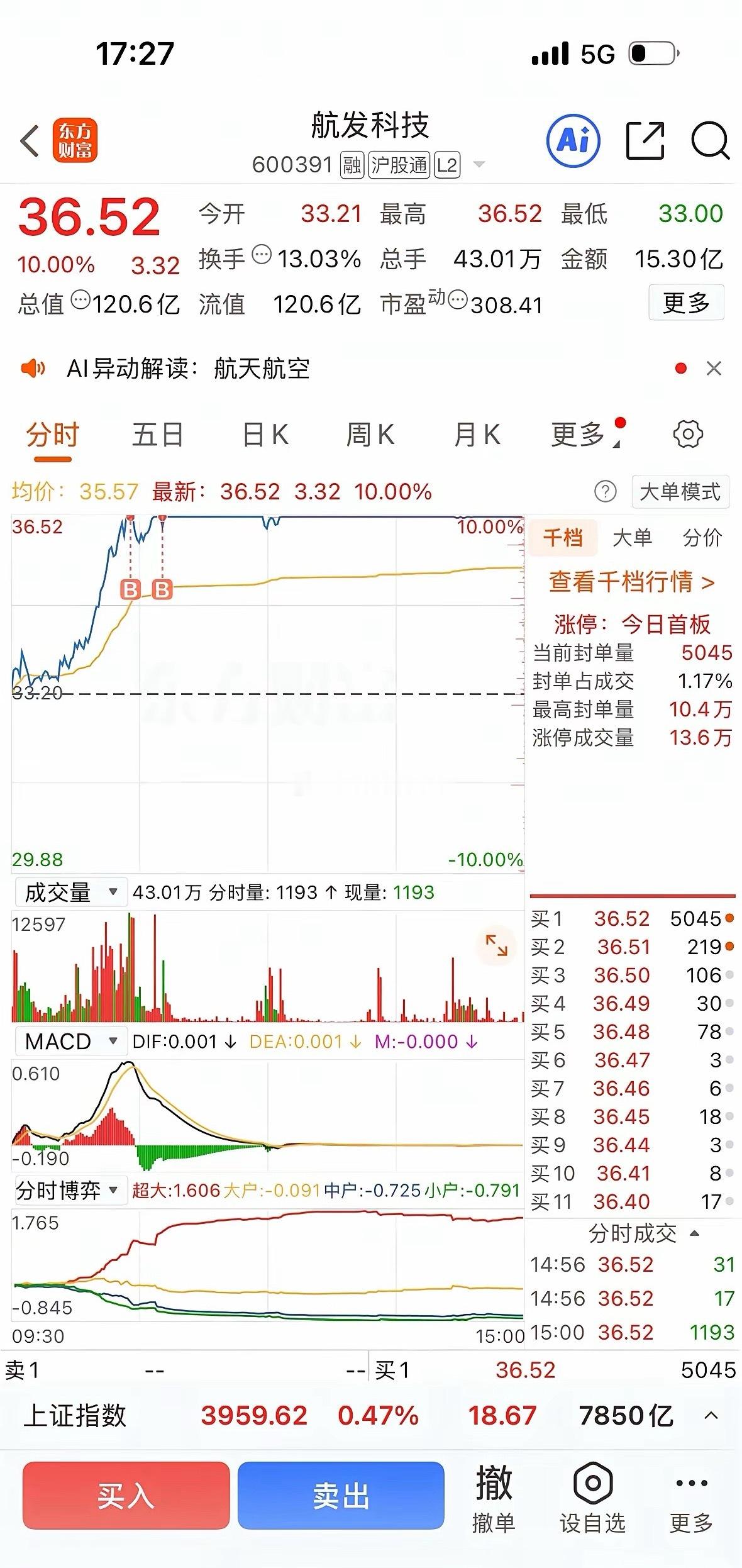 航天发展尾盘十三个亿压异动,精彩至极啊商业航天板块,主线地位无任何板块可以撼动,昨天板块高潮今天直接走强更强,昨天错过了这个板块的,今天只有去接一致和低位首板了。昨天领涨的再升,神剑,早盘集合竞价都是一字开,集合竞价结束都是小分歧直接上板,今天顶一字进的,明天还是十个点的溢价。今天最精彩的非航发莫属了,里面的资金为了控异动直接展开了多空大战,好在是控住了异动,明天的预期就是天空任鸟飞了。关于明天的盘面预演,商业航天板块即使有分歧也不会太大的,盘中分歧也有回流的预期在,明天尽量找人气股的分时低吸,顶板是不可取的。大消费:东百,百大,安记,消费三剑客,今天就百大尾盘上板了,其他的两个走势都不太好看,明天百大想走强,东百和安记的负反馈都不能太大才行,否则就是独木难支。总结:主线商业航天,今天强更强的走势,明天有所分歧是在所难免的事,但是这个位置不看空,明天要注意的就是分歧低吸的机会,临近异动的票尽量少去。今日:开航发,尾盘集合竞价去的,开航发科J、低位套利的思路,明天不强势就斩。出东百,今天表现不强势就该走了。