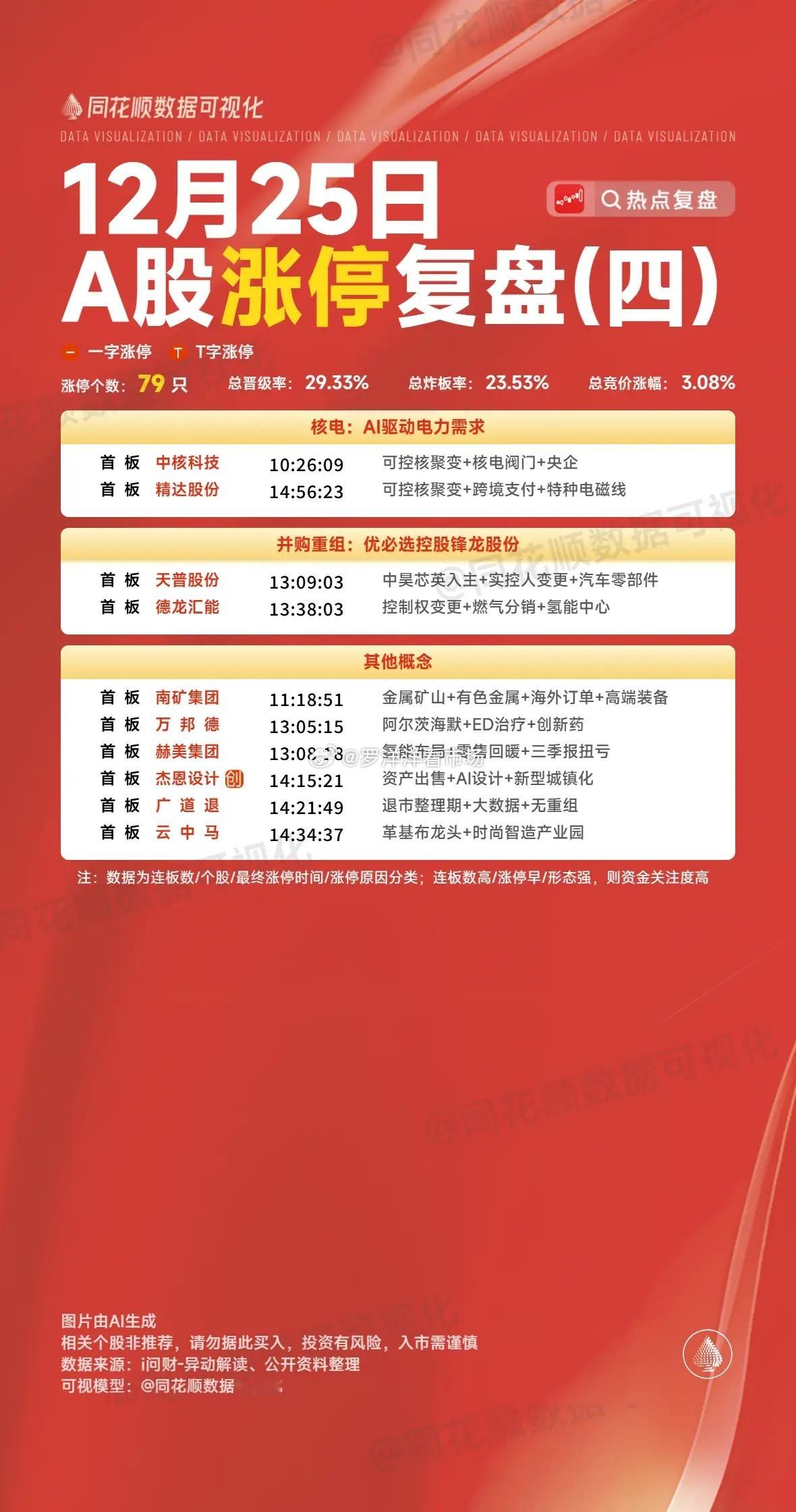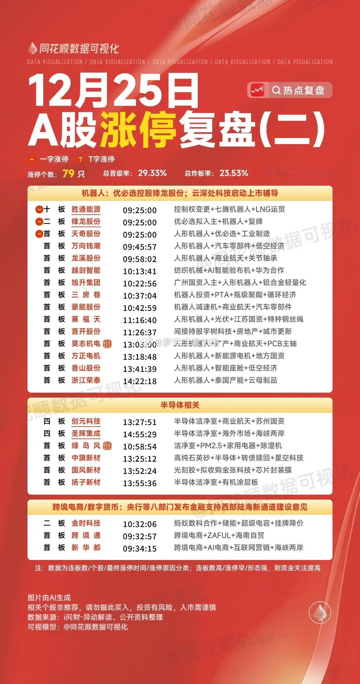12月25日复盘:商业航天继续高潮,其余板块仅剩妖股持续发力!1、商业航天:神剑股份、再升科技早盘竞价九鼎大单一字板确认强势,神剑和再升两大龙头虽然都是涨停价开盘,但是资金明显有释放抛压的意思,所以在竞价都是明显分歧状态,可是开盘后整个商业航天方向走出了非常强势的表现,所以这两只个股都是很快出现强承接彻底封死涨停,封死后几乎没有任何抛压,走出了非常强势的缩量连板形态!神剑已经达到了6板高度,好消息是隔日就算晋级7板也不会触发严重异动,这对于它来说就是个不小的机会,再加上它算是商业航天方向绝对的龙头,隔日就算板块强分歧,它必定也是资金的首选,所以这只个股隔日继续晋级的概率是非常大的,但是毕竟隔日达到7板高度,再继续连板就必然触发严重异动,它毕竟不是胜通那种重组个股,可以不当回事,从近期再升、东百、百大、航发严控异动的表现看,资金对于这个还是很谨慎的,所以隔日神剑板上很可能会出现比较多的抢跑资金,它的接力反而不是非常合适了,毕竟商业航天近期的所有龙头高度最高的只有6板,神剑隔日挑战7板,就算成功了,之后的高度也有限,这也是这只个股隔日大概率会出现大抛压的原因所在,所以神剑一旦竞价走强一字反而要注意风险!相比于神剑,再升竞价开一字板表态就是要走二波了,从情绪上看,板块持续高潮的情况下,再升开盘后炸板后迅速出现承接回封就是非常强了,而且是明显走出了突破新高表现,但是这只个股毕竟连续两天拉升放量都不是很明显,隔日如果商业航天出现分歧,它会是一个明显放量的形态,就看神剑给不给力了,如果神剑开盘有资金引导强封,它应该也会跟上,这两只个股就是明显的相互促进关系!2、零售:百大集团、东百集团昨天百大尾盘竞价控严重异动非常精准,今天脱离异动后竞价出现大幅高开,但是整个零售方向表现并不佳,所以它开盘是有资金分歧抢跑的,好在东百出现跟随共振,之后零售方向也突然走强,益民强势上板带动情绪,所以百大早盘是有多次尝试封板的,但是它毕竟在高位,而零售也没有昨天商业航天的强度,所以它连续几次封板无果后出现明显回落,之后零售整体也是大幅回落,直到尾盘最后阶段才有资金强势回封,最终走出了一个高位放量涨停!百大今天的表现是非常不错的,虽然尾盘才去封板,但是从量能上看是非常不错的,几乎是卡在放量后去回封,这样的表现下隔日得预期就还可以,毕竟零售方向近期整体表现一般,隔日一旦商业航天出现分歧,它反而有很大的看点,所以对于百大来说,只要隔日板块不差,它不排除会走出弱转强开启二波的表现,毕竟东百断板后也是有过类似的趋势上行!相比于百大,东百今天就是有点虎头蛇尾了,开盘后跟随百大拉升走强,但是百大迟迟不封死涨停,东百完全没有资金去拉升,之后跟随百大炸板回落,百大回落到开盘价之下时,东百出现了明显的资金兑现,可是之后百大反转,东百反而很难跟随了,毕竟今天虽然有资金在一直持续维持股价,但是如果尾盘大幅上涨,隔日得抛压反而会更大,所以最终东百选择性的走出了回落的表现!盘后的龙虎榜买盘几乎都是量化席位,卖盘知春路一日游清仓,其余多为量化席位,小群选择了这个位置继续格局,东百这个榜单算是符合预期的,尾盘的下杀反而对于隔日得修复非常友好,毕竟零售整体有反弹需求,今天首板走出了3只涨停,这在近期是很少见的,而且连续两日高潮的商业航天隔日有分歧预期,那么零售或许会是部分资金的首选,隔日一旦板块资金回流,东百作为龙头是很可能再次有资金去持续做多的,毕竟近期市场这样的情况下已经多次出现!3、海南自贸区:海南发展发展竞价4个点高开的表现还是不错的,但是整个海南自贸区方向开盘就明显下杀,发展作为龙头在顶住分歧后是走出了逆板块的走势的,但是毕竟板块极差无比,它也是明显的冲高回落,尾盘回落到开盘位置支撑明显,并且很快再次拉升到分时均线以上,可惜板块继续起到了负反馈,最终尾盘勉强收涨近7个点!盘后的龙虎榜买盘出现了5个机构进场接力,卖盘成都系为首的游资清仓离场,值得一提的是深南东路近2个亿的筹码并没有离场,这样的表现让小胖想到了华菱这只个股,同样连续一字板在4板时深南东路强势接力,之后4进5也是板块不给力断板,龙虎榜也是类似今天发展的榜单,再加上海南自贸区持续回调,隔日或许有修复预期,所以对于发展来说,隔日或许依然会有冲高的表现,特别是近期活跃板块的人气龙头,只要走到了4板高度,之后很容易走出趋势表现,早期的华菱,近期的鹭燕如此、世宝亦是如此,所以隔日发展的表现还是非常值得关注的!今天复盘形式改了一下,实盘近期可能不另外发了,就以截图形式发在复盘,谢谢大家的理解!本文只限于分享和交流,不构成投资建议,股市有风险,投资需谨慎!