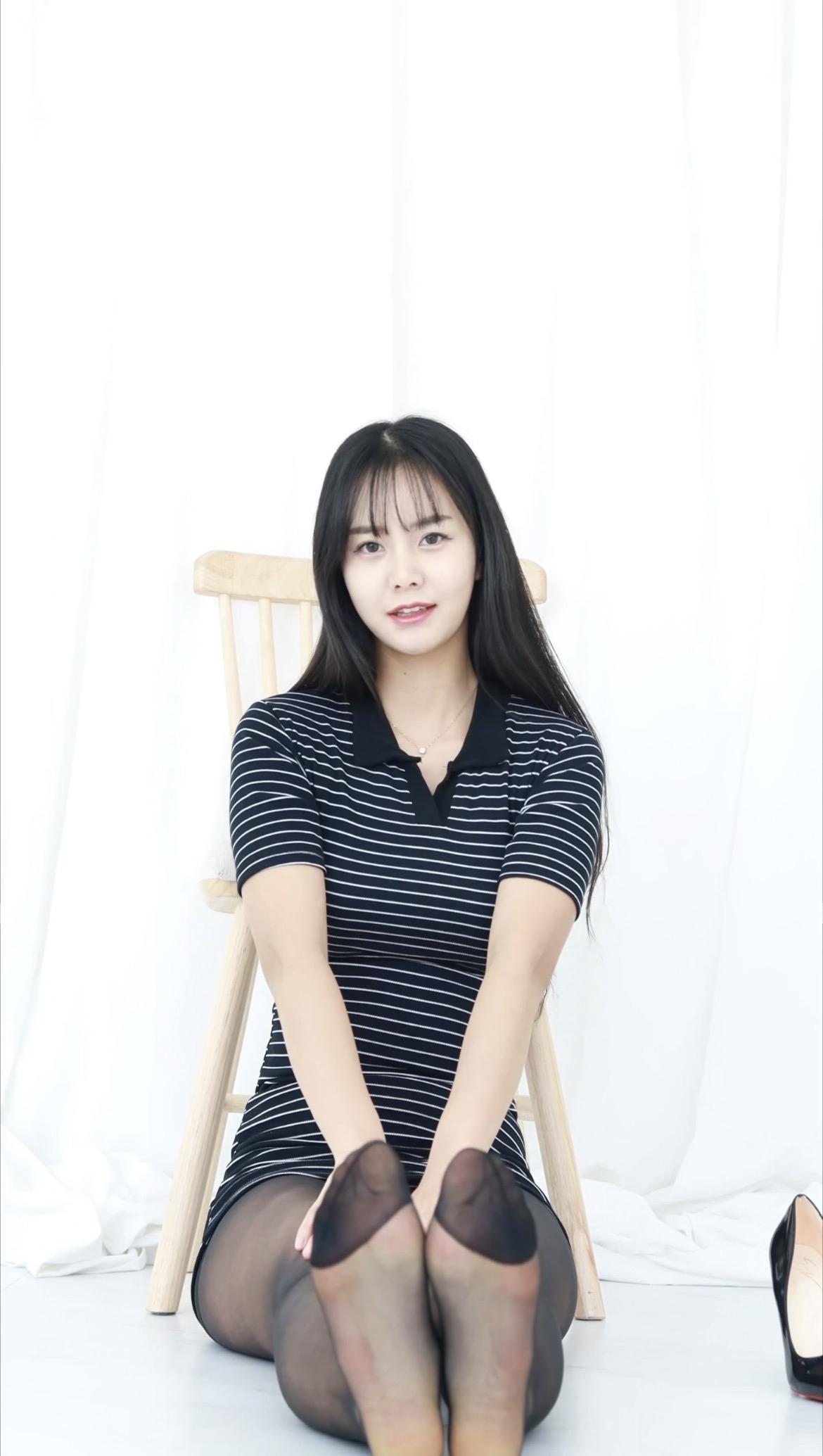 甜美少女风穿搭,黑白条纹连衣裙搭配黑色丝袜,简约优雅。