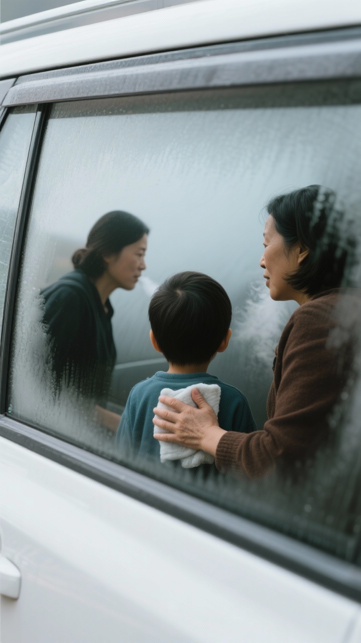 车标反光里的半张脸 / 手指抚过门板接缝的特写 / 孩子小手按在中控屏上的倒影……