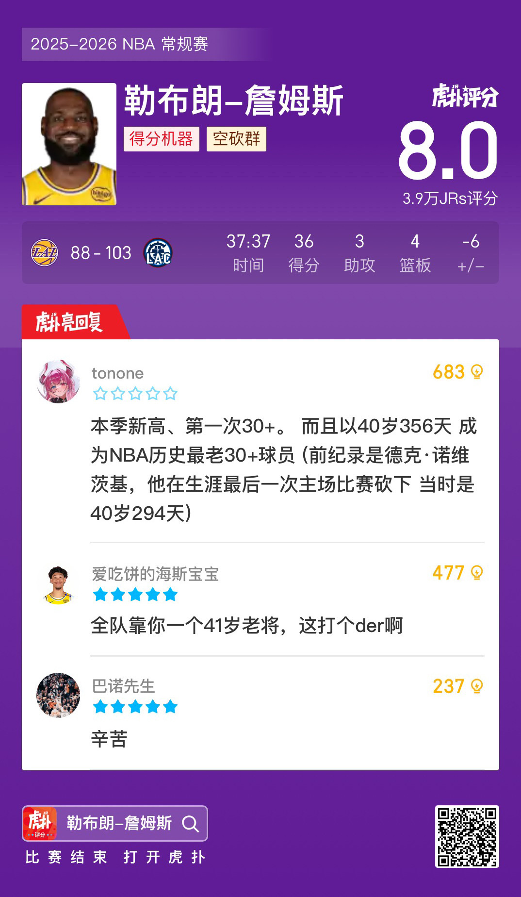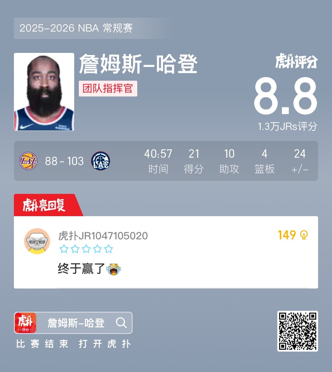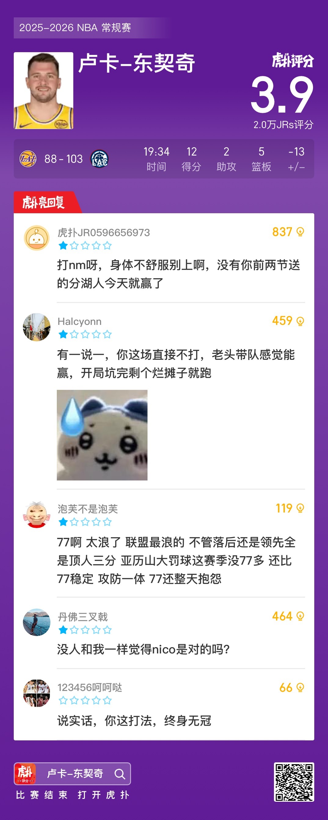 同城送温暖,快船战胜湖人终结5连败,避免落至倒数第一 NBA常规赛,快船主场103-88战胜湖人。此役后,快船终结5连败,战绩7胜21负升至西部第十三位,避免落至倒数第一。 湖人vs快船东契奇左腿挫伤快船战胜湖人