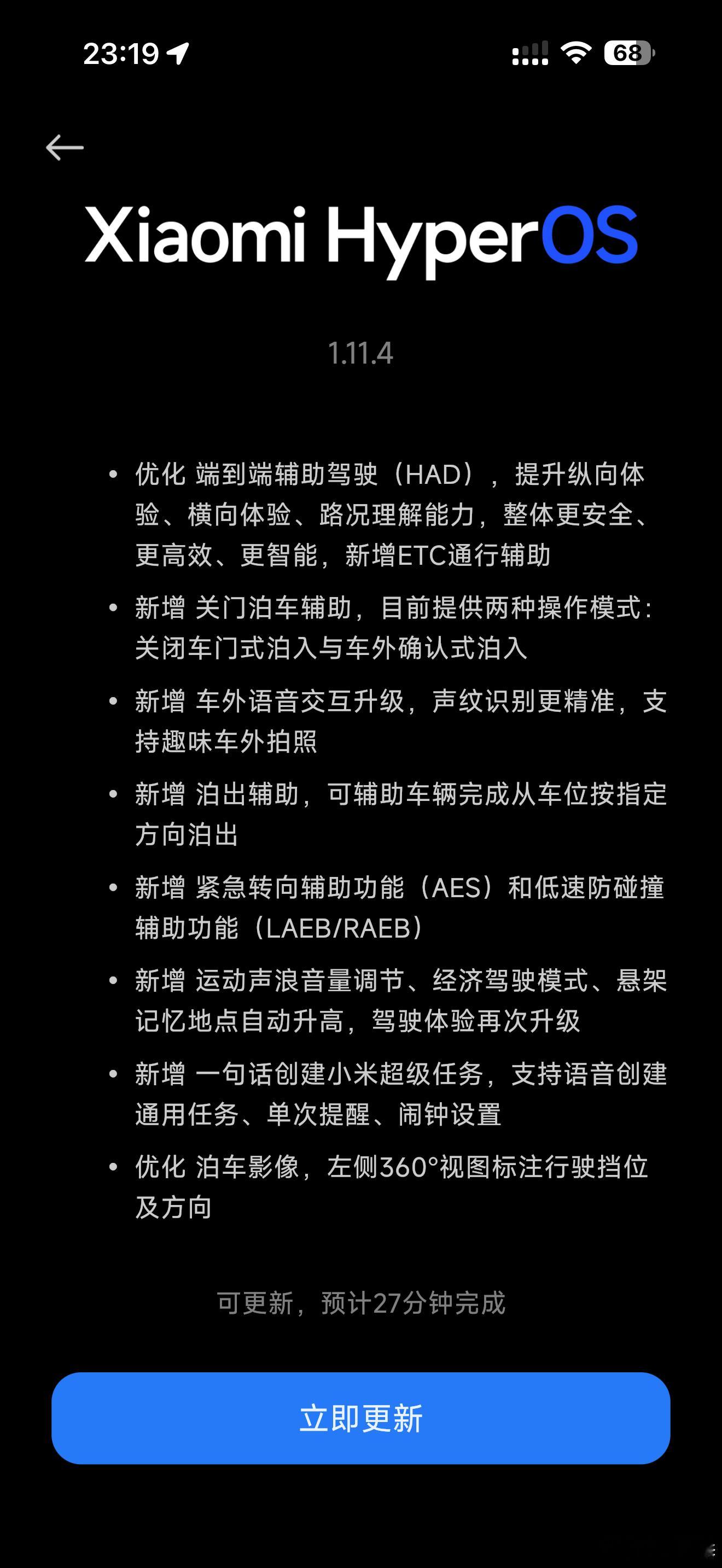 感觉我的车是全世界最后一台还没有收到1.11.0的YU7之前还因为门把手的小bug回店升级了一下系统结果只更新到1.10.2这样一个补丁版本今天晚上突然推送了1.11.4的车机更新看样子细化升级还挺多 上海