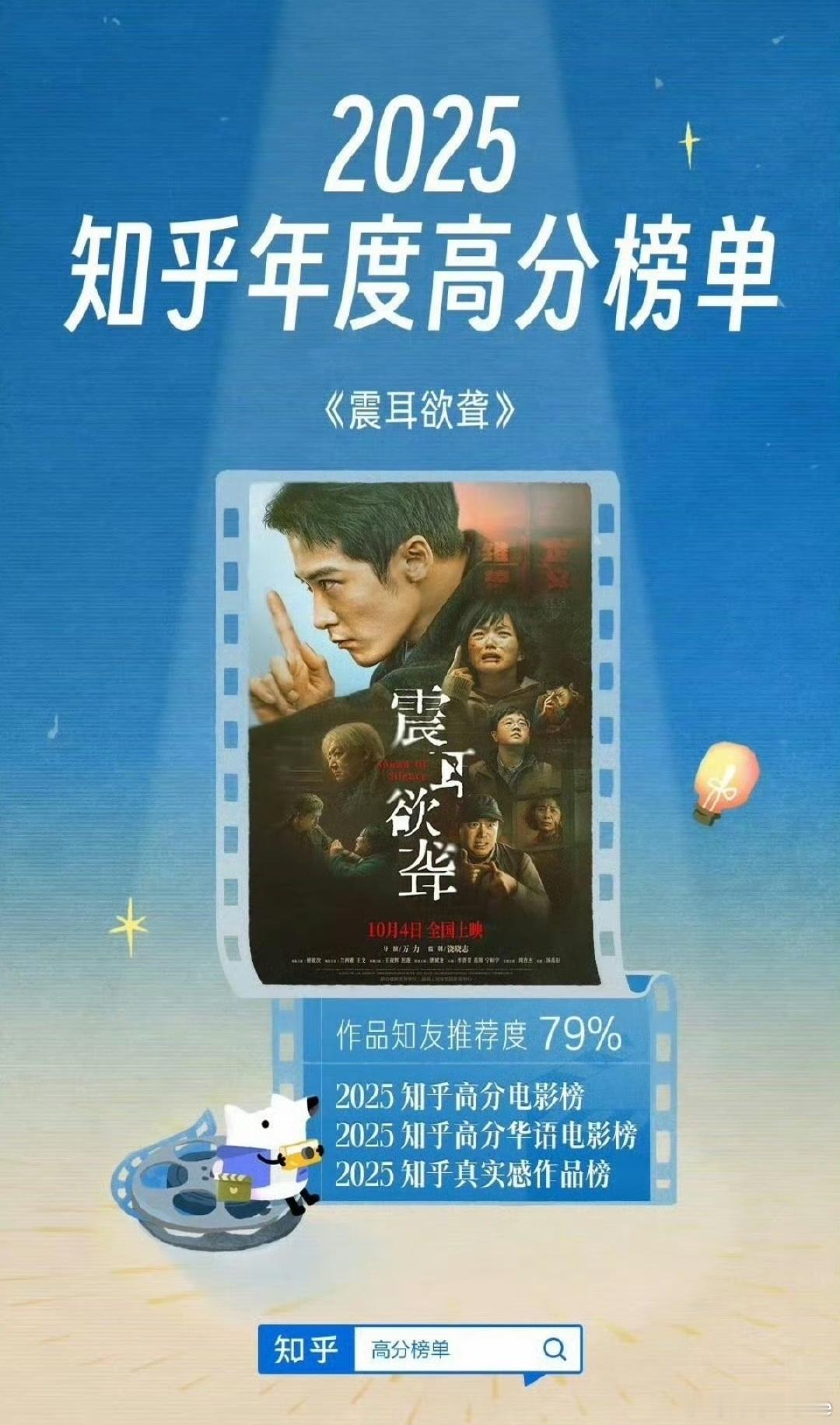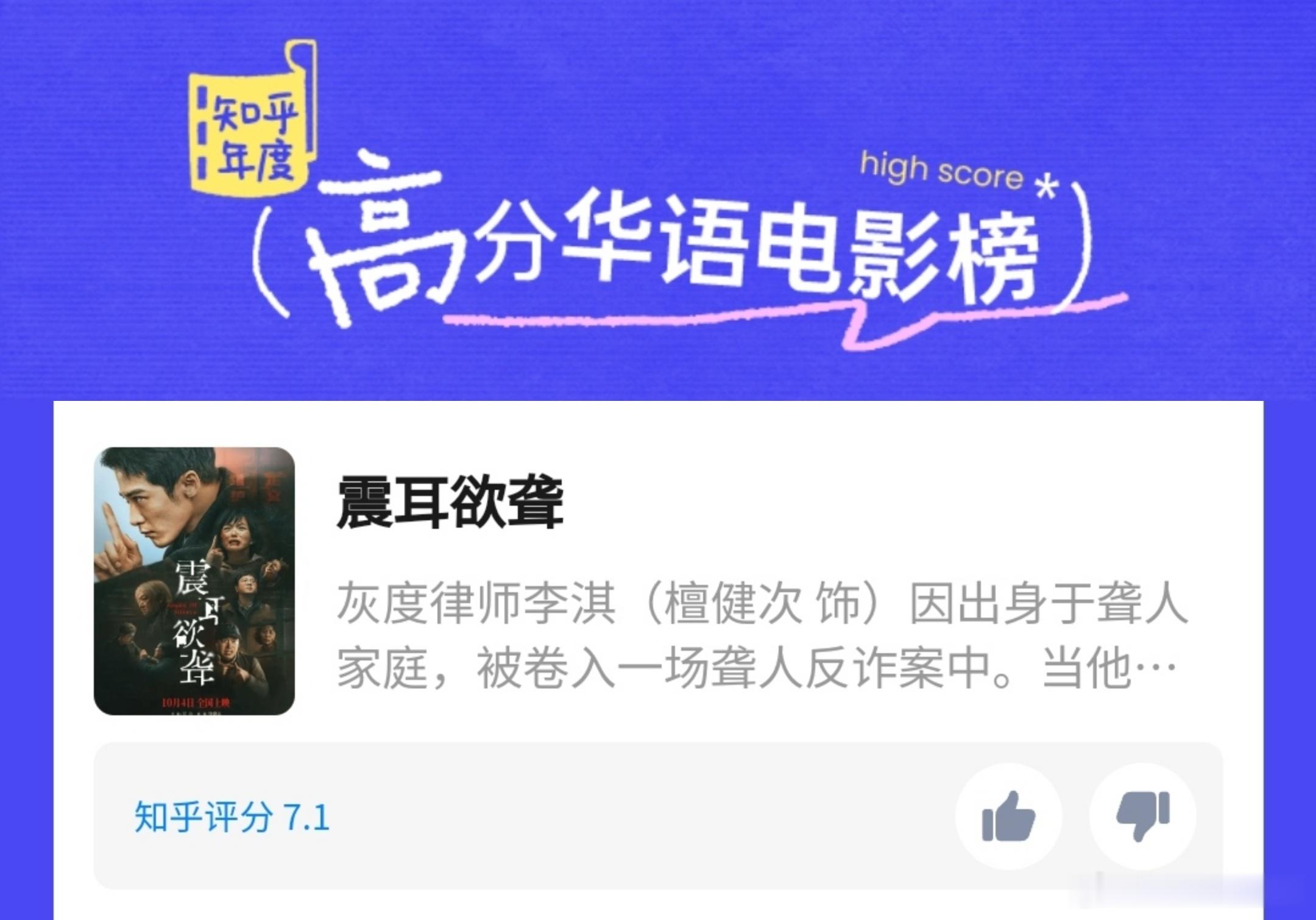 某瓣的年度高分华语电影榜单里只有八部影片,檀健次的《震耳欲聋》没有入围,但在知乎