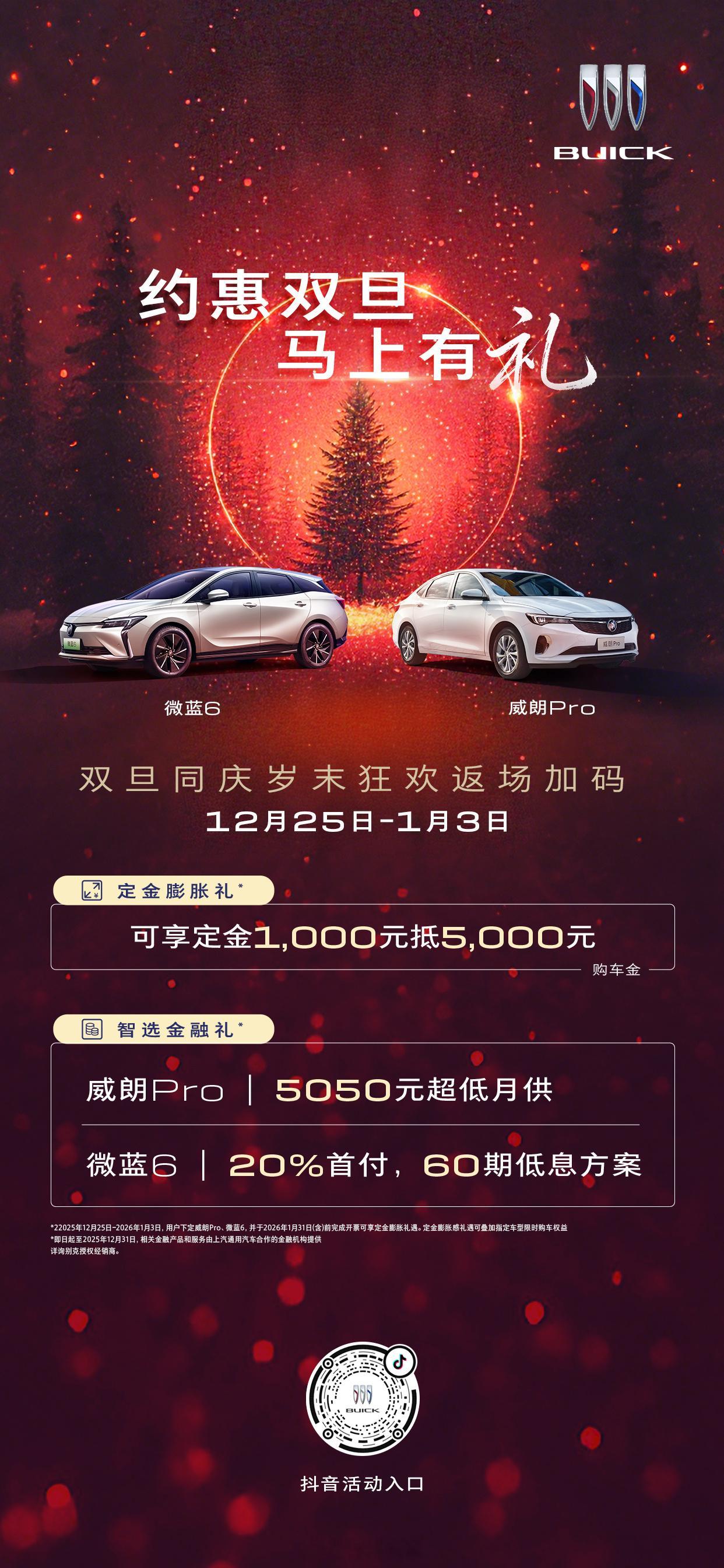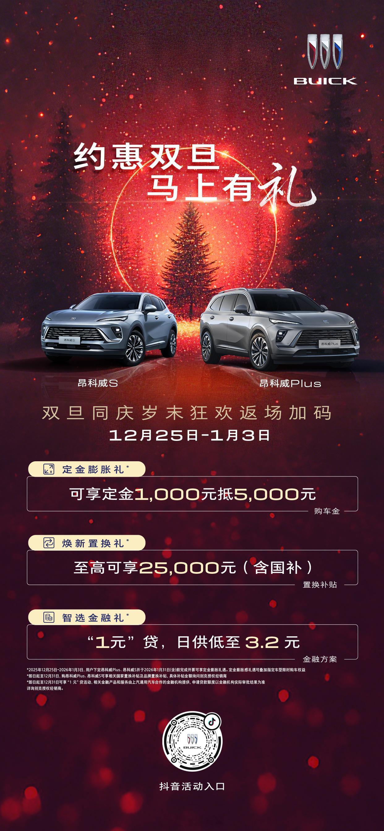 今日,别克开启“约惠双旦 马上有礼”跨年狂欢盛宴,昂科威Plus、昂科威S、君越、君威、威朗Pro、微蓝6等热销车型联袂上阵,携限时加码的多重礼遇,引爆跨年购车热潮!无论日常通勤、家庭出游,还是享受驾控乐趣,别克跨年专属购车方案,均可助力消费者轻松圆梦心仪座驾,悦享高品质出行,年底买车选别克就对了!即日起至2026年1月3日,购买昂科威Plus、君越等车型,可享定金1000元抵至高5000元购车金,并且“一口价”车型还可享受本品/他品置换10000元品牌补贴,并叠加享受至高15000元国补。昂科威Plus君越约惠双旦马上有礼