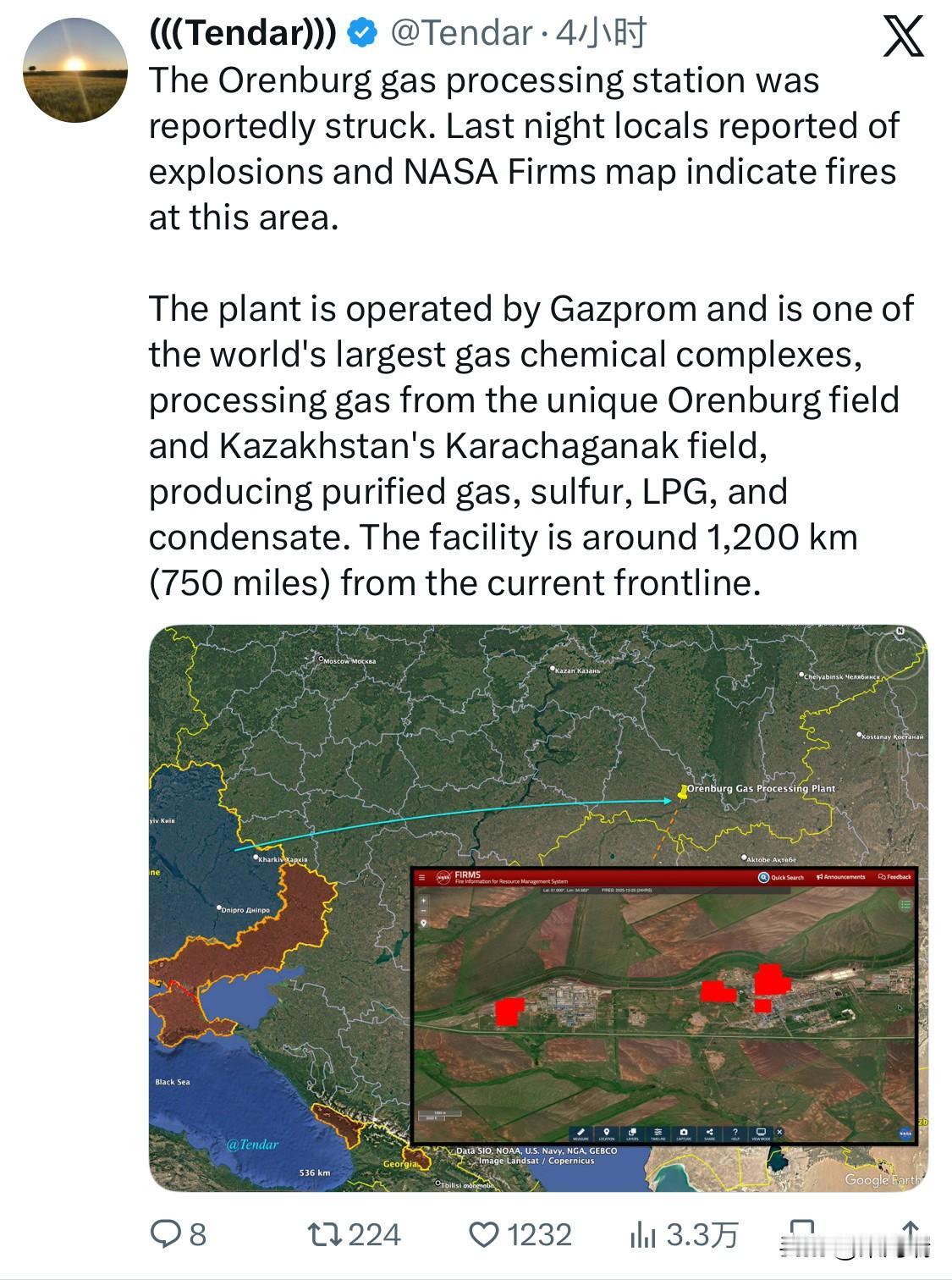 根据2025年12月25日的最新报道,乌克兰无人机在12月24日夜间至25日凌晨再次袭击了俄罗斯奥伦堡(Orenburg)天然气处理厂。 乌克兰安全局(SBU)消息人士证实,其运营的远程无人机成功击中了该工厂。袭击导致该厂 3U-70单元(负责脱除硫化氢和二氧化碳的净化装置) 的天然气管道起火,该厂的生产工艺流程因此被迫暂停。 证据监测:美国宇航局(NASA)的火灾监测系统 FIRMS 实时记录到了该综合体内的火点。 该工厂由俄罗斯天然气工业股份公司(Gazprom)运营,被认为是世界上规模最大的天然气处理厂之一。它不仅处理俄罗斯本地产出的天然气,还接收并处理来自哈萨克斯坦卡拉恰甘纳克(Karachaganak)油气田的天然气。 奥伦堡地区州长叶夫根尼·索恩采夫(Yevgeny Solntsev)在 Telegram 上表示,该地区一处工业设施遭到无人机袭击,并称基础设施受到了“轻微损坏”。 同步袭击:在同一次行动中,乌克兰无人机还袭击了克拉斯诺达尔边疆区的 捷姆留克港(Temryuk),导致两个燃油储罐起火,过火面积约2,000平方米。
