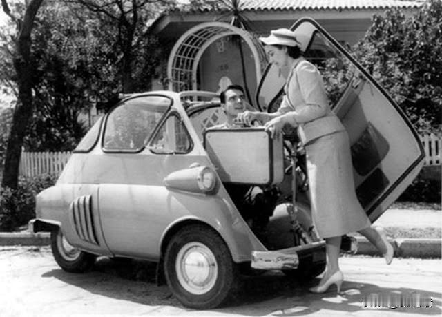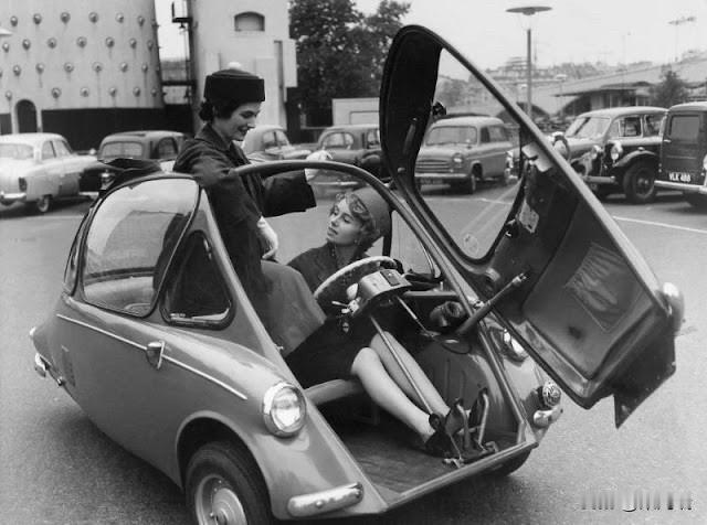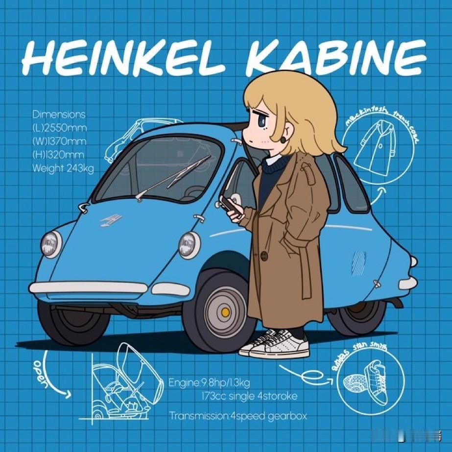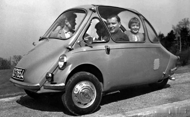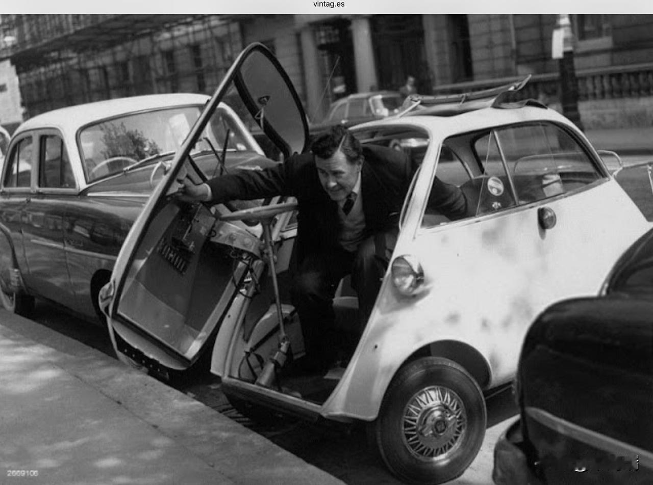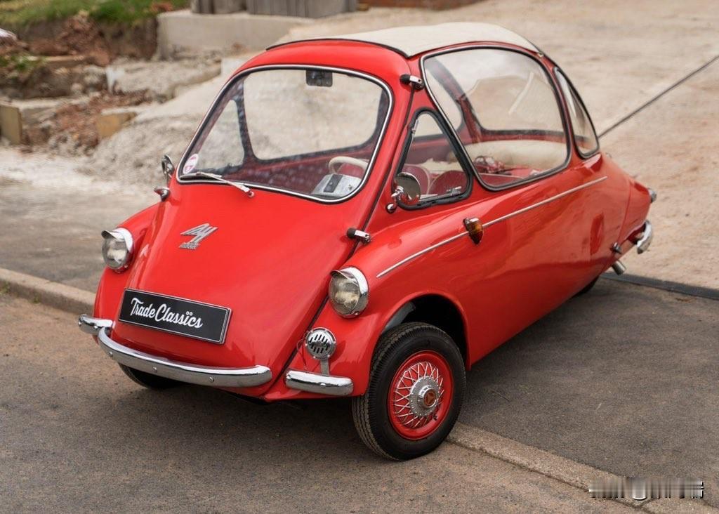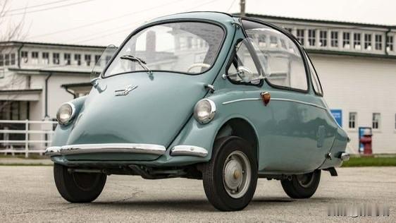 这辆车是亨克尔·卡宾 (Heinkel Kabine)。 德国航空器制造商亨克尔 (Heinkel) 在战后限制生产飞机时制造了这款微型汽车。 昵称: 由于其独特的蛋形车身和泡泡状的车窗,它也被称为“泡泡车” (bubble car)。 特点: 这款车最显著的特点是前开式的车门,方向盘和转向柱会随车门一起打开,方便乘客进出。 它是在二战后物资匮乏的欧洲背景下开发的,以其低廉的价格和燃油效率吸引了买不起传统汽车的人群,在1956年苏伊士危机油价上涨后尤其受欢迎.