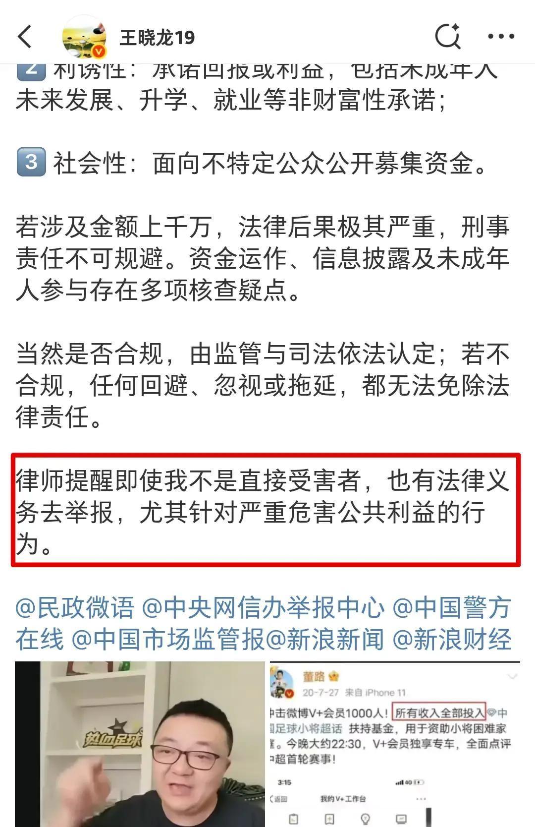 他收你钱搞青训,可能踩了非法红线。 前国脚王晓龙一纸诉状,撕开了足球圈“付费支持”的模糊地带。董路通过微博V+会员募集青训资金,但法律文件显示,个人公开募捐必须持有资质并备案。他的直播间里,这笔钱叫“知识付费”;起诉书里,这笔钱涉嫌“非法集资”。 关键就在这层窗户纸。你付的299元,买的究竟是“足球课程”,还是变相“捐赠凭证”?法律只看实质:如果资金最终流入非营利青训项目,就必须走慈善募捐的合法通道。微博的协议自己写着,禁止用户利用V+从事非法集资。 类似案例已被监管部门约谈整改。这场官司裁定的不是个人恩怨,而是互联网时代“为爱发电”的规则边界。你的每一次付费,都在定义浪潮的方向。 记住,支持青训的正确姿势,不是绕过规则的热情,而是尊重规则的理性。你投出的不是钱,而是一票对未来的选择。