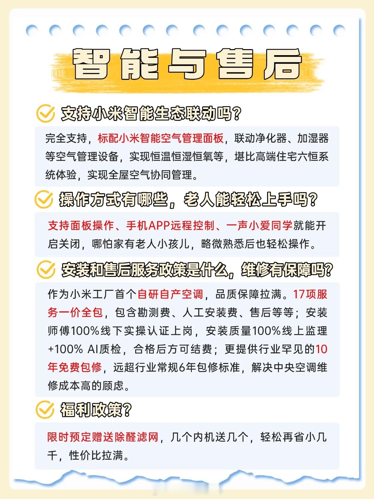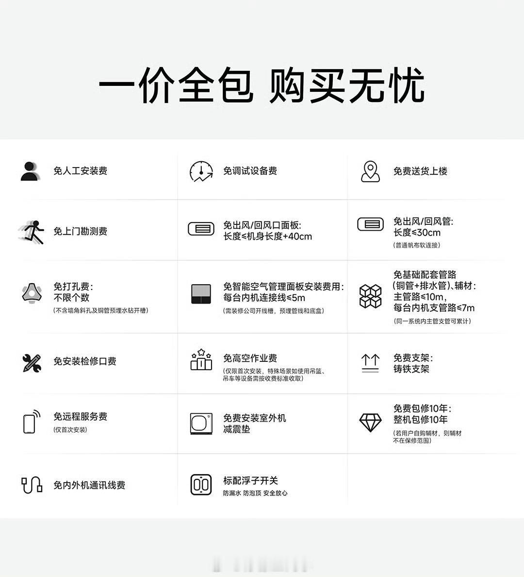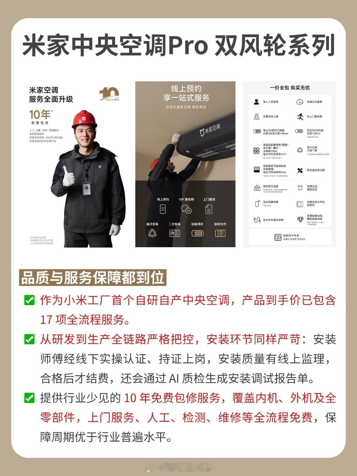 不管是小件3C,还是大件家电,很有安全感的一个保障就是“包修时间”,时间越长也就证明厂商对自己的产品越有自信在今天的小米新品发布会上,小米官宣自家的空调10年免费包修,而且是全系列,今晚发布的米家中央空调Pro双风轮系列更是给力,在用户最关注的安装上,1分钱就能上门勘测,把安装全流程打包解决,而且还给出10年免费包修承诺最近在装修准备安装中央空调的,确实可以多考虑一下米家中央空调10年免费包修小米强调空调10年免费包修