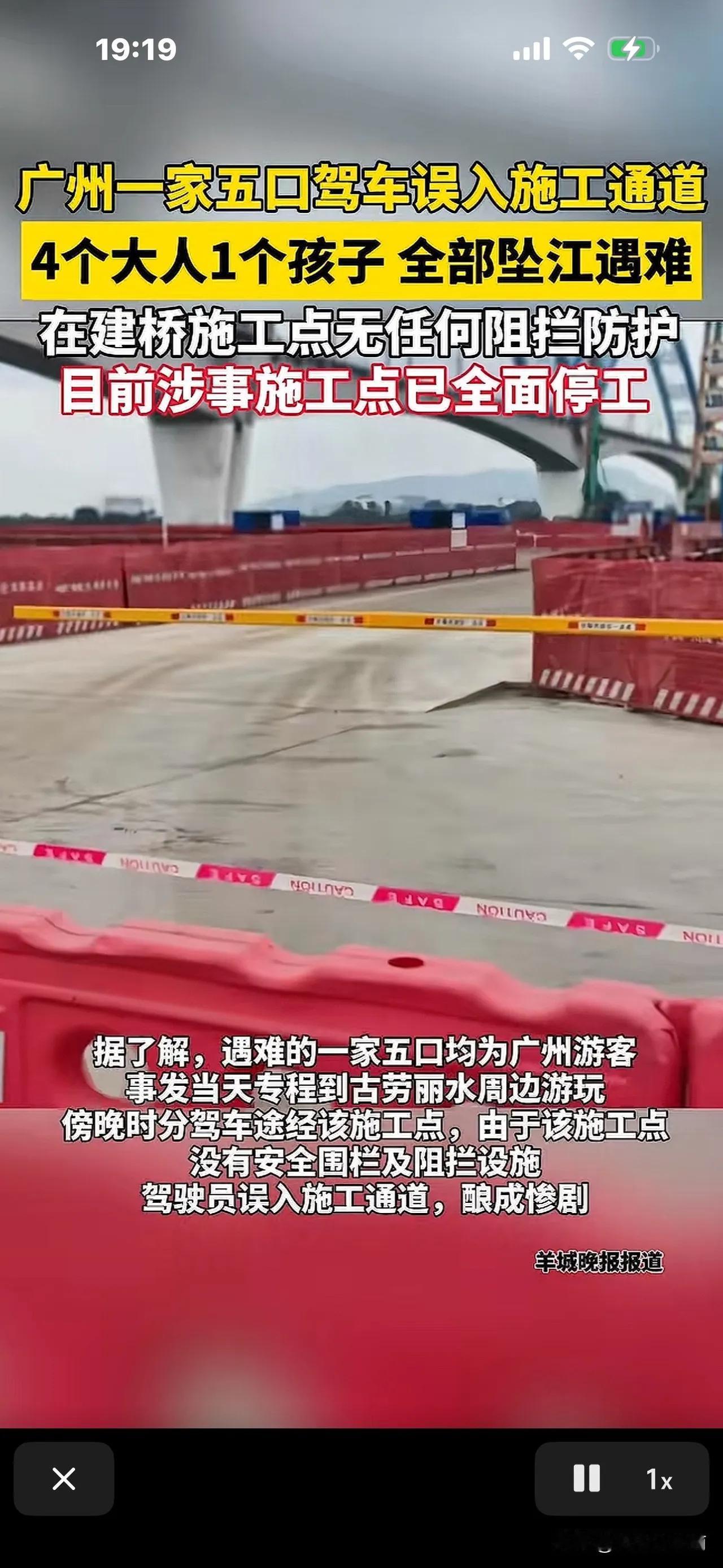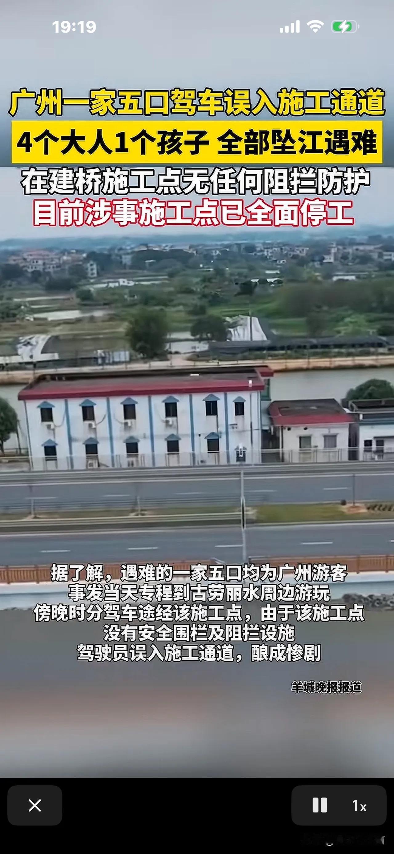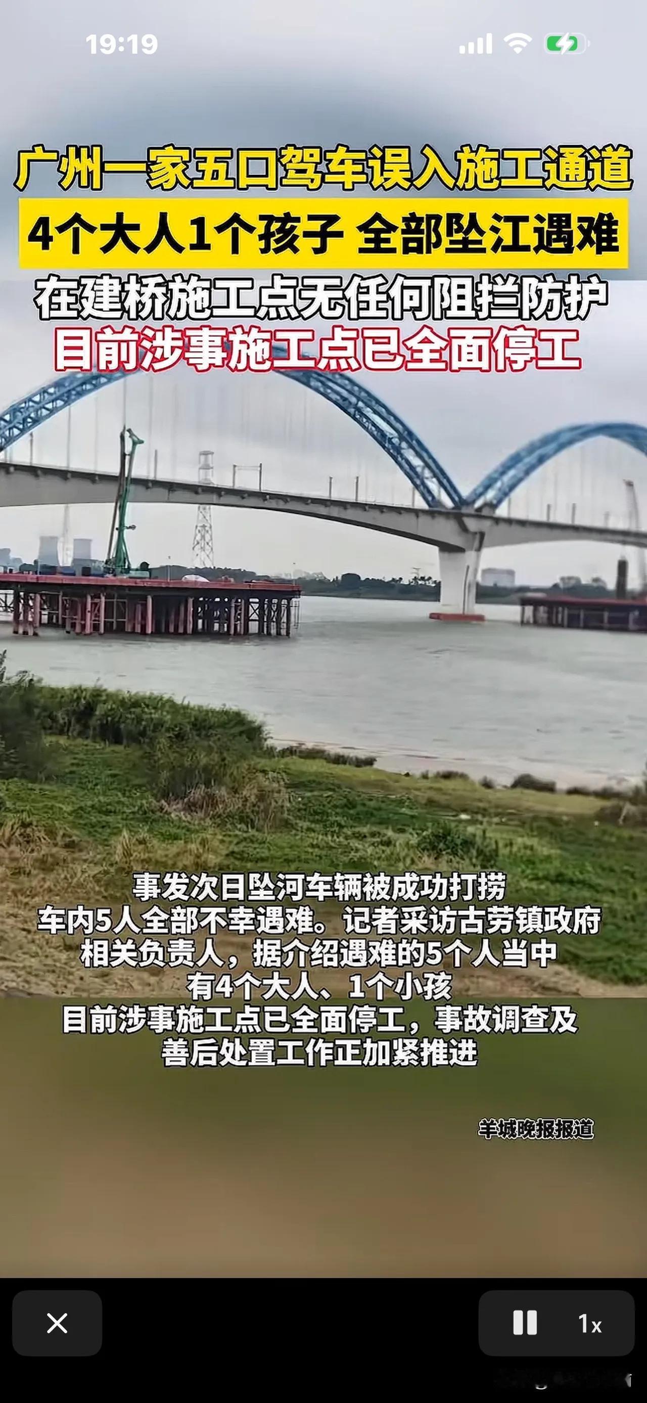 好惨,广州一家5口去旅游,在江门一大桥误驶入一条施工通道,全部坠江身亡! 该施工通道没有任何阻拦防护设施,因为是一条临时通行便道,施工方忽略了在此警示路人或车辆,此条道路不可通行,否则往前就会坠江! 遇难的一家人,有四个大人一个小孩,他们是自驾车从广州到古劳丽水附近游玩,在傍晚的时候误入了施工通道,酿出了这起悲剧! 有网友说: 十年前,我老公驾车带我妈和两位姐姐去爷爷家,我上班,请不到假没去,也误入修桥施工路段,等看清警示牌,慌张错把油门当刹车坠入河里,还好是白天,坠入在桥杶下有些沙,附近村民打坏了车玻璃救了他们出来,车子报废,还好人没什么事,姐姐肋骨骨折,我老公皮外伤。 绝对是自杀的,一眼都看得见那是施工现场,正常人不会开车进去。而且中间有两段还没连起来。 施工队就是修个下水管,都拿彩钢片子栏着呢,这可是修桥啊。难以想象。 施工方只顾赚钱,哪管当地人的安全与否!!!