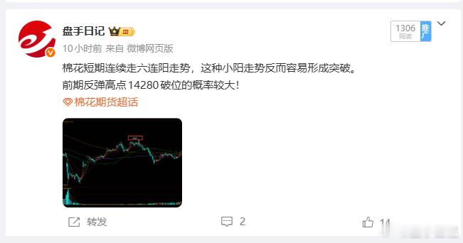 今天下午提示过 棉花出破高点概率较大 晚间棉花冲破14280 最高触及144