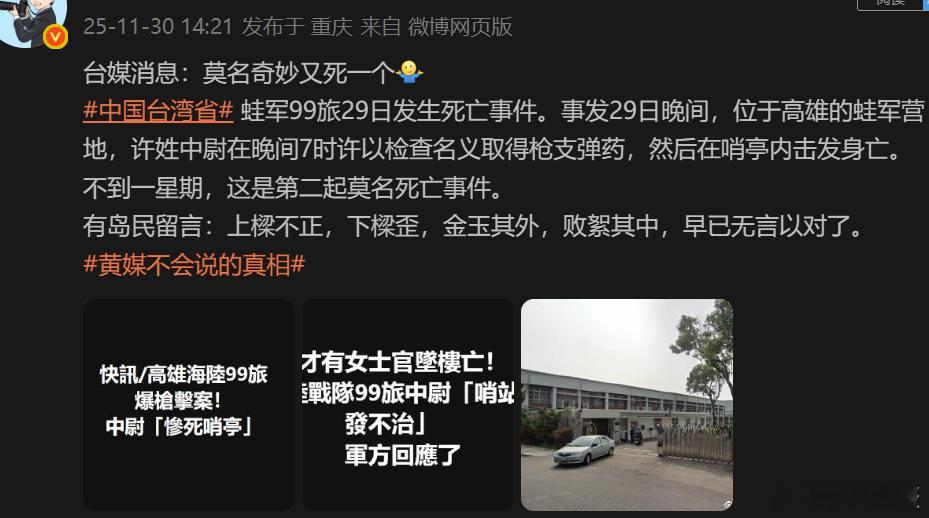 台媒:台北重大袭击案发生后,嫌疑人张文的父母下跪道歉,其哥哥手写信提到,家家有本难念的经,除了家庭教育外,还须面对这险恶的社会,“诸他求学时期的霸凌、军旅生活的霸凌...............”我说怎么隔三差五就有蛙兵莫名死亡的消息,难道霸凌这么严重了吗?按台独的逻辑,是什么把人们逼到这种样子的。中国台湾省黄媒不会说的真相