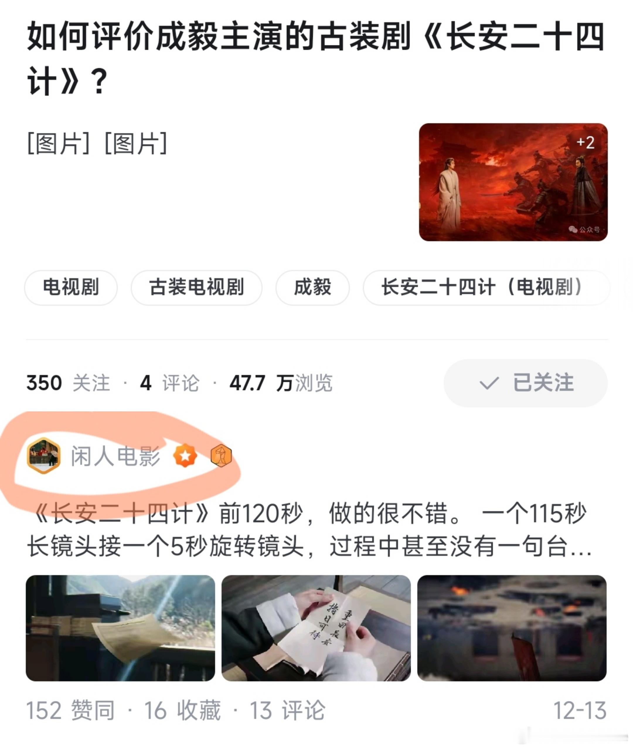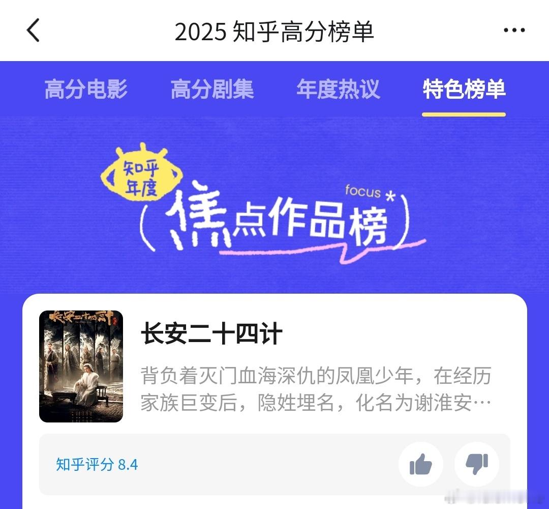 众所周知,知乎一向看不上流量高的演员的作品,要求也很严格,尽管如此,《长安二十四计》依旧拿下84%的评分(知友推荐就是知乎评分),还凭借过硬的质量和成毅的影响力荣登焦点作品榜,当然,我也在其中出了比较大的力,向大家力荐(图三闲人电影就是我)。成毅说方文山写的就是谢淮安长安二十四计跨年电影愿