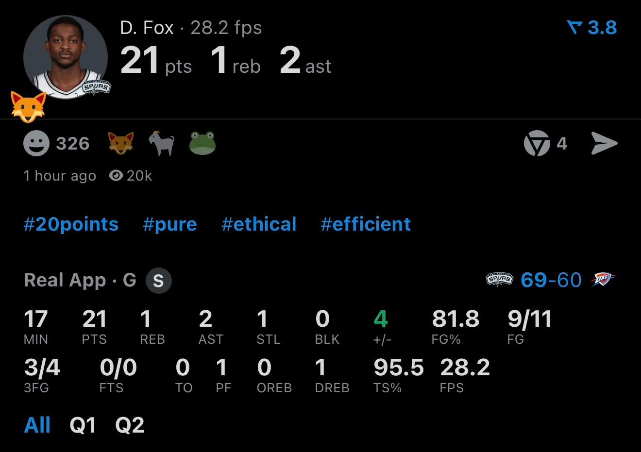 马刺过去6节打雷霆所展现出来的进攻只能用离谱来形容了,今天半场又百回合140+,福克斯11中9,全队非篮下的两分球16中11,极致的进球效率+不失误。真不是雷霆不防,马戴都忍了卡鲁索8中0的三分,希望他在场上能带来防守强度,但雷霆还是挡不住马刺。今天雷霆开场切特+J-Dub先抡,SGA半场输出16分,努力拼前板,除了卡鲁索三分投不进,进攻问题不大,但半场依然落后9分...只能说马刺过于变态了,看看他们下半场手感会不会稍微回落。马刺vs雷霆NBA圣诞大战