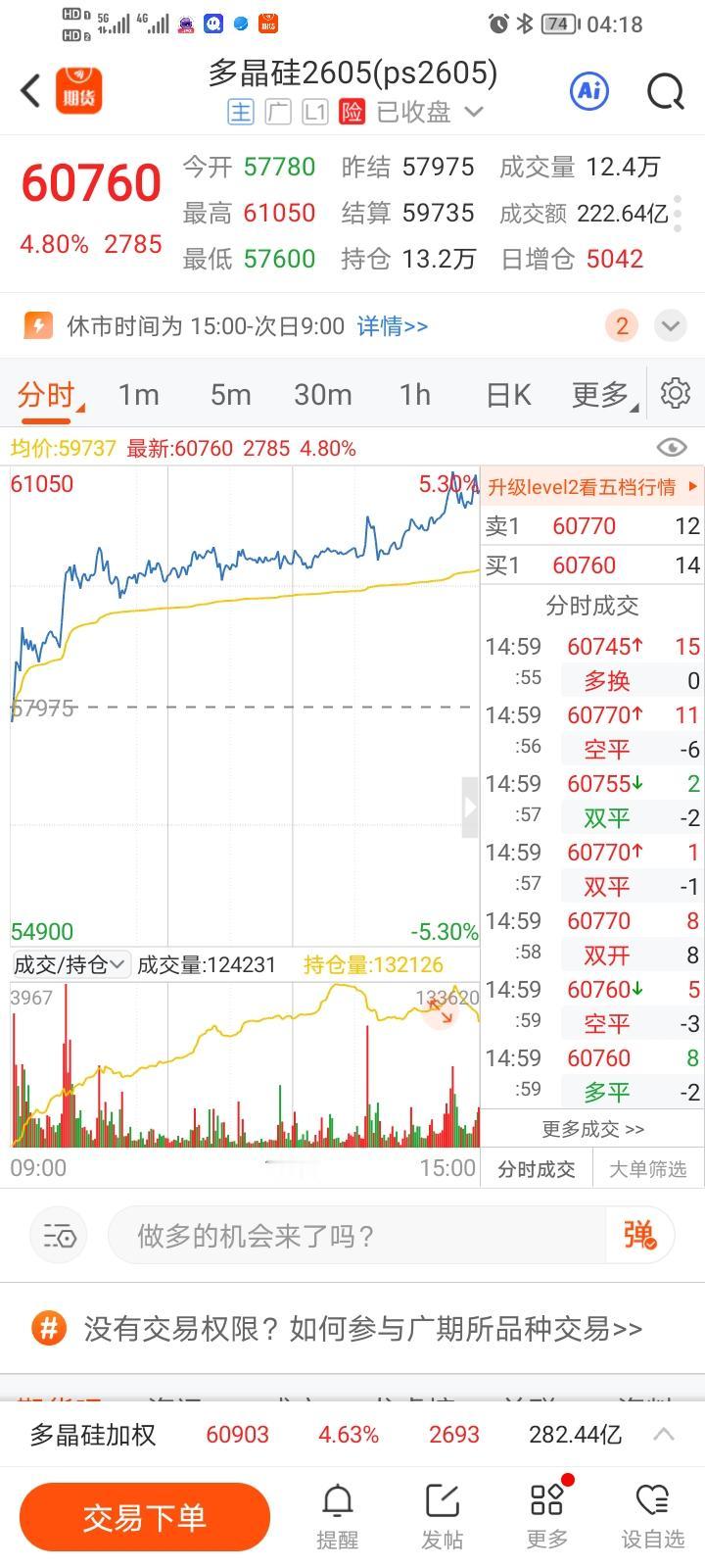 我精准预判了市场,却被规则截断了财路。 此前一段时间,多晶硅价格暴涨,随后在高位盘整。许多散户觉得久盘必跌,便打算做空。而我分析认为强者恒强,于是转而做多。谁料到昨天下单时,我才发现自己被交易所的5手下单限制给拦住了。散户没那么多资金一下子买5手,也不敢下重注。 这5手下单限制拯救了不少看空的散户,却也挡住了我这种看多散户的财路。今日多晶硅就涨了4.8%,看多的散户只能干瞪眼,真是欲哭无泪啊。