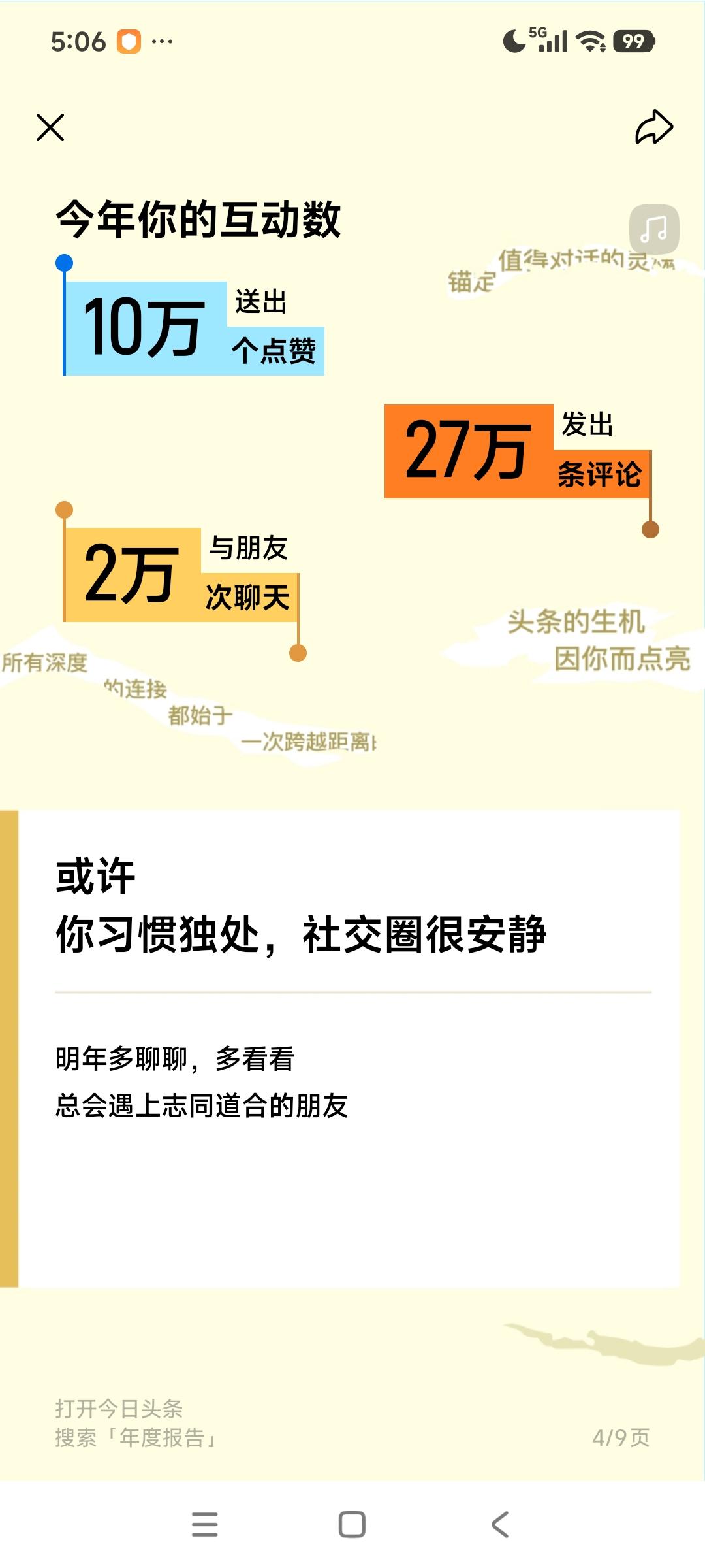 重磅上线!我的年度鉴定结果是“狂热汽车科技的点赞收割机”,你的结果又是什么?快来一起解锁专属年度报告! 头条年报显示我喜欢独处,社交圈很安静。是的,这就是我本人的性格所致,无论在工作中还是生活中我都喜欢独处,不喜欢扎堆,更不喜欢家长里短的聊天,宁愿有时间看书写字!