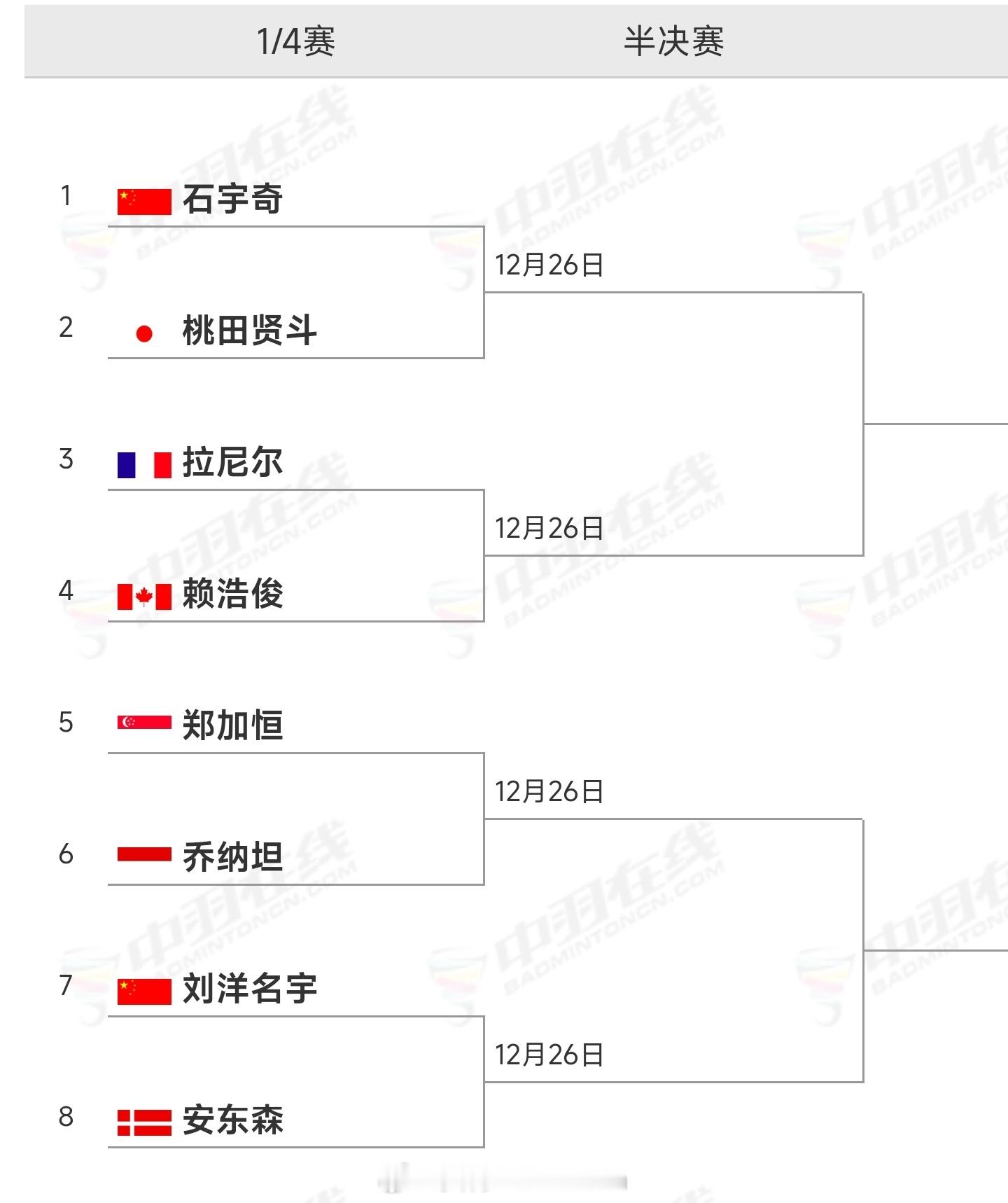 2025年天王杯首日赛程(18:30开赛)|签表出炉❶拉尼尔🇫🇷 vs 赖浩俊🇨🇦❷乔纳坦🇮🇩 vs 郑加恒🇸🇬❸刘洋名宇🇨🇳 vs 安东森🇩🇰❹石宇奇🇨🇳 vs 桃田贤斗🇯🇵2025年天王杯国际羽毛球公开赛天王杯石宇奇vs桃田贤斗