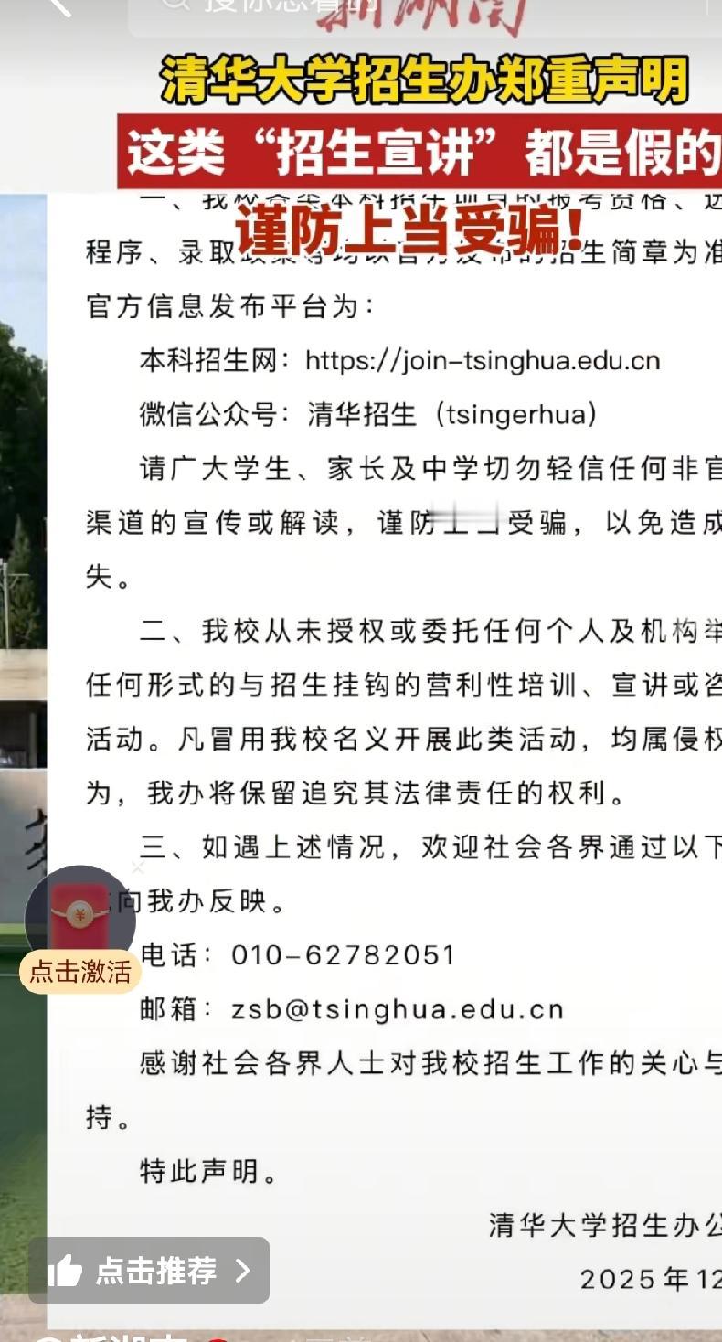 清华大学招生办重要提醒!最近不少中学和学生家长反映,有机构和个人假冒清华的名义,开展招生宣讲活动,还传播不实的招生政策。学校郑重声明:所有招生信息都要以学校官网和官方微信发布的信息为准,绝对没有授权任何机构开展收费培训活动。 这些骗子又把主意打到高考学生身上了!违法人员借着名牌大学的名义骗取钱财,不仅让学生和家长产生误解,还破坏了正常的招生秩序。这次清华直接采取行动,公开了举报电话和邮箱地址,就是要打掉这些骗子的歪心思。 每年高考升学季,总会有人想趁机占便宜。家长们盼着孩子能考上好大学的心情特别迫切,就容易着急忙慌地想找捷径。记住啊,世上哪有不劳而获的好事,名牌大学招生都有固定的正规流程。要是遇到说能花钱保证录取的培训班,直接去举报就对了! 你身边有没有遇到过这种打着名校旗号的骗局?遇到时你是怎么处理的?来评论区聊聊吧! -search.byteimg.com/img/labis/e2334c26f76302d423c7c9fcc380730d~480x480.JPEG清华大学 清华 清华骗局 清华大学学堂 清华招生新政策 最强清华大学 清华大学出国率