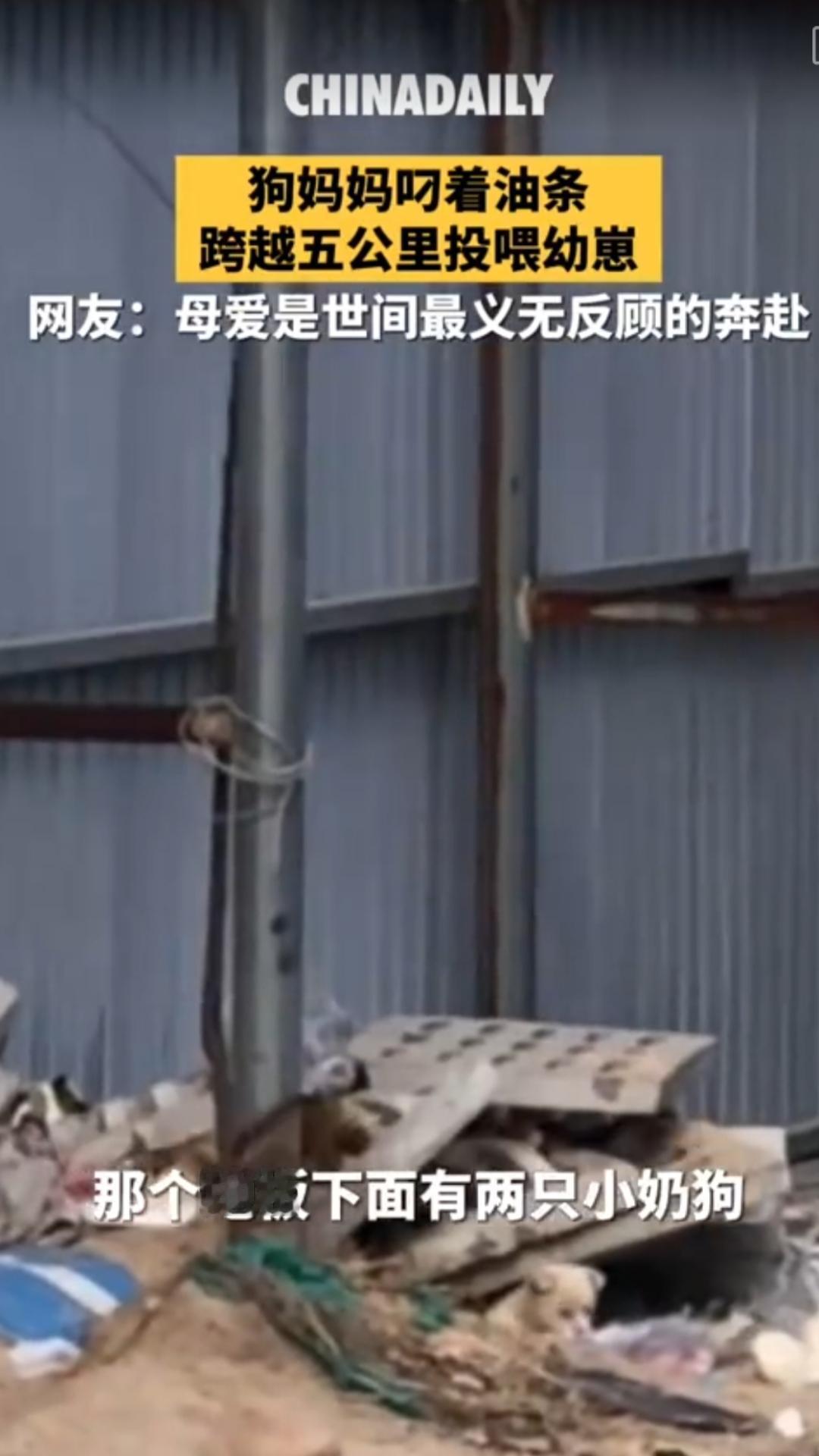 狗妈妈好拼啊 近日,山东一只骨瘦嶙峋的狗妈妈被目击者发现叼着油条穿越5公里,最后将食物喂给两只幼崽。 狗妈妈虽遭人遗弃,成为流浪狗。为了幼崽,这狗也真是拼了,一天要跑十公里为小狗觅食,动物的母爱也好伟大!