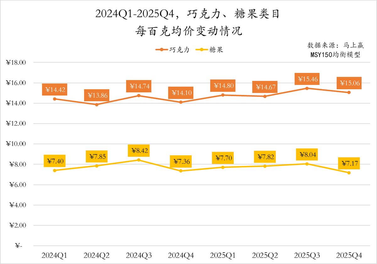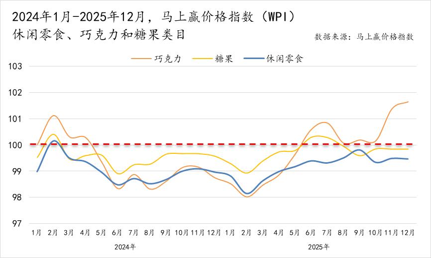 从两个类目的情况来看,巧克力类目在2024年上半年,以及2025年下半年表现好于类目整体,尤其是2025年Q4,指数到达了接近102,价格水平有明显的回升;糖果则是在2024下半年、2025上半年好于休闲零食类目整体,但在2025年下半年其表现不如巧克力类目强劲,维持在100上下浮动。
