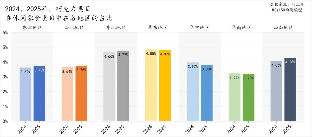分地区来看,巧克力类目在华东、华北和西南地区中,在休闲零食类目中的占比高于平均水平,且2025年的占比同比2024年还有增长。相比来说,华南、东北和西北地区的占比则相对较低,其中东北、西北地区2025/2024占比有增长,华中地区、华南地区则是占比有所下滑。
